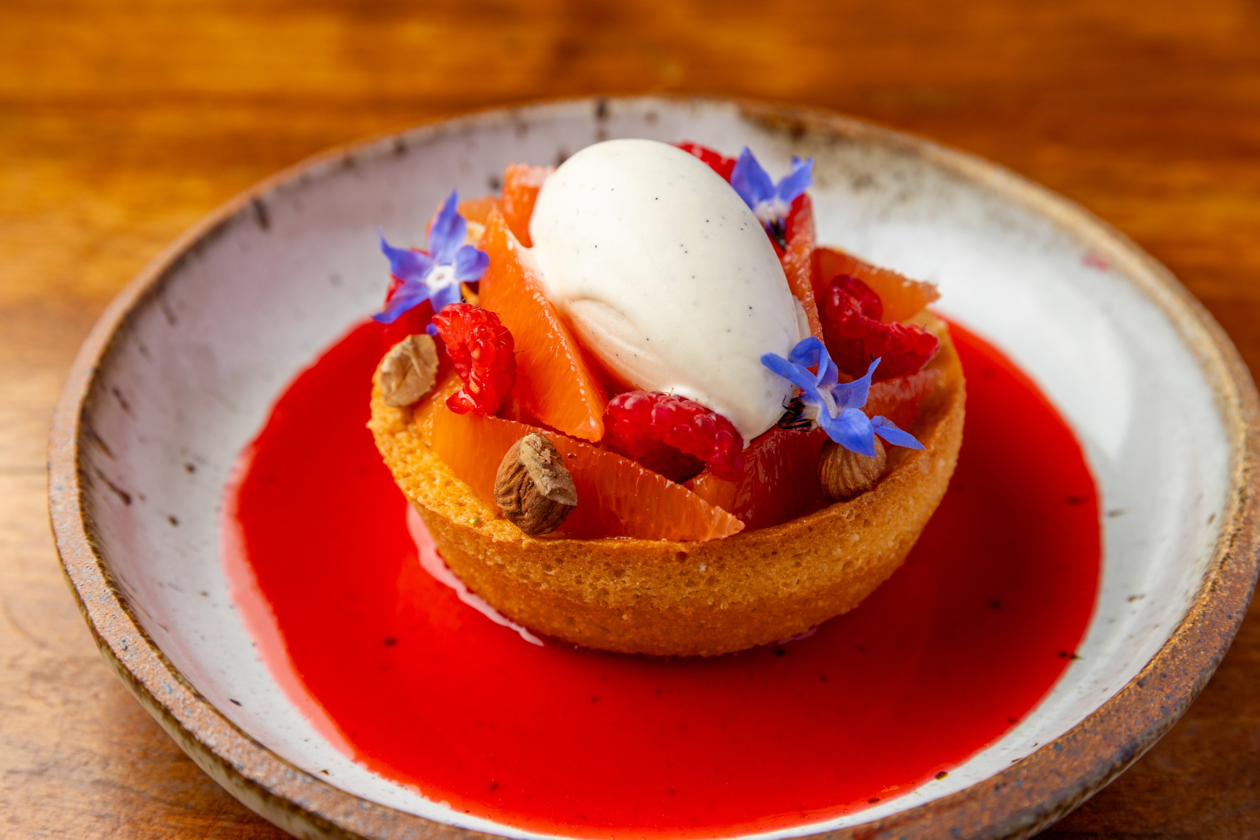 Brown Butter California Almond Cake, Vanilla Ice Cream, Cara Cara Orange, Raspberry