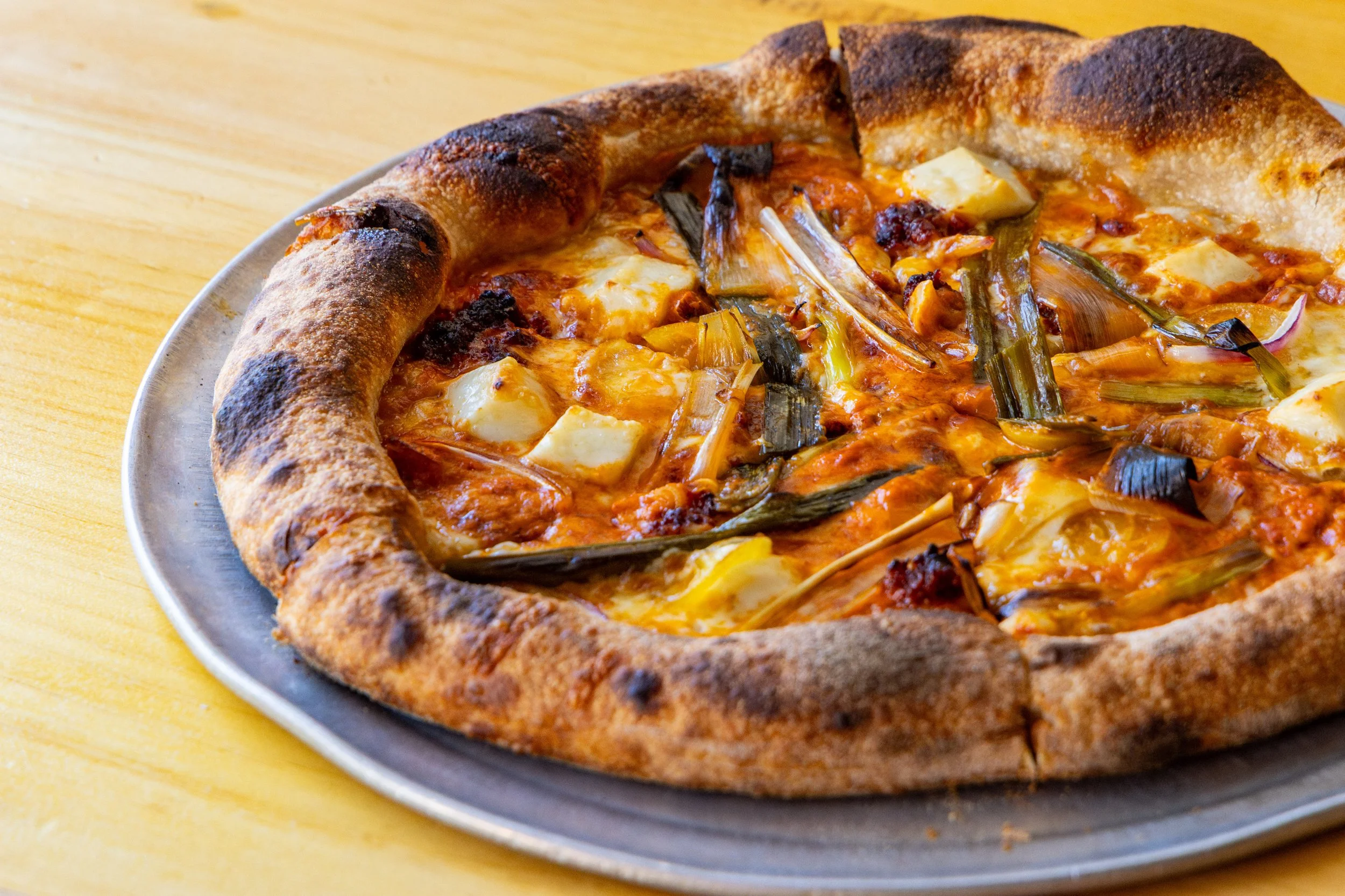 Romesco Pizza: California Almond Romesco, Braised Baby Leeks, ‘Nduja, Pecorino Romano, Garrotxa