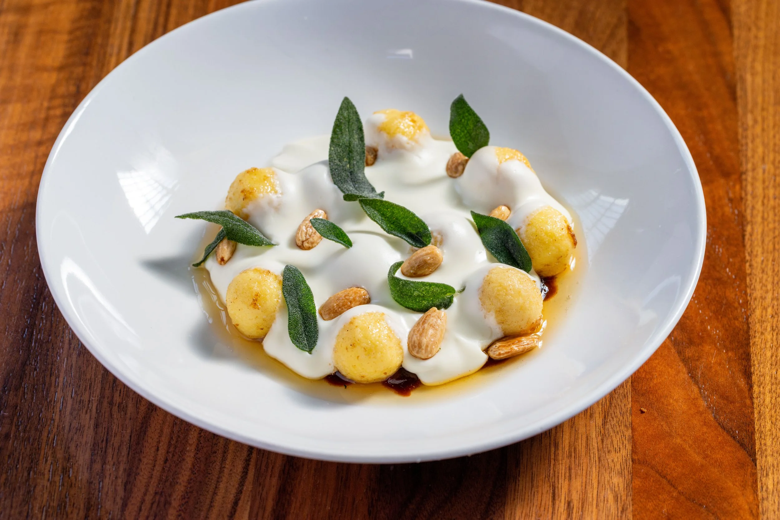 Ricotta Gnudi, Taleggio Fonduta, Spiced Date Purée, Brown Butter California Almonds, Fried Sage