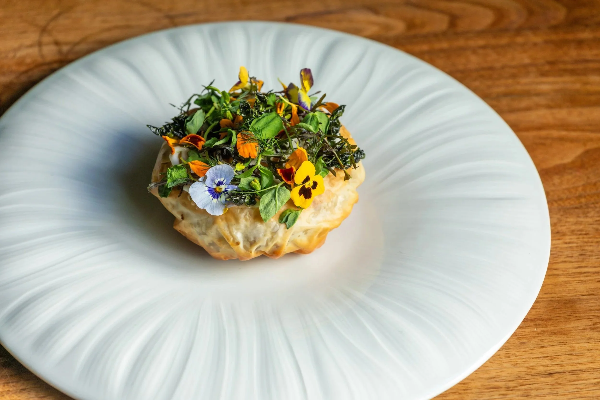 Bisteeya: California Almond Royal Cake, Ras El Hanout-Spiced Chicken, Kale, Phyllo, Edible Flowers, Radish Blossoms, Buckwheat