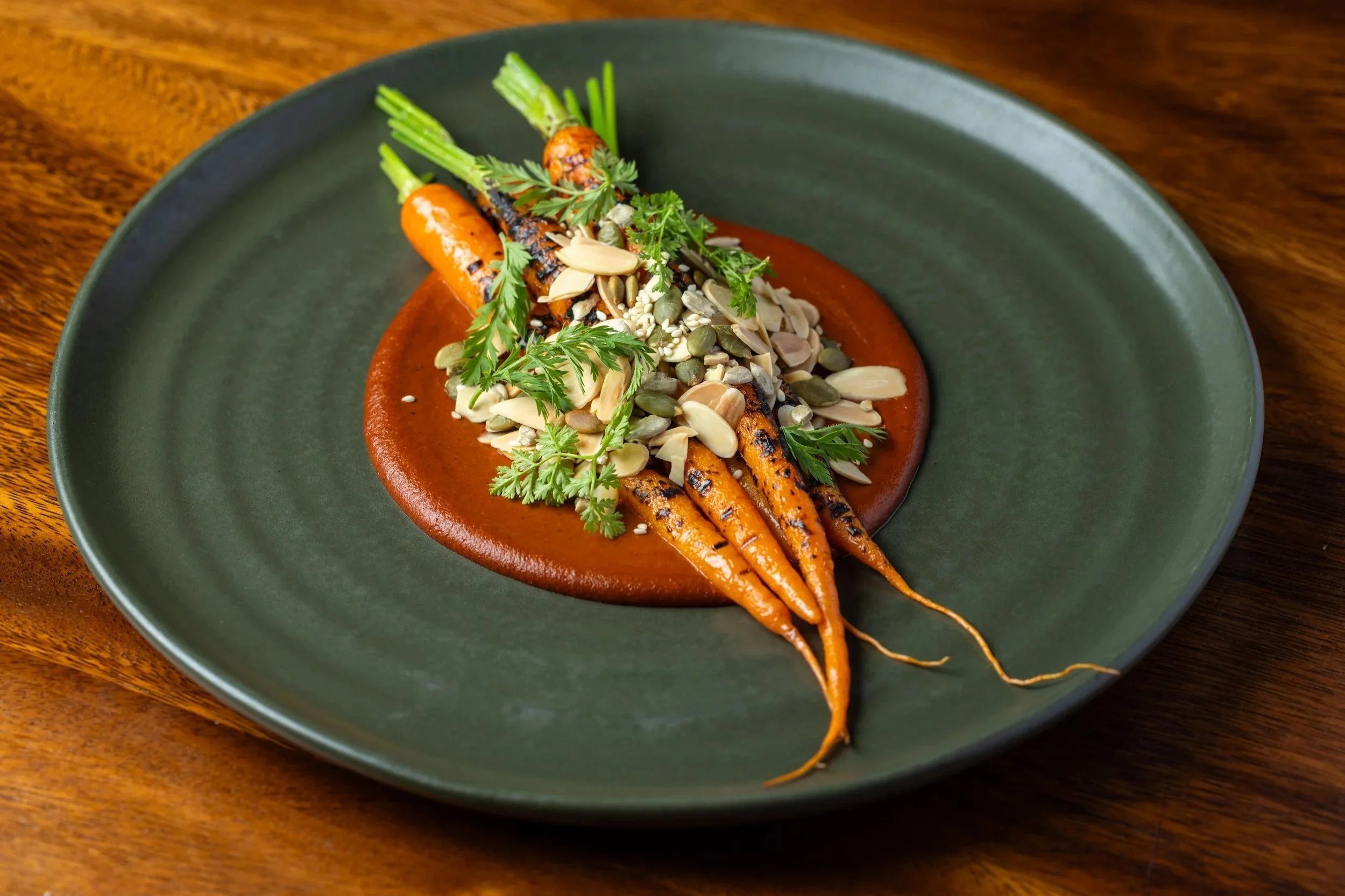 Grilled Carrots, California Almond Mole, Toasted California Almonds, Cilantro, Lime Zest, Smoked Salt