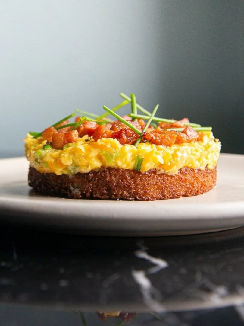 Let’s not kid ourselves — Los Angeles has a lot of things that New York City does not. But one thing L.A. is missing for sure are coffee carts on every block. When Chef Cameron Slough was living in Manhattan, he’d always pick up a bodega-style bacon, egg, and cheese before a long shift at Park Avenue or 11 Madison Park. But his morning ritual was broken once he moved to L.A. Now as the executive ched of The Attic, he incorporated his B.E.C. fix into the menu. Slaugh swaps out the hard roll for potatoes that are fried, pressed, cut into rounds, and fried again. Using a ring mold, he cleanly layers the potato with soft-scrambled eggs laced with sharp and aged white cheddar cheese; crispy, chopped bacon; and a sprinkle of scallion greens. All that’s missing is the iconic blue Anthora that reads, “We Are Happy To Serve You.”