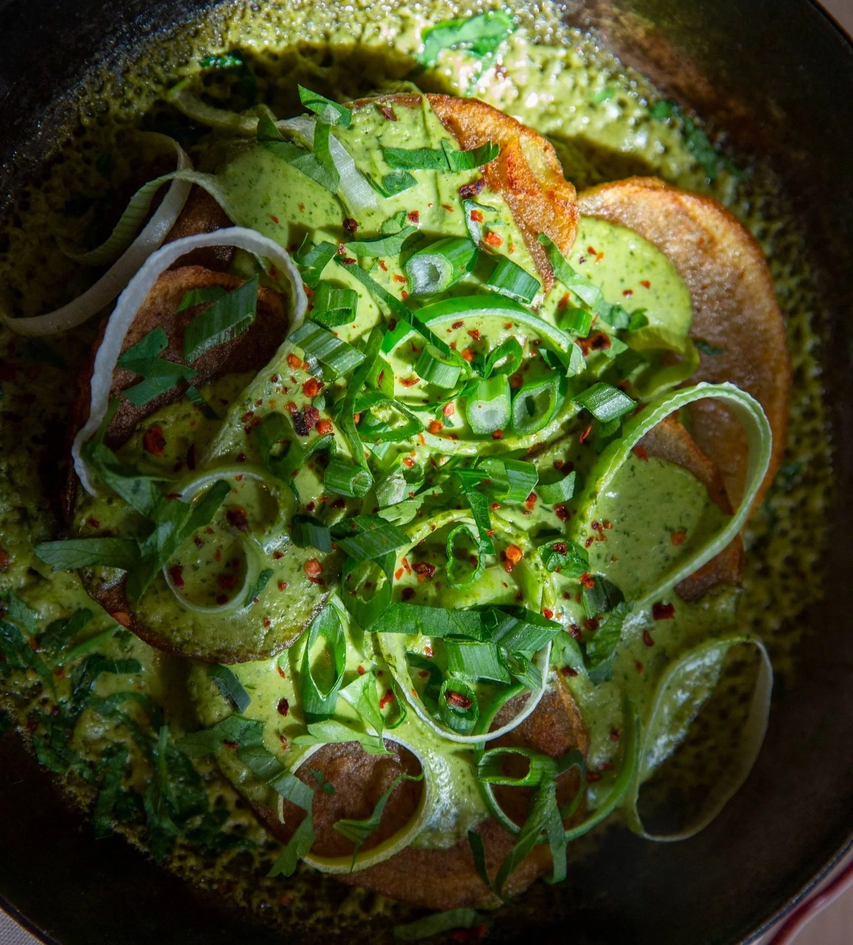 At Safta, Chef Josh Gordon adapts recipes derived from Israel’s vast culinary landscape. “When we start looking for a new dish, it’s definitely something that’s going to be rooted in tradition,” says Gordon. “We try to stay true to the fact that Safta means grandmother. Anything on our menu is homey, but elevated.” For instance, he always serves a seasonally-driven kofta bi tahini—a Lebanese-Palestinian dish traditionally made with baked lamb meatballs smothered in tahini. Gordon makes his winter version with a freshly ground wagyu-black angus hybrid that’s seasoned with a custom madras spice blend from New York spice company, La Boîte. The meat is mixed with ground onions, parsley, and a pullman loaf panade, then shaped into six-ounce patties. After they’re fired in the wood-burning oven, the juicy meatballs are layered with crispy potatoes, seared onions, and raw leeks. The meat and vegetables are smothered in a tangy, creamy herbed tahini that’s packed with dill, cilantro, parsley, garlic, and lemon, and then thrown back into the oven so the sizzling ingredients can meld together. Finished with fresh herbs, the tender kofta sings with addictive brightness.