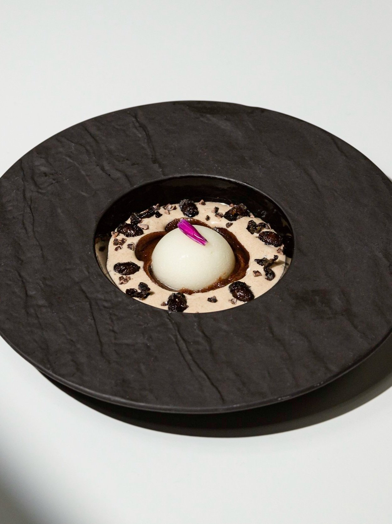 The two dessert courses that cap República’s tasting menu give Pastry Chef Olivia Bartruff room to play with progression and contrast. She often uses the first dish to introduce more familiar flavors, while in the second, she takes the opportunity to play with new techniques and ingredients. For a late winter menu, black beans as staple in Mexican cuisine inspired a sweet and starchy final course. “I just found myself Googling ‘bean candy’,” says Bartruff. What she found was Dulce de Frijol, a dish from Northern Mexico that turns sweetened bean purée into a fudgy bite flavored with cinnamon and orange. In her version, Bartruff wanted to highlight the bean in multiple ways. The first component she kept fairly close to the original, swapping the orange for Meyer lemon for a layer of floral complexity. She also opted for a “more soft texture, like chestnut cream.” Next, Bartruff hoped to utilize the aquafaba from the bean cooking process in a meringue. “I never got the black beans to be a pipeable meringue, but it did make a silky sabayon-like fluff.” The trick was to cook the beans twice, and let the aquafaba sit overnight to extract the maximum amount of protein and starch. It’s then vigorously whipped with maple syrup, sugar, salt, cardamom, and black pepper. To expand on the flavors, Bartruff added crispy fried black beans tossed in cardamom sugar, a scoop of Meyer lemon sorbet, and cocoa nibs for extra crunch. “For a ten course menu, you have to give flavors and visuals the guest has never had before. You want the last course to be something that stays with them.”