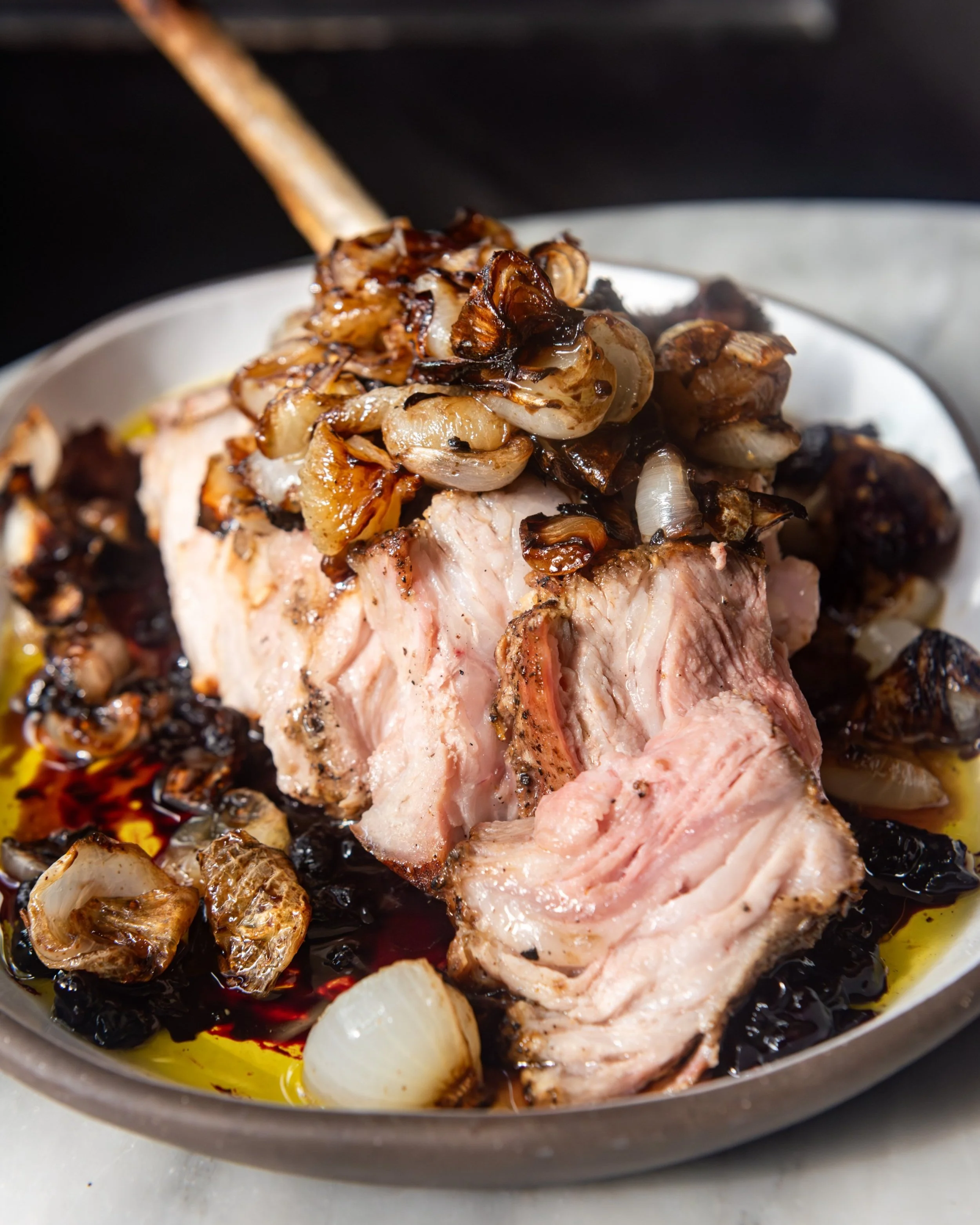 Chef Viktoriya Campos knows that simplicity, nostalgia, and a little bit of the unexpected can bring overlooked products to life. At Felix Trattoria, Campos decided pork was due for its moment in the spotlight. She turned to the farmers market for inspiration and was delighted to come across cipollini onions. “People don't want to use cipollini onions,” says Campos, “but there is a reward when you peel them: they are so sweet, like candy.” She also wanted to bring something a little more personal to the dish as well, which led her to black currants. “In Russia, black currants are everywhere; on the street [and] on the roadside,” says Campos, who grew up gathering the fruit off of bushes, eating them with dumplings, and drinking black currant tea and soda. For the dish, she sears and chars a pork chop on the grill before moving it to the top shelf to cook for around 45 minutes. She submerges the cipollini onions in water and peels them by hand. The onions are roasted in the pizza oven, added to the pan with the pork chop, and drizzled in balsamic vinegar. Returning to the flavors of her youth, Campos freezes fresh black currants, so they retain their water content, before cooking them down into a sticky, sweet, and tart jam that shines alongside the onions and the pork. “I was very happy to find fresh [black currants] and put a piece of me on the plate,” she says, “I'm just proud that people love it.”