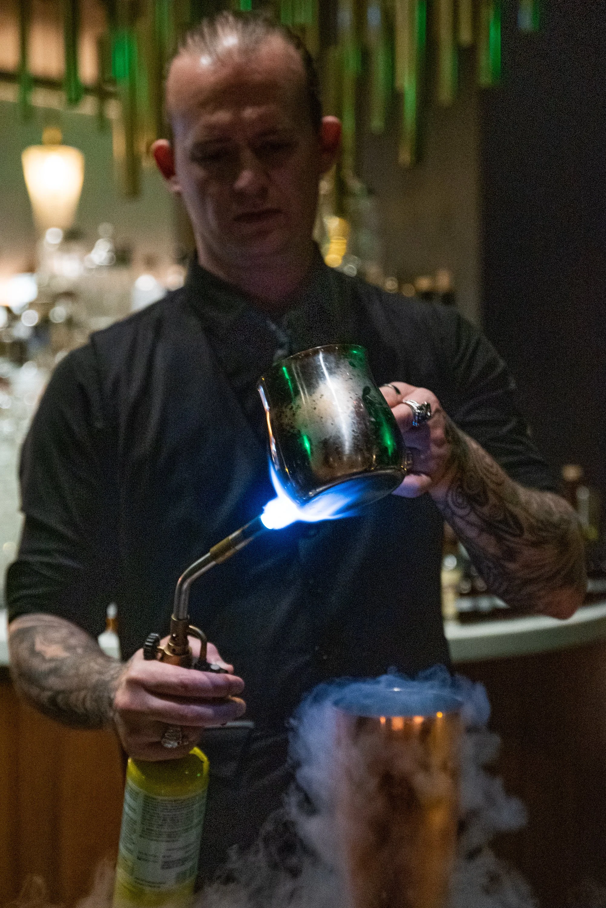 Dietrich takes out a blowtorch. He gently applies it to the kettle until the mixture boils. He ignites the cocktail, shooting it aflame. The passionfruit and lemon caramelizes, developing a much richer, darker flavor profile. Hold your ooo’s and aahh’s, we’re not done yet.