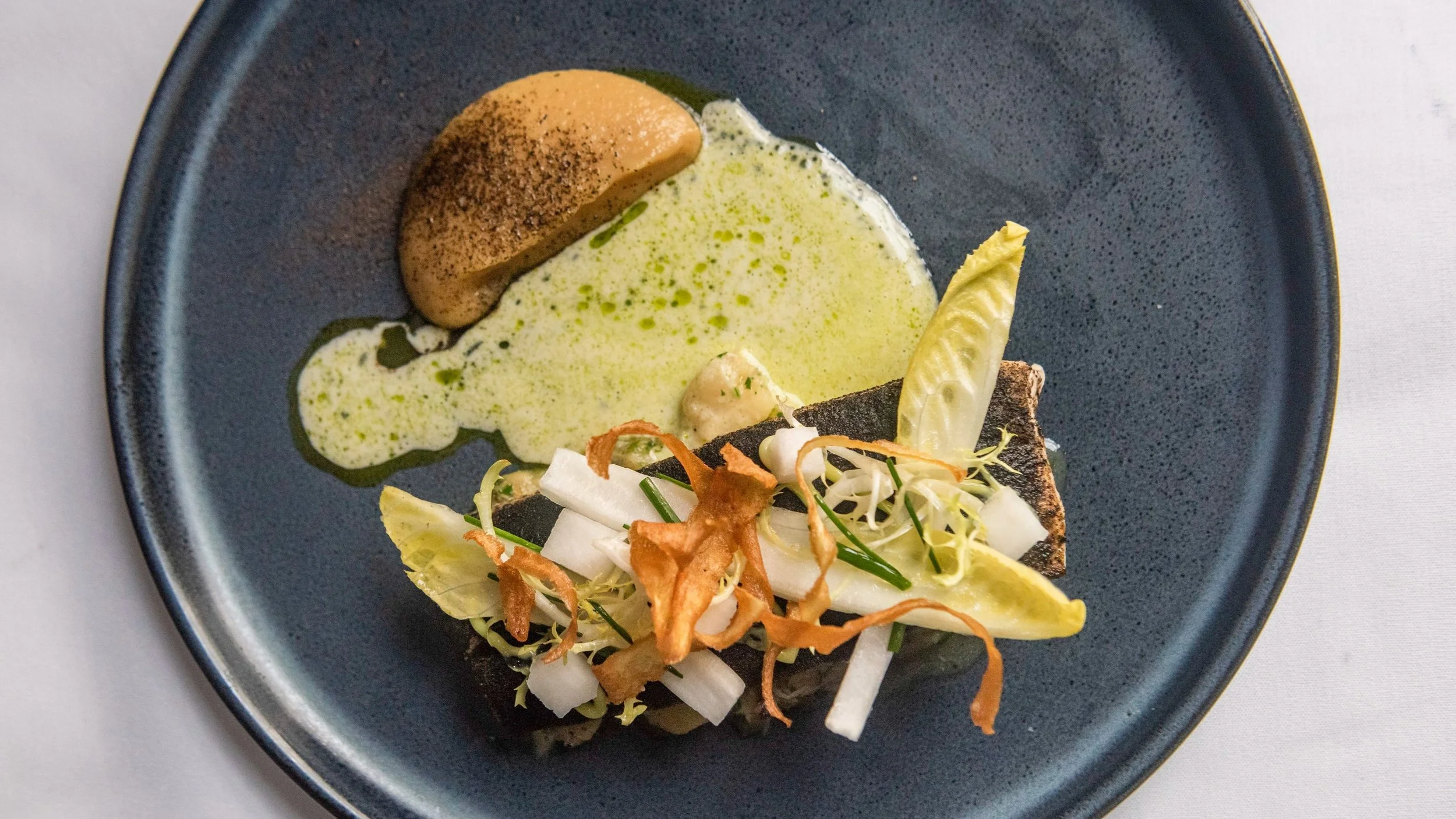 The vegetables have changed over time. Last spring, we had a tartare on the breakfast menu. The crisp component on the tartare was a chip we were making from parsnips. As a byproduct, we had all of these cooked parsnips laying around. One of the things we like to do is put different textures of the same vegetables on a dish. Parsnips is what we were using, so how can we do different things with that parsnips—fried, pickled, écrasé. So we had the bases of the dish: the crab écrasé, and then the fish was sitting on top. We played around with making a salad. Frisée and endive is a really common thing we use. The bitterness offsets the sweetness and goes with the spicy. We were plating it and thought, why don’t we put it on top of the fish… and then it would fall off [by the time a server could drop it at a table]. We had a garlic purée on a different dish. We tried putting that on top to see how it sticks. It didn’t work, but we liked the flavor. We tried scallion mayonnaise and that was just enough adhesive. The butter sauce we broke with scallion oil for presentation.