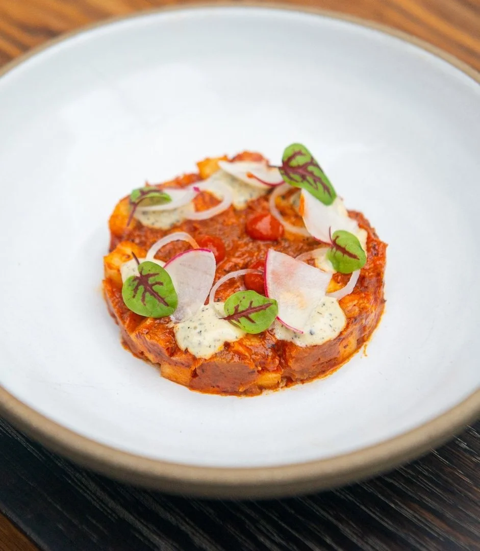 Traveling to Mexico twice a year, Chef Rishi Manoj Kumar of Bar Sótano spent three years perfecting his carnes apache under the tutelage of Chef Rick Bayless. Manoj Kumar’s treatment of ribeye and tuna references Tenochtitlán (the capital of the Aztec Empire in modern-day central Mexico), where meat was cured with salt then cooked with the acidity of lemon juice and peppers. Immigrants to Veracruz and Baja California inspired the spice mixes, which Manoj Kumar makes into salsa macha. His additions of radish, crunchy kohlrabi, and red vein sorrel are a nod to Chicago. Lastly, he uses a flavor that’s plentiful in his home country of Singapore. Biting like cilantro with a black pepper finish, grains of paradise is incorporated into a crema and the salsa macha. Although the recipe is deeply rooted in Mexico, this international touch was logical to him: “My generation of chefs see the world as a global cuisine.”