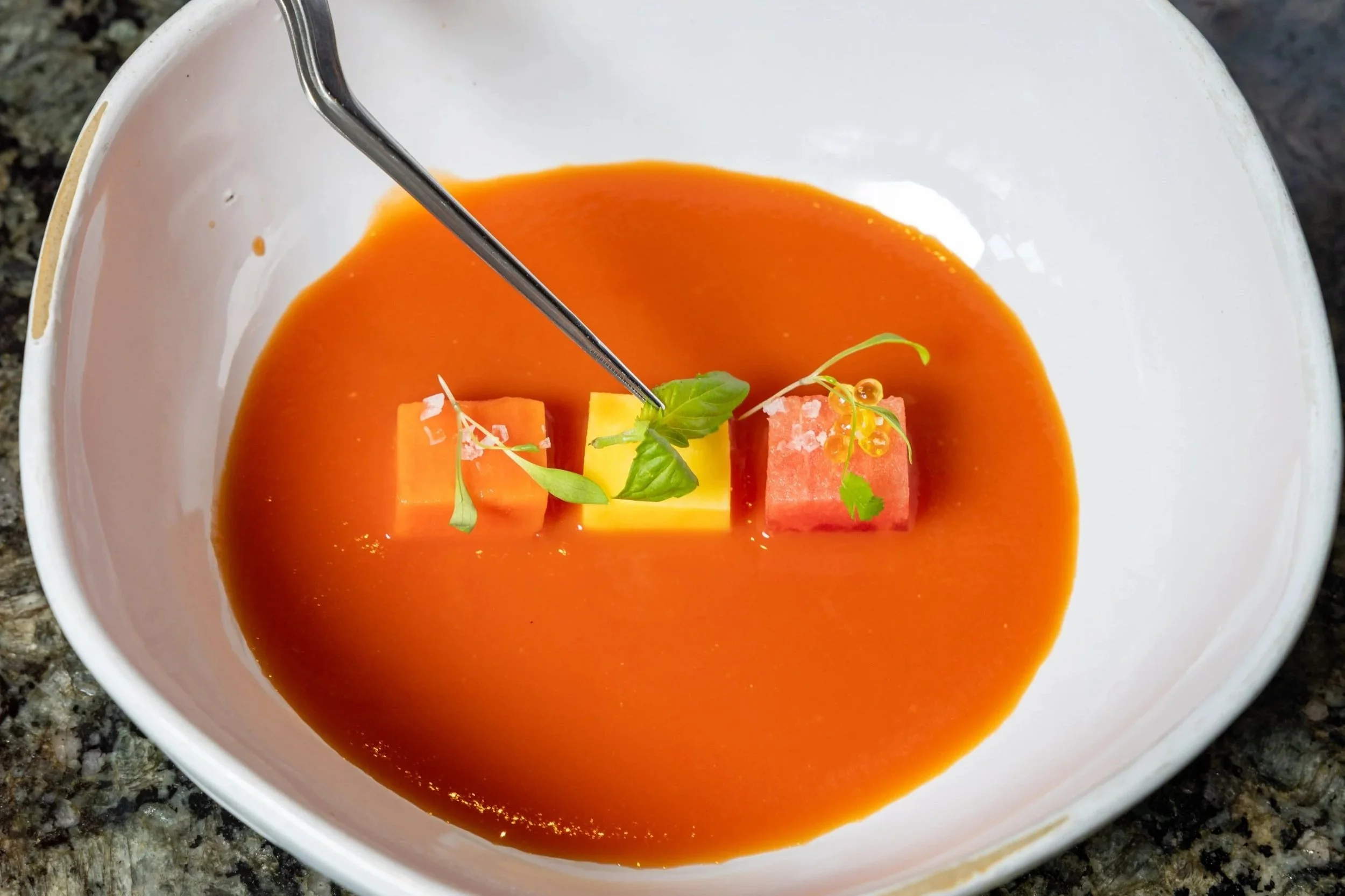 Papaya, Mango, Apple, Sherry Vinegar PDO from Spain, BasilFried Yukon Gold Potatoes, Garlic Mayonnaise, Chile Oil, Sherry Vinegar PDO from SpainSANDRA CORDERO OF XUNTOS | SANTA MONICA, CA
