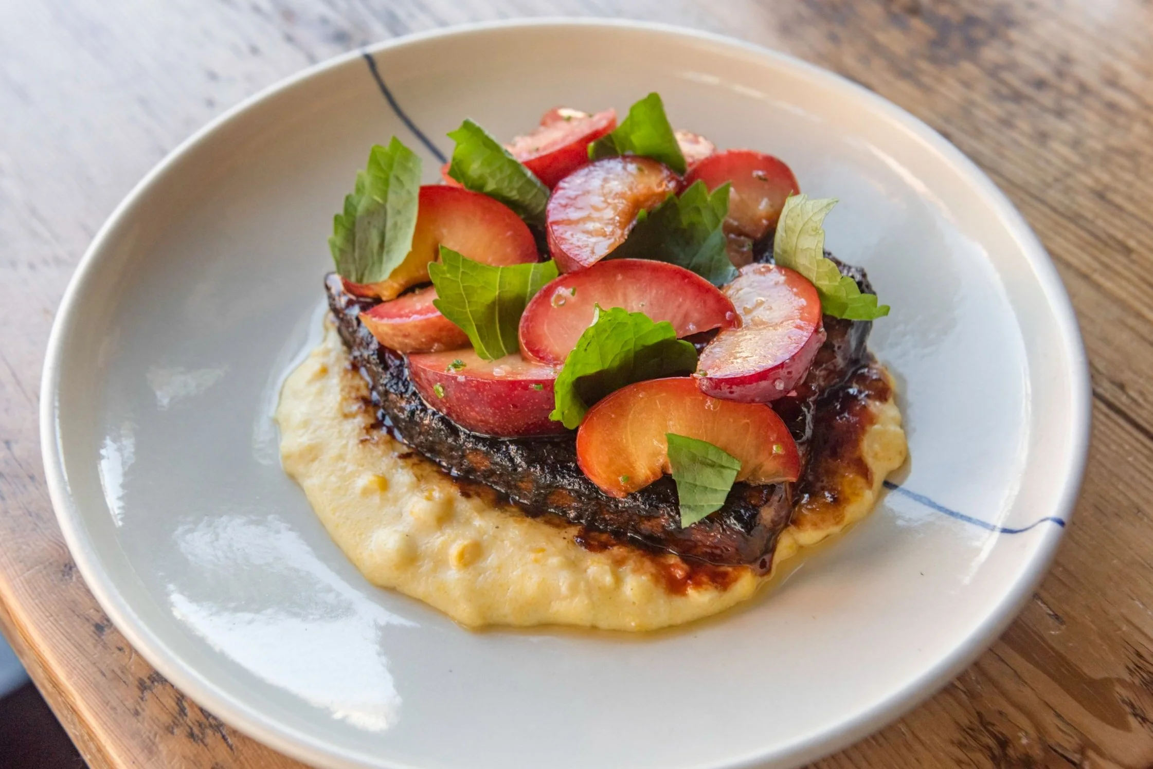Grilled Pork Chop, K&J Pluot Teriyaki, Corn Grits, Shiso from Chef Gizela Ho