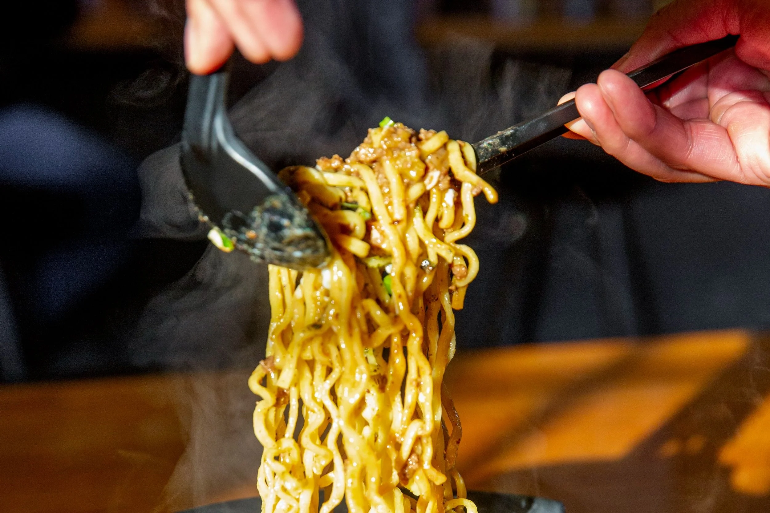 Using the fat from rendered tasso, Nguyen cooks down ground beef with his house-made Cajun seasoning. He adds more trinity (unpickled, this time) and deglazes the mixture with mirin. It gets simmered for 10 to 15 minutes, letting the mirin and seasonings impart a spicy-and-sweet flavor onto the beef and tasso. “The beef is very Cajun, it’s what makes this dish ‘dirty.’ The Cajun seasoning and the tasso gives it a very New Orleans feel.” Nguyen drops ramen noodles over a base of the warm mazemen sauce, then tops it all with toasted nori, charred sweet peppers, a poached egg, and the “dirty” beef and tasso. Nguyen tells guests to mix all the components together, fusing the Japanese and Cajun elements for a slurpable, craveable, and cohesive dish.