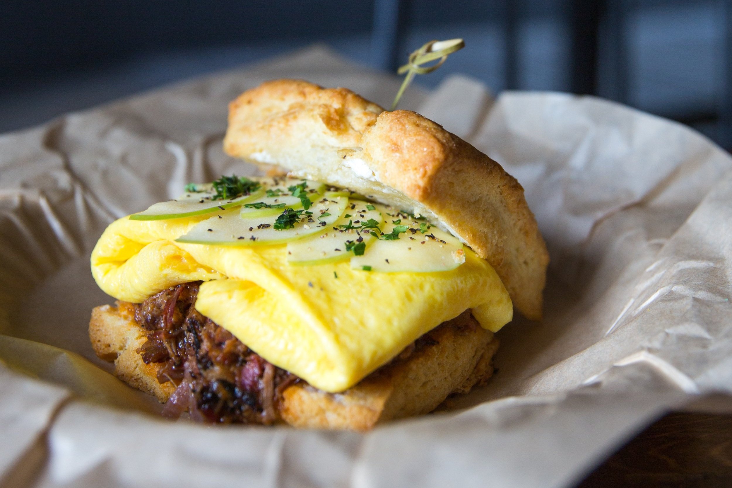 THE LOCAL: STILES SWITCH BRISKET, WARM BISCUIT,EGG, BARBECUE SAUCE, GREEN APPLE, AND CHEDDAR CHEESE