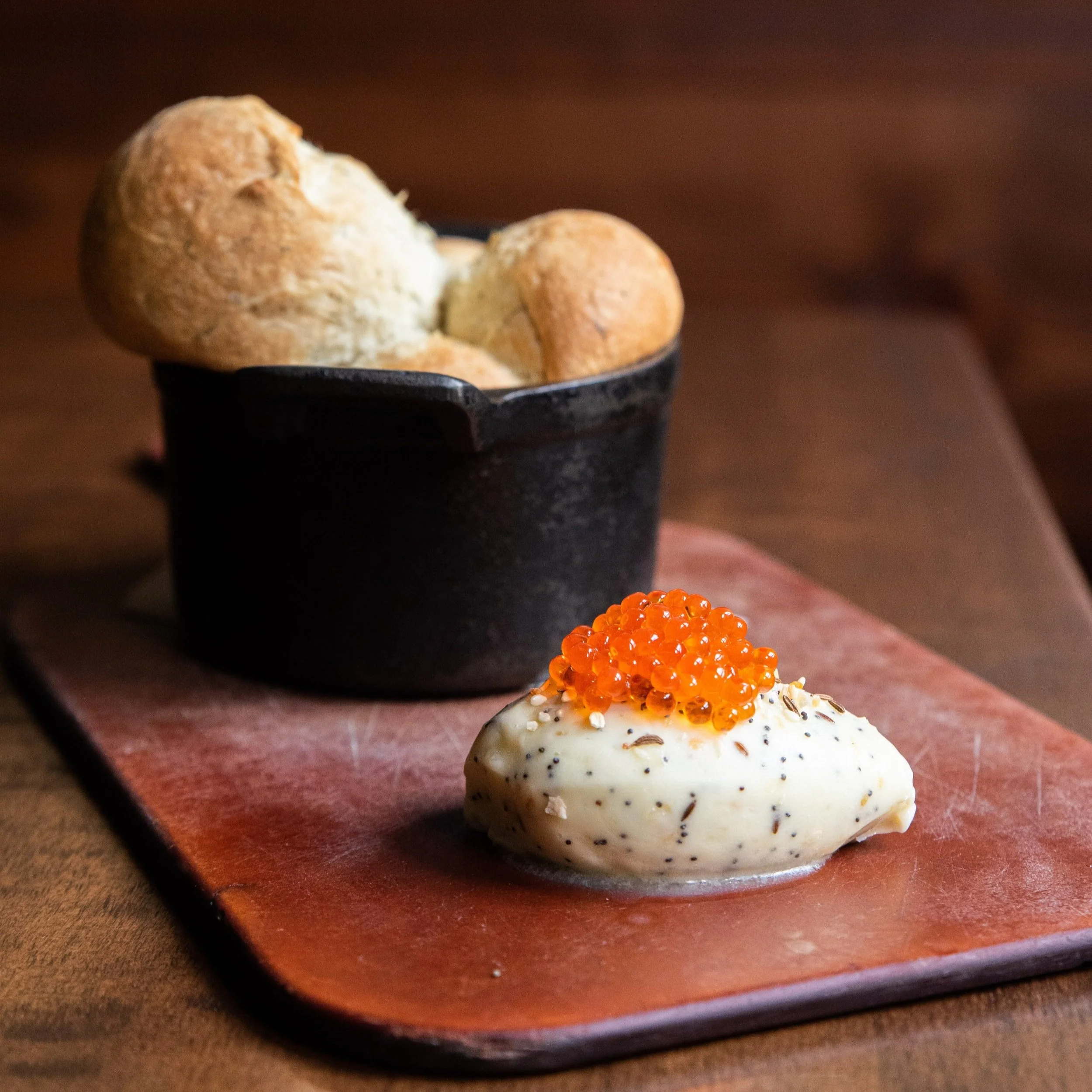 The food there is seriously good, but Nobie’s doesn’t take itself too seriously. Chef/Owner Martin Strayer infuses his playful side into his ever-rotating menu. A prime example, the Dilly Bread. No, it isn’t named after that Bud Light commercial, but the name behind it, well, we will just let him explain. “[It] started because I’m a child and wanted to make a dill dough.” (Say it outloud.) Infused with dill, this bread comes to a head in a miniature cast iron pot. Yielding a milk-bread-like texture with a crusty exterior, it’s best finished off with a swipe through the cultured butter seasoned with everything bagel spice and a crown of smoked trout roe. A popular number, Strayer only makes 18 orders of these each night. So don’t fool around; order it and grab life by the...bread.