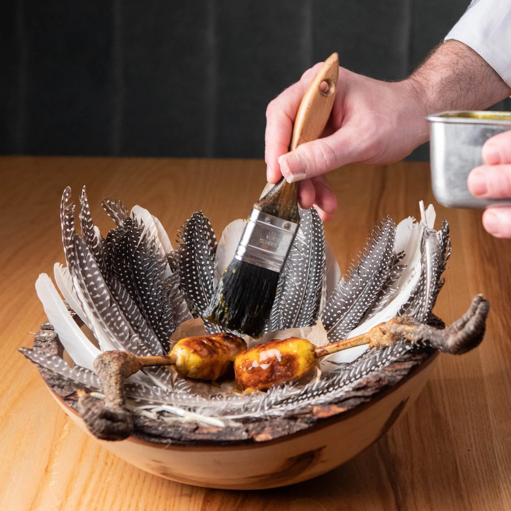 Chef Chris Bleidorn’s guinea hen yakitori hits the table dressed to impress. The meat, skewered on the hen’s leg so guests must grasp the claw to eat it, rests in a bed of its own speckled feathers. The high-impact plating is utilitarian, says Bleidorn. “For us, theatrics have to make sense. It allows us to showcase something [diners might otherwise not see].” Bleidorn blends the hen’s white meat into a sausage and makes a mousse out of the dark meat before combining them with Indian spices. He uses the hen’s yolk and grilled bones for a glaze that makes the meat glisten with flavor. It’s a feast for the eyes and a feather in Bleidorn’s cap.