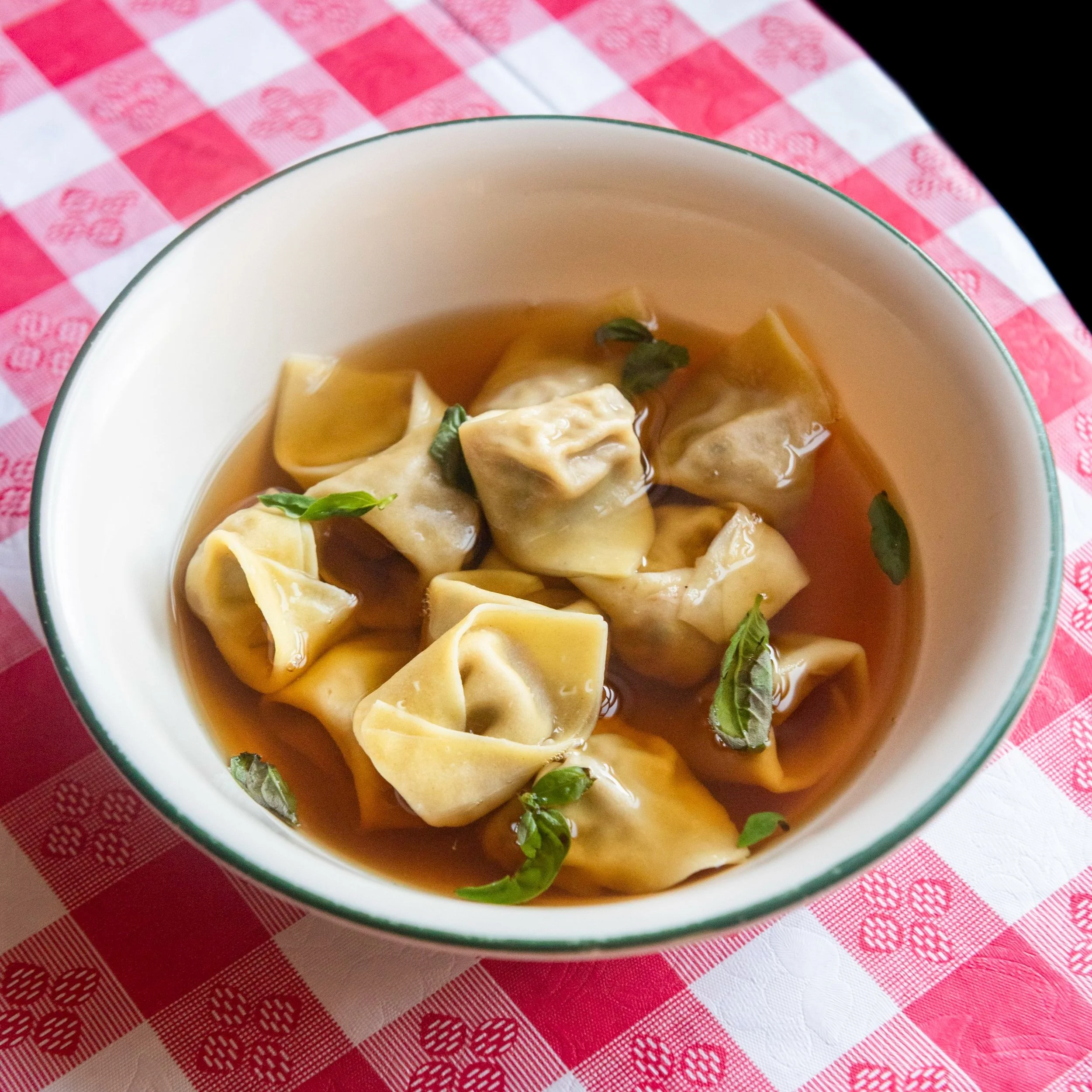 Inspired by heritage, memory, and community, Chefs Sam Kalkut, Jake Loeffler, and Daniel Griffiths have taken their favorite dishes from childhood and used all of their “education and experiences in fine dining to further push the food,” says Loeffler. And while collaboration can often be difficult (especially in a kitchen), the chefs discovered early on that “Italian was common ground” for all of them to express themselves on Paffuto’s menu. Their nostalgic tortellini en brodo is a reflection of the trio’s personal and shared experiences. The inspiration came from “eating chicken noodle soup” as kids and “wanting to recreate that comforting flavor profile in an Italian style.” For Loeffler and Griffiths, Sunday dinners with their Italian relatives instilled in them an appreciation and longing for those familiar flavors. And for Kalkut, it was more about paying homage to the dishes he ate around Manhattan with his Jewish grandparents as a kid. The broth is made with roasted pork bones, charred alliums, and a mirepoix, and is then clarified with shallots and lemon juice. The rich, clear brodo—which warms tender tortellini—is black pepper and pork-forward, leaning on the Italian flavors they all grew up eating.