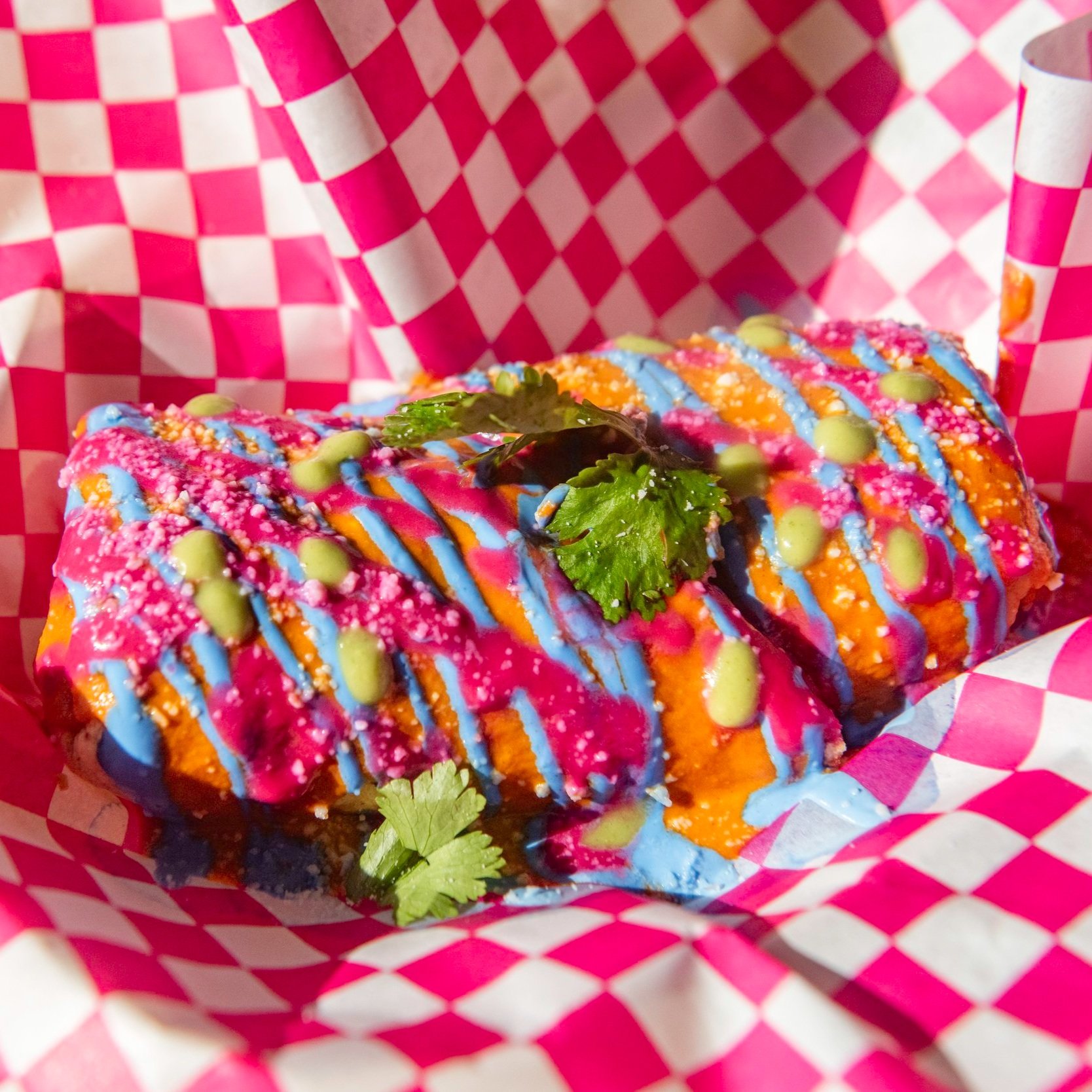 At Reuby, Chef Reuben Asaram’s Asian-Mexican pop-up, the dishes blend the flavors of Asaram's childhood with those he picked up along his global travels. Menu items, like his Reubychanga, incorporate techniques and ingredients from both his Indian upbringing and his later-in-life exploration of Mexico’s cultural and culinary mainstays. His trip to Mexico, in particular, kick-started the ethos behind many of the dishes at Reuby. “I had an ex-line cook who took me inside Mexico,” says Asaram. “We went to these little towns, learned so much from all the abuelitas and street vendors.” But the moment that spurred Asaram’s creativity was when he was “eating one of the moles and it instantly reminded me of my Indian mother’s curry.” Now, his Reubychanga dish reflects his memories, his culinary heritage, and his contemporary inspirations all at once. The chimichanga starts with tikka-spiced pulled chicken thighs cooked like carnitas with achiote paste. Rather than using basmati rice, which is more traditional, Asaram cooks canilla rice with biryani-esque spices. The chicken and rice is wrapped in a tortilla, fried, and covered with a butter chicken sauce, salsa verde, beet-lime crema, cotija cheese, and Asaram’s vibrant “Papa Smurf” sauce.