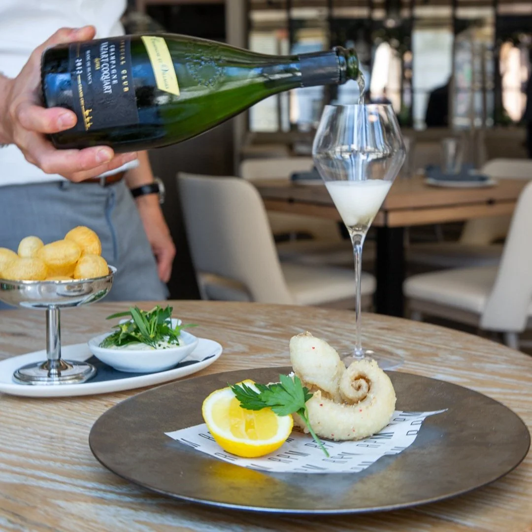 Instead of choosing haddock or cod for fish and chips, Chef Bob Broskey went all out with Dover sole at the fine dining RPM Seafood. (It’s probably the only fish and chips that requires buying fish at auction in Holland twice a week.) Broskey fries the sole in a masa batter and serves with pommes soufflés and a sauce gribiche made with cornichons. For this high-low dish, Wine Director Richard Hanauer chose a 2012 special club Champagne from Vazart-Coquart & Fils. The chardonnay grapes grow in similar soil to the region around the English Channel, where the fish swim. “The fish with the masa batter is such a cool texture, and the bubbles enhance it,” Hanauer says. “And this blanc de blancs has so much lemon; it’s like a squeeze of lemon juice over fish.”