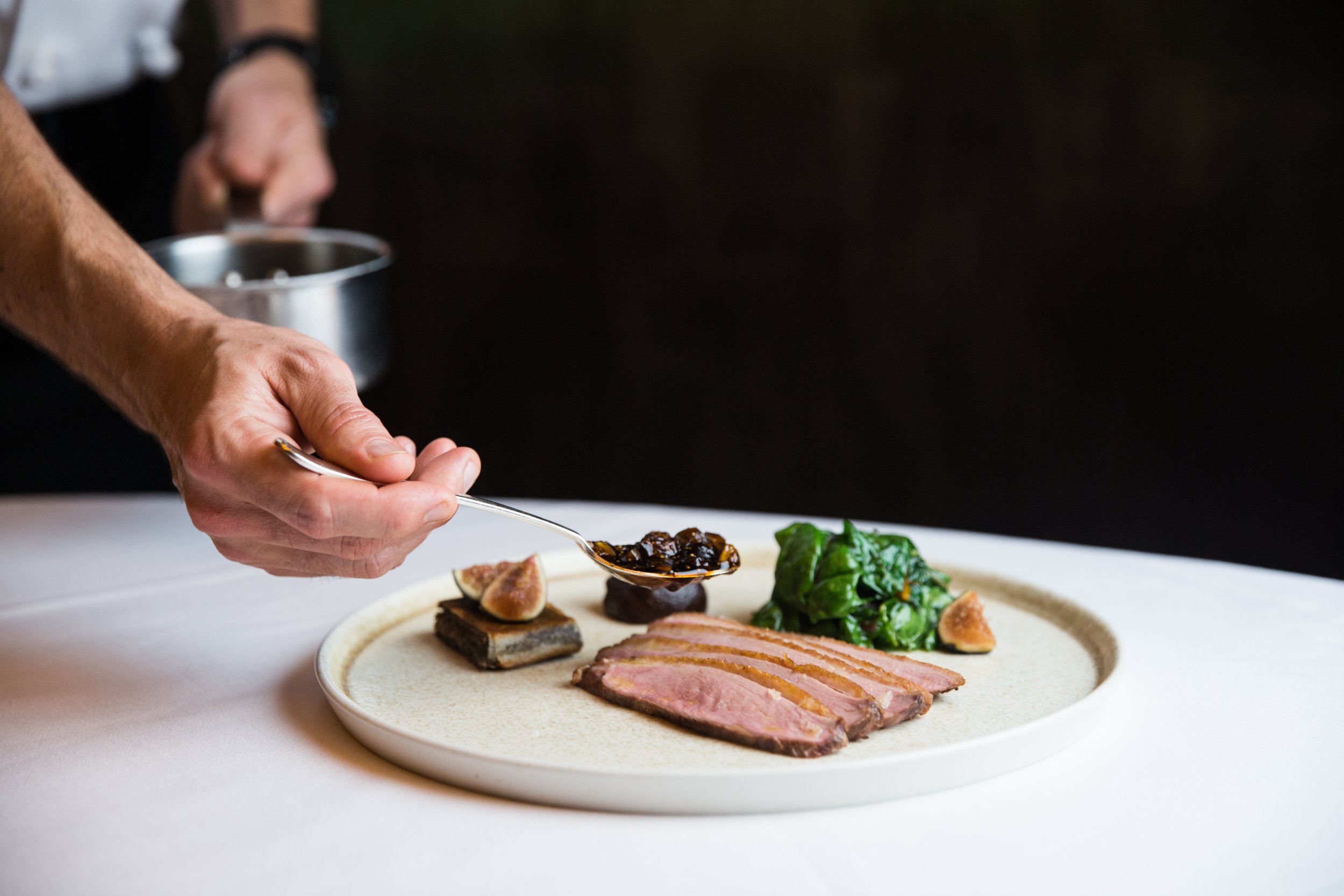 Fork's Duck Breast, Confit Duck Legs and Duxelle in Brik Pastry, Fig-Red Wine-Date Molasses Jus, and Swiss Chard