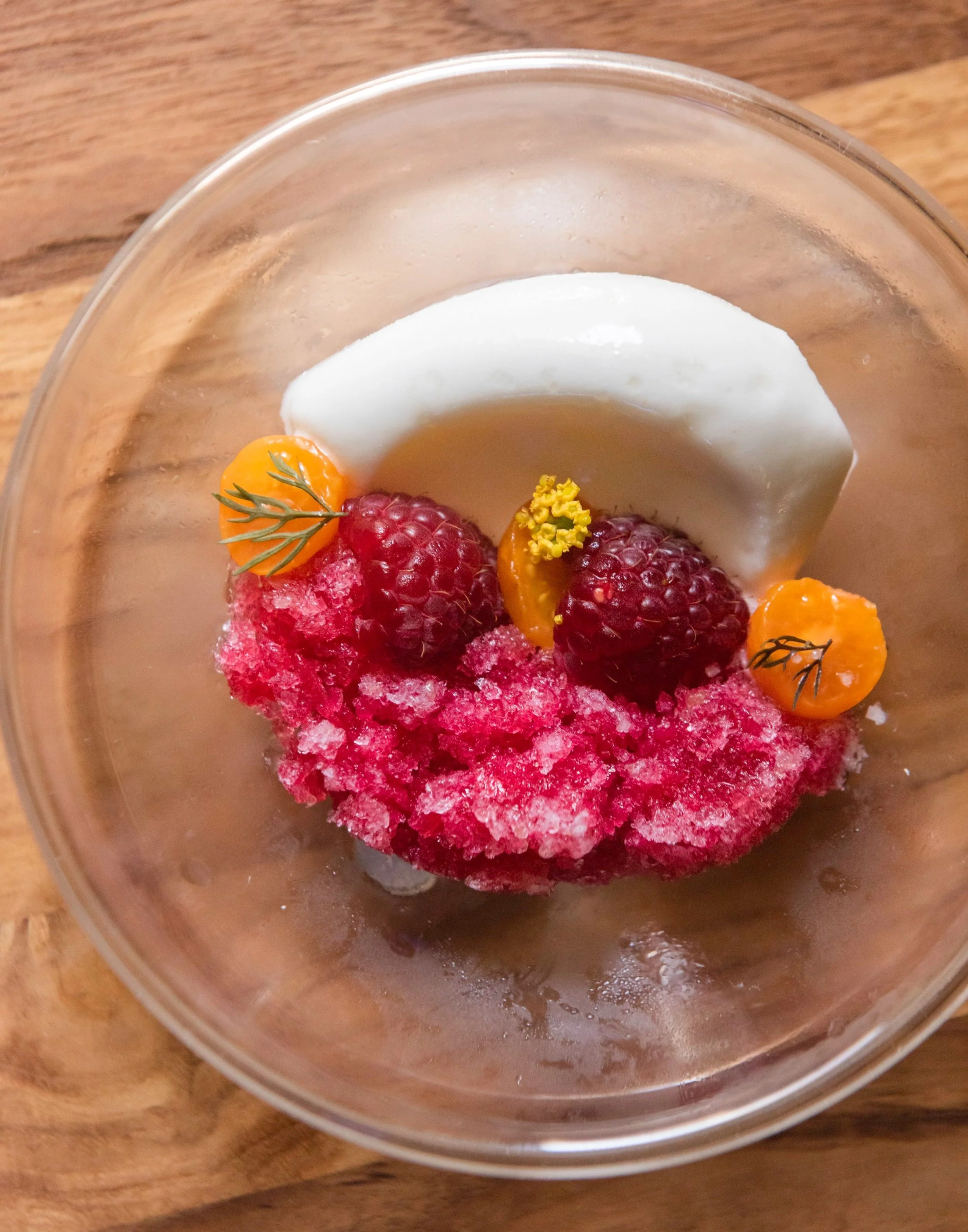 Queso Fresco Semifreddo, Tomato-Raspberry Granita, Nixtamalized Sungold Tomato, Fresh Raspberries, Wild Fennel |. photos: will blunt