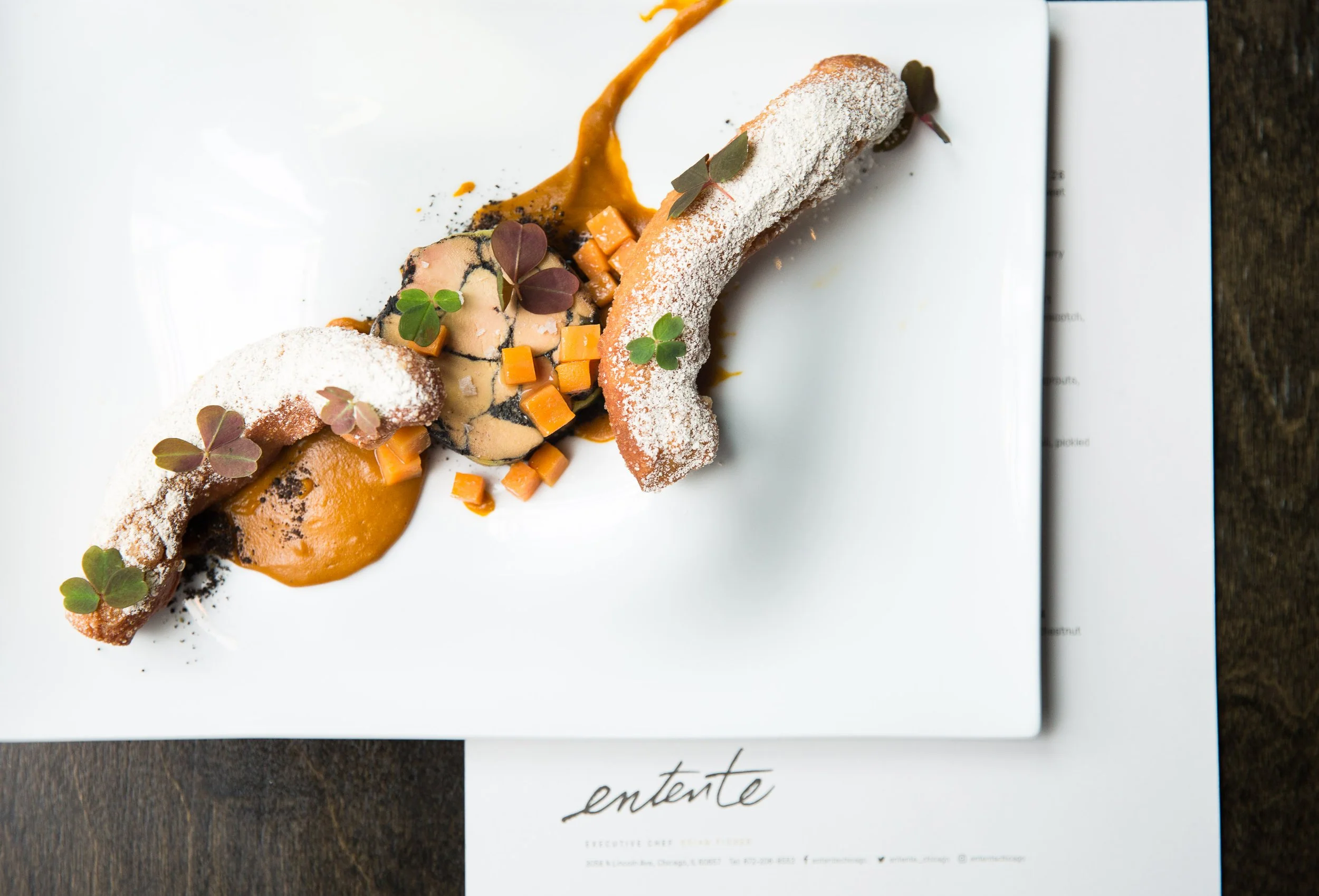 Foie gras torchon, chicory, sweet potato purée, confit sweet potato, candy cap mushroom beignet