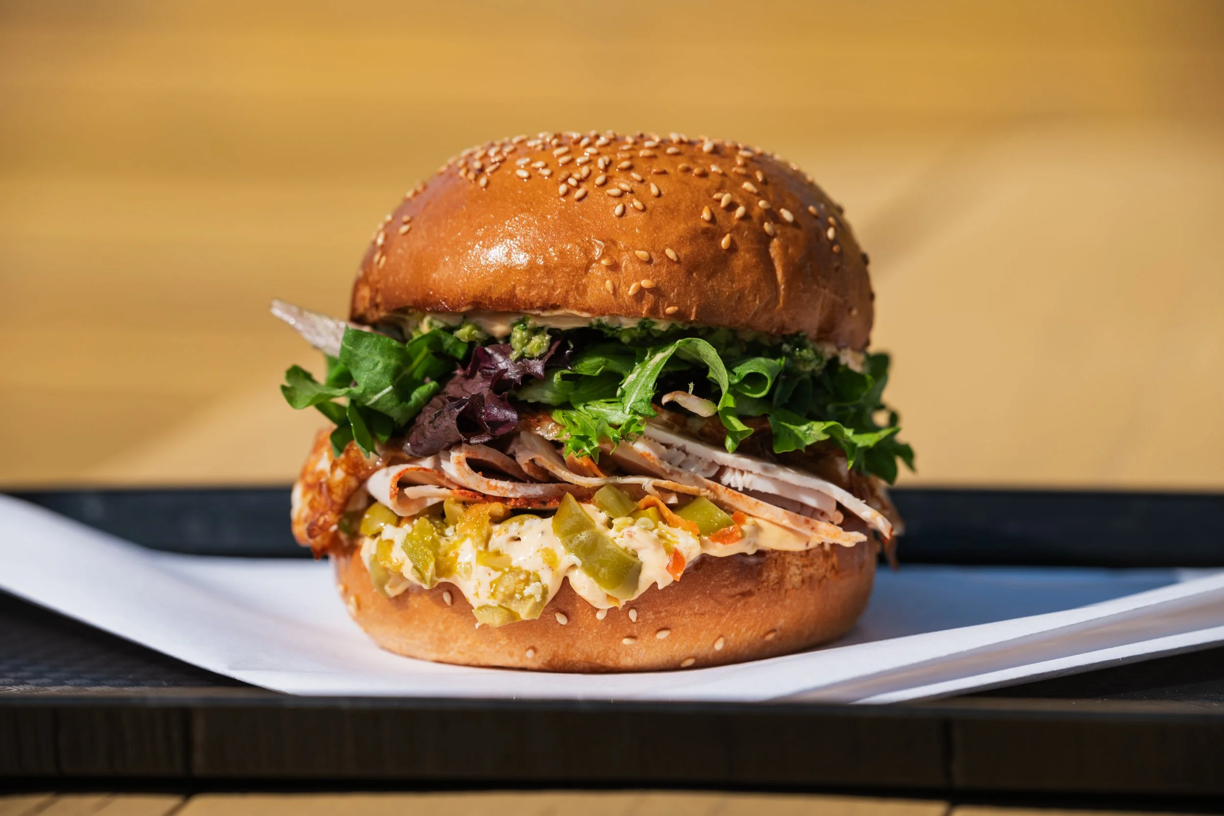 Pesto Poultry: Turkey, Chihuahua-Mozzarella Cheese Blanket, Dressed Greens, Broccoli-Walnut Pesto, Chile Crisp Mayonnaise, Olive Relish, Sesame Bun