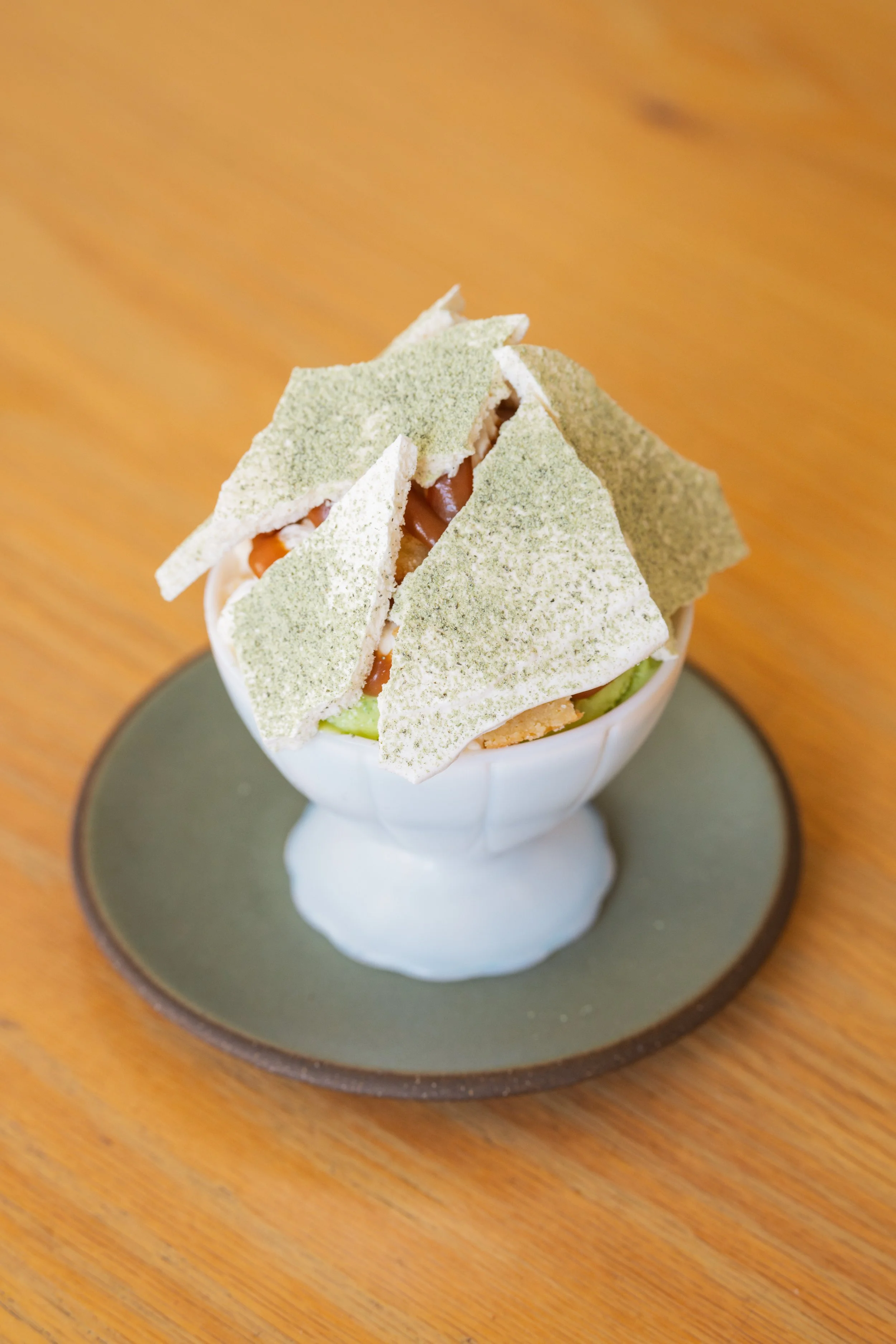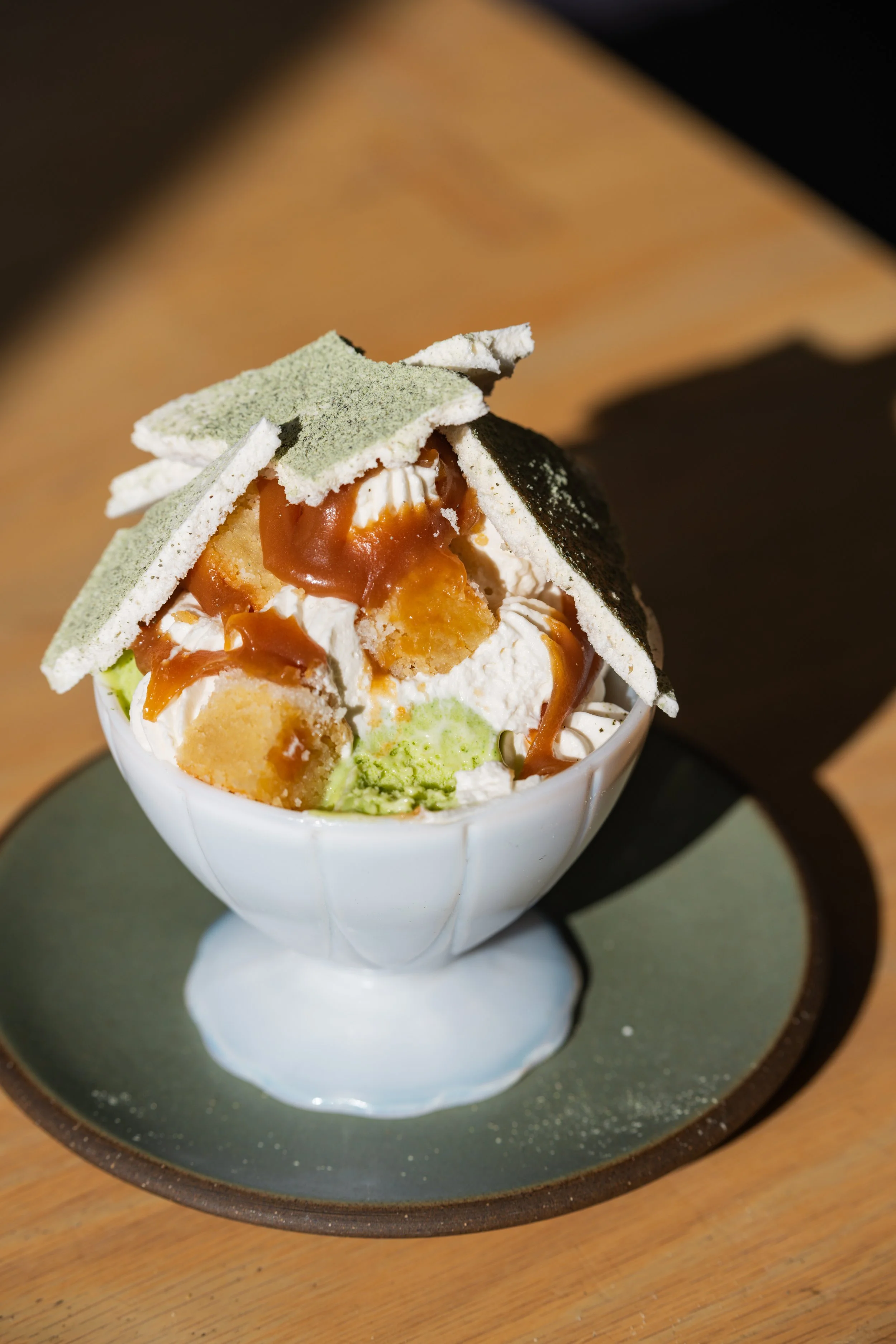 Sundae: Mint Ice Cream, Oolong Tea Ice Cream, Shortbread Cookies, Oolong Tea Whipped Cream, Oolong Tea Caramel, Meringue, Oolong Tea Powder