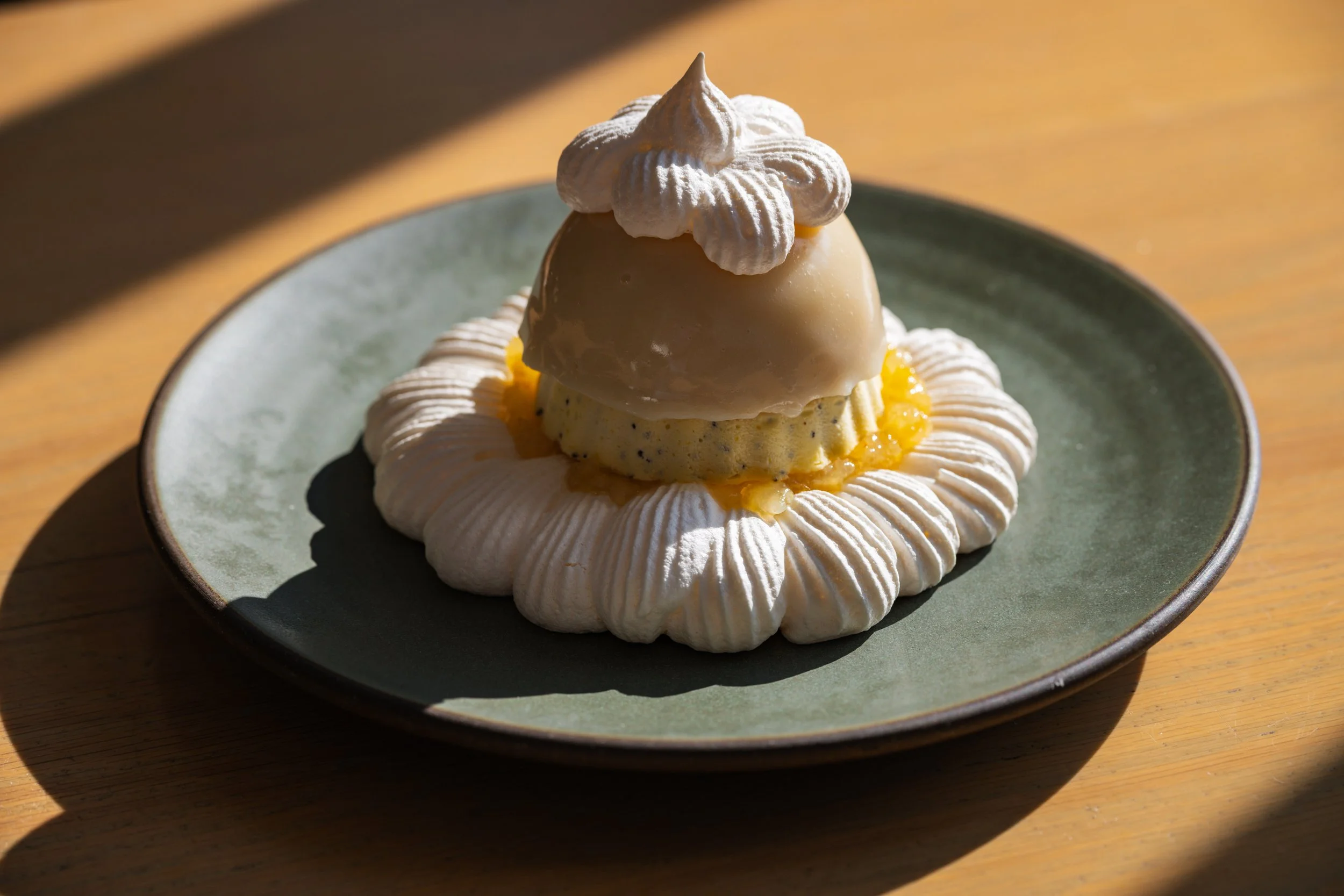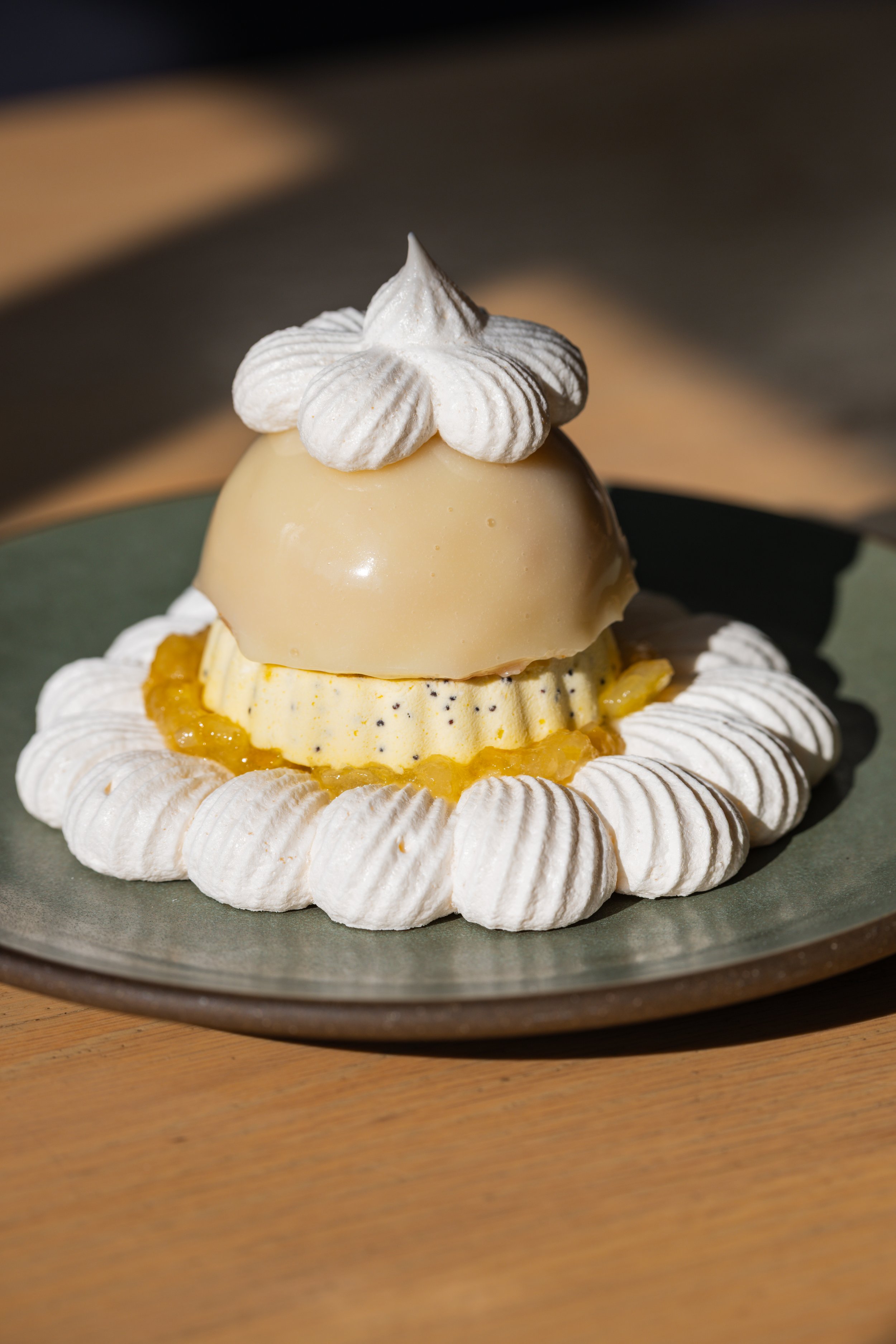 Delicia al Limone: Olive Oil-Poppy Seed Semifreddo, Chiffon Cake, Limoncello Bavarian Cream, White Chocolate Mirror Glaze, Meringue, Meyer Lemon Marmalade