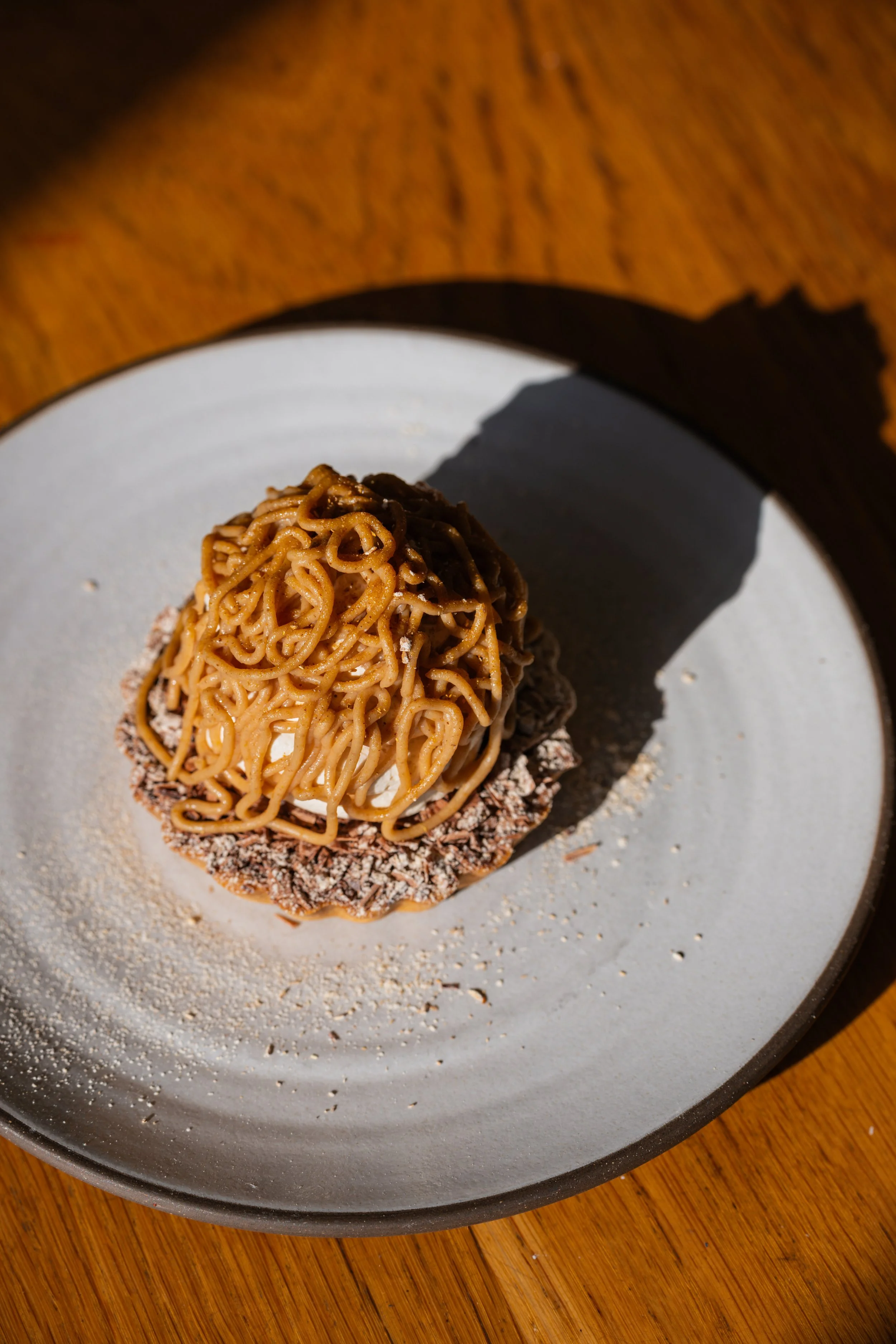 Mont Blanc: Chestnut Tart, Hojicha Pastry Cream, Milk Chocolate Ice Cream, Chestnut Cream, Coconut Sugar Whip, Shaved Dark Chocolate, Shaved Milk Chocolate, Mushroom Sugar