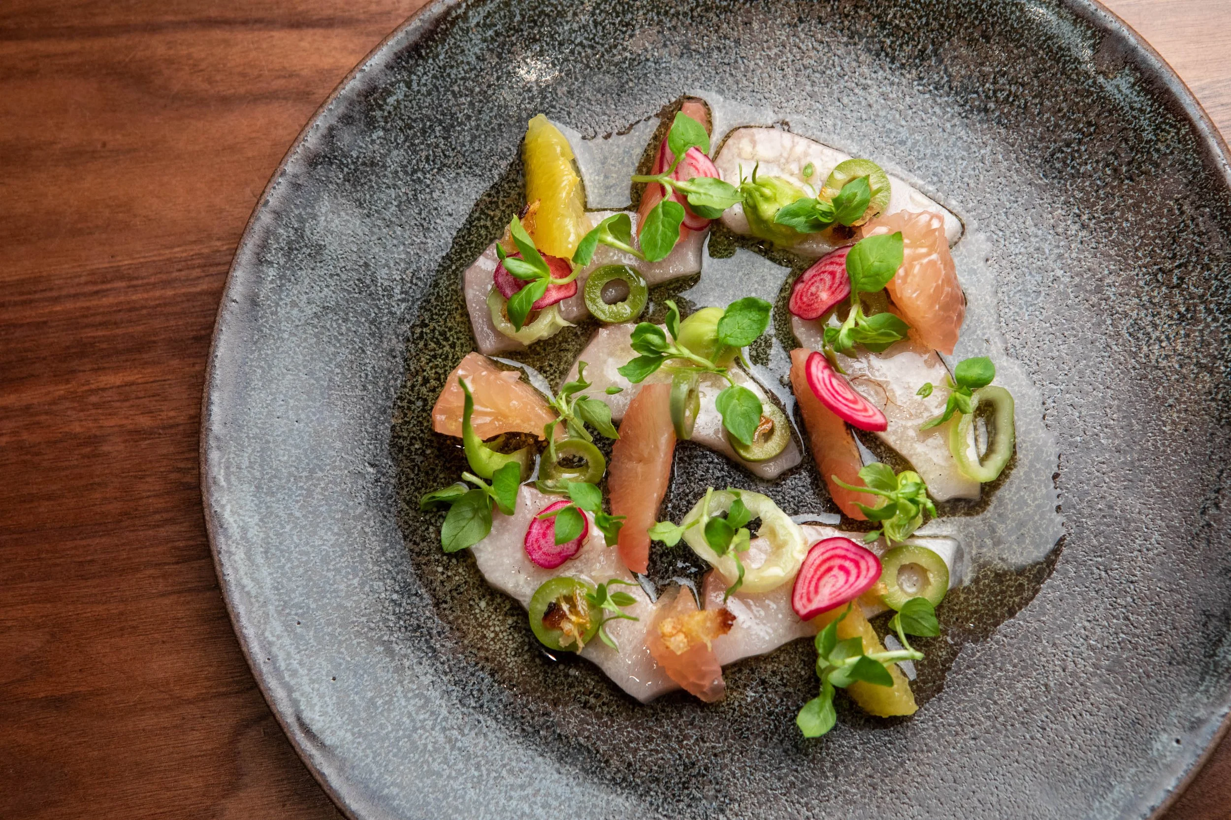 Hamachi Crudo, Puntarelle, Grapefruit, Green Olive, and Buddha’s Hand