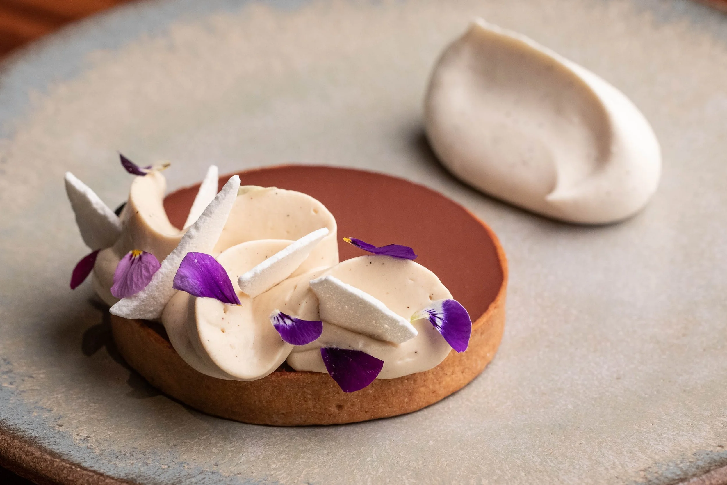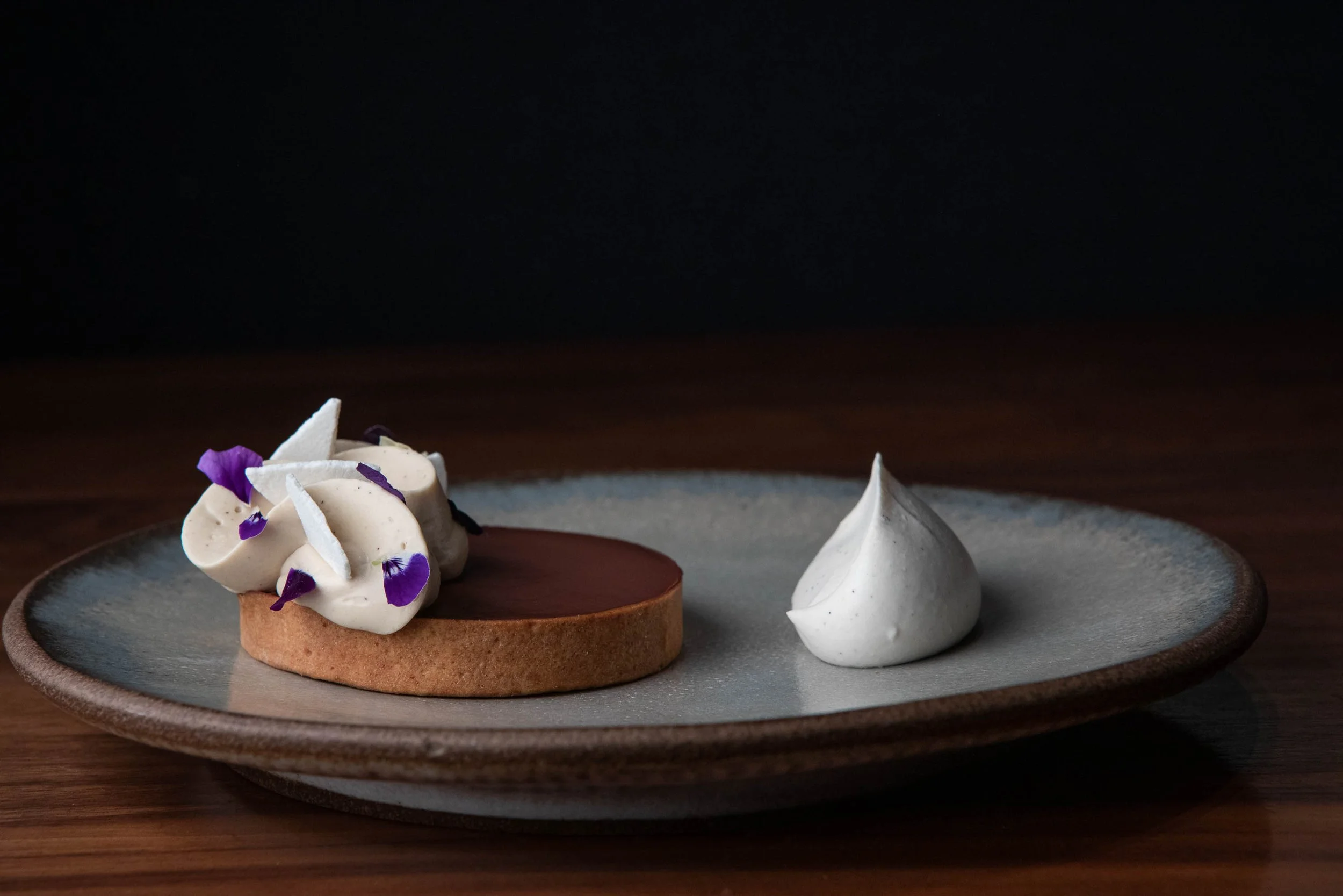 Chocolate Cremeux Tart, Candied Almond, Coffee, and Roasted Vanilla