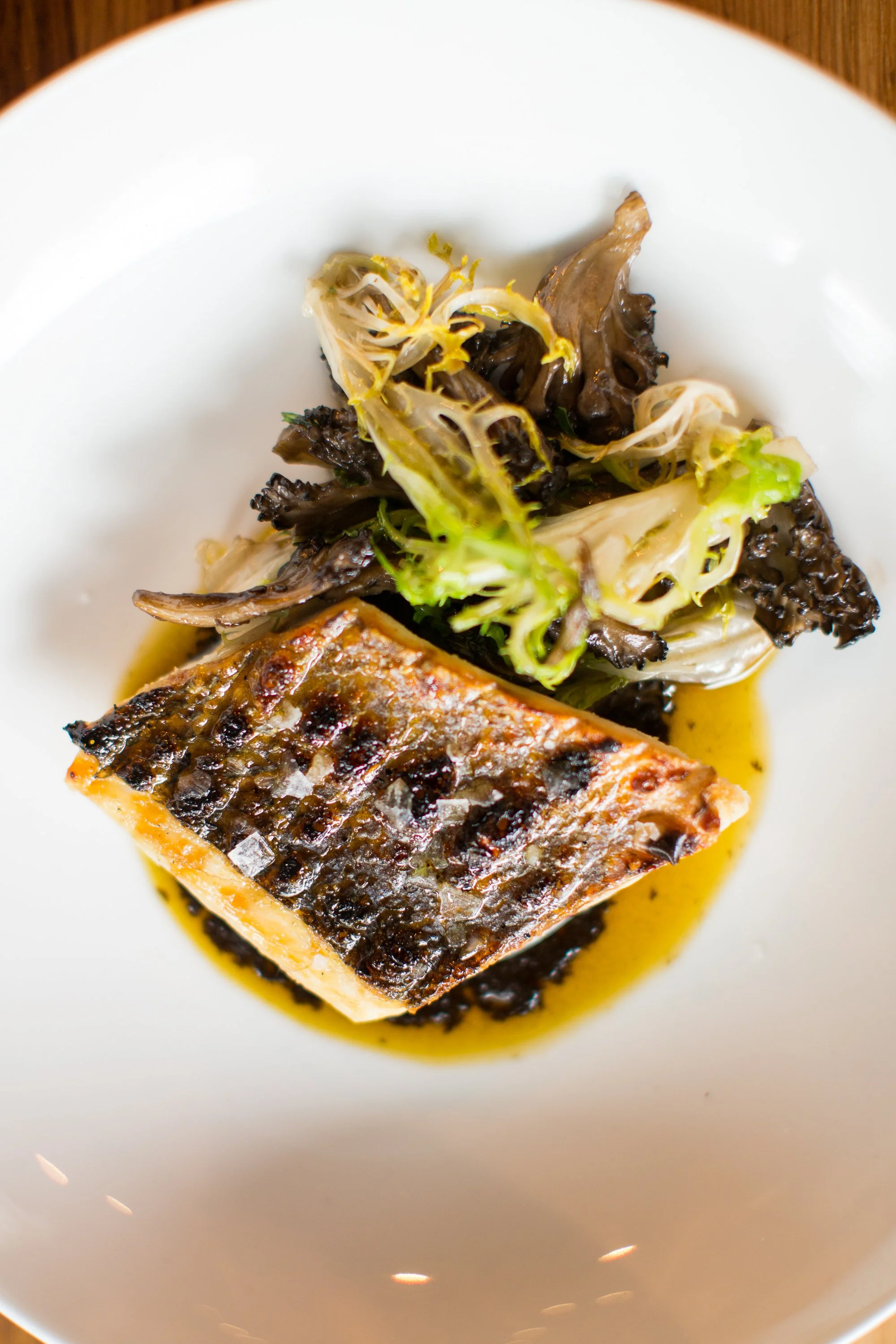 Grilled Branzino, Sautéed Maitakes and Frisée, and Charred Green Onion Vinaigrette