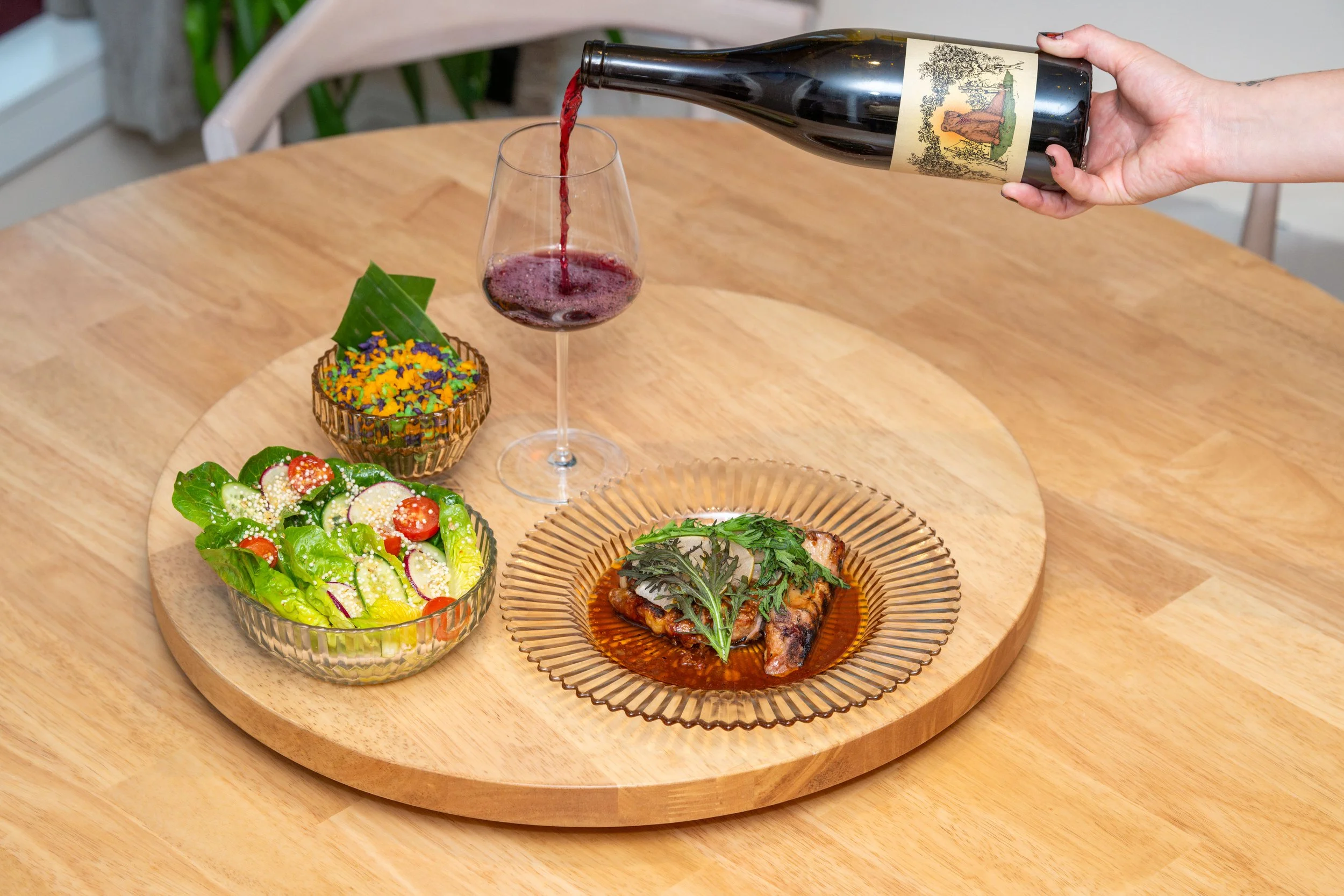 (1) Lemongrass-Marinated Pork Chop, Asian Pears, XO Jus; (2) Coconut Milk Steamed Rice, Durian, Pandan, Ube; (3) Gem Salad, Cucumbers, Radish, Cherry Tomatoes, Mango Nước Chấm paired with Grenache/Mourvedre, Brij Wines, Oso Rouge, San Luis Obispo Coast, California, 2024