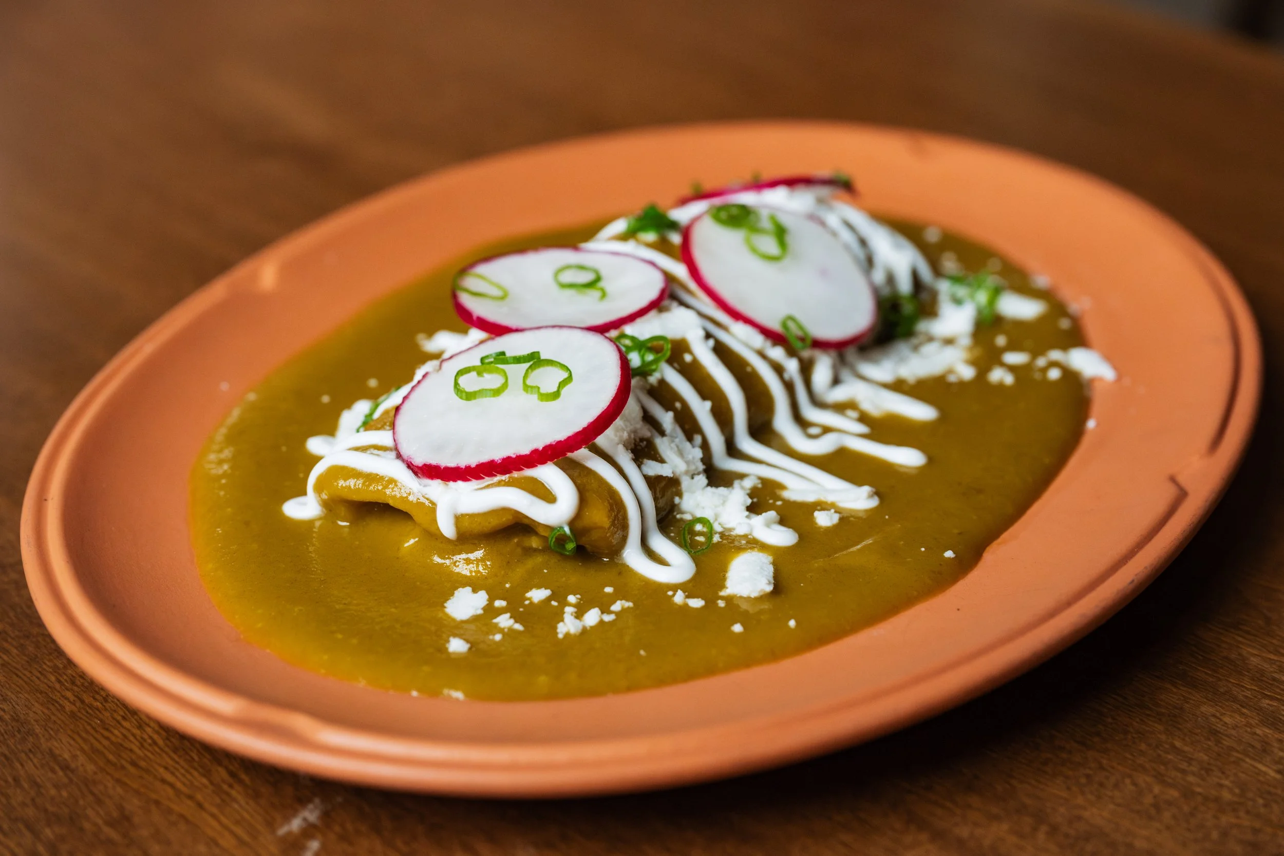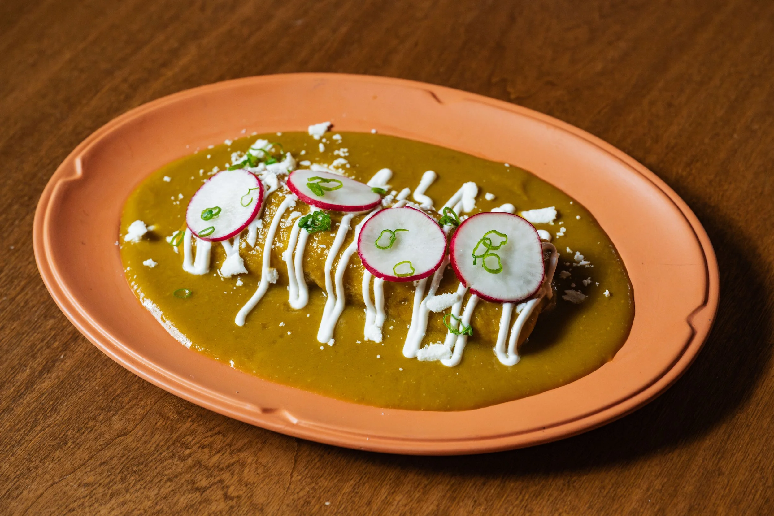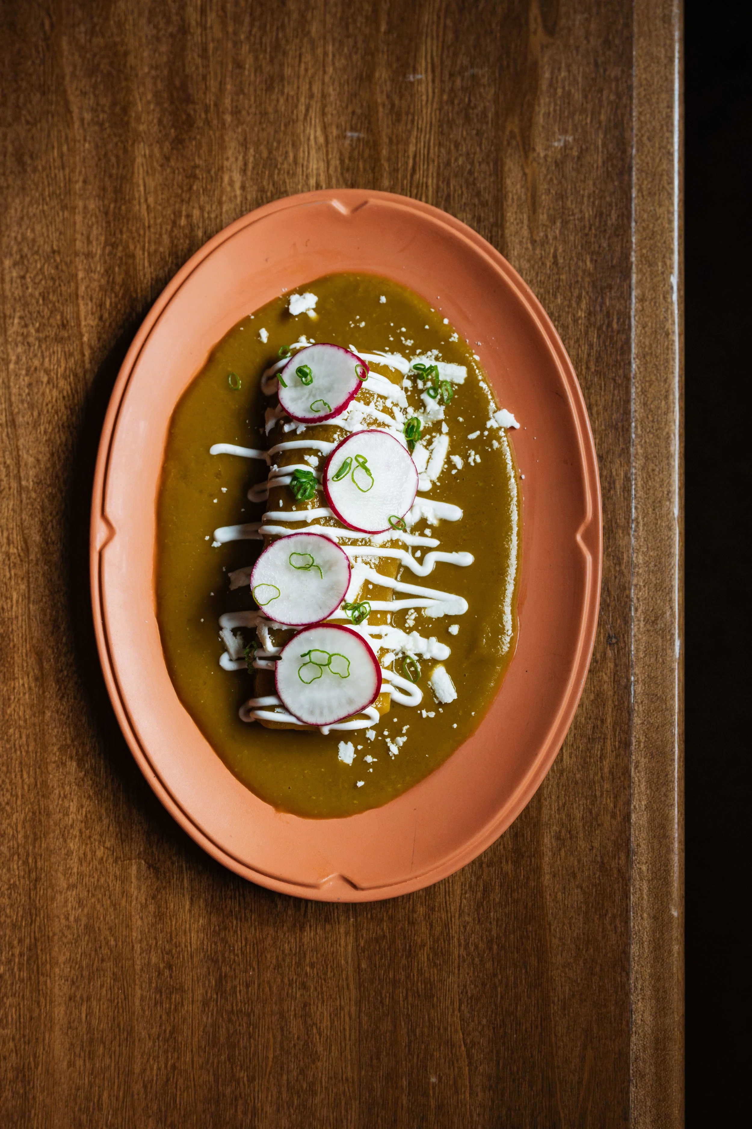 Abuelita’s Cuca’s Enchilada: Chicken Thigh-Napa Cabbage Enchilada, Tomatillo Salsa, Cotija Cheese, Cultured Cream, Radish, Scallions