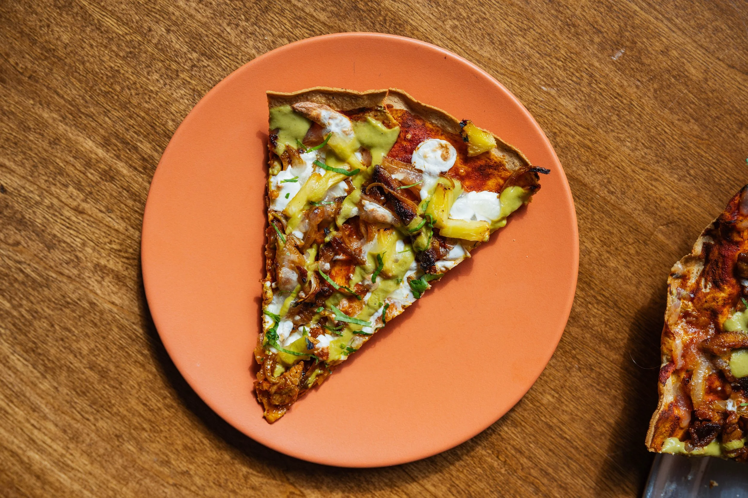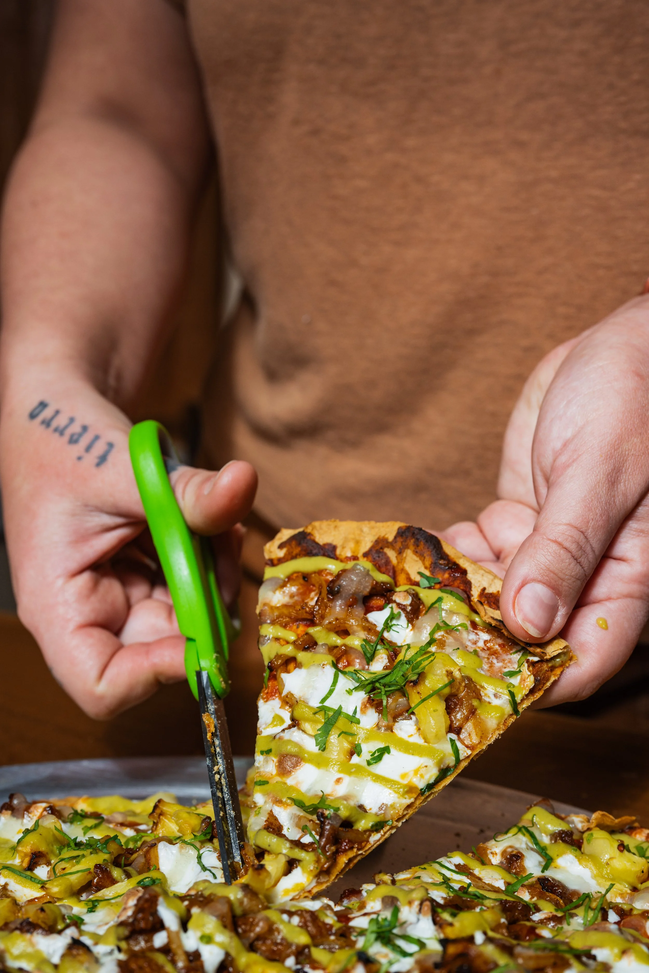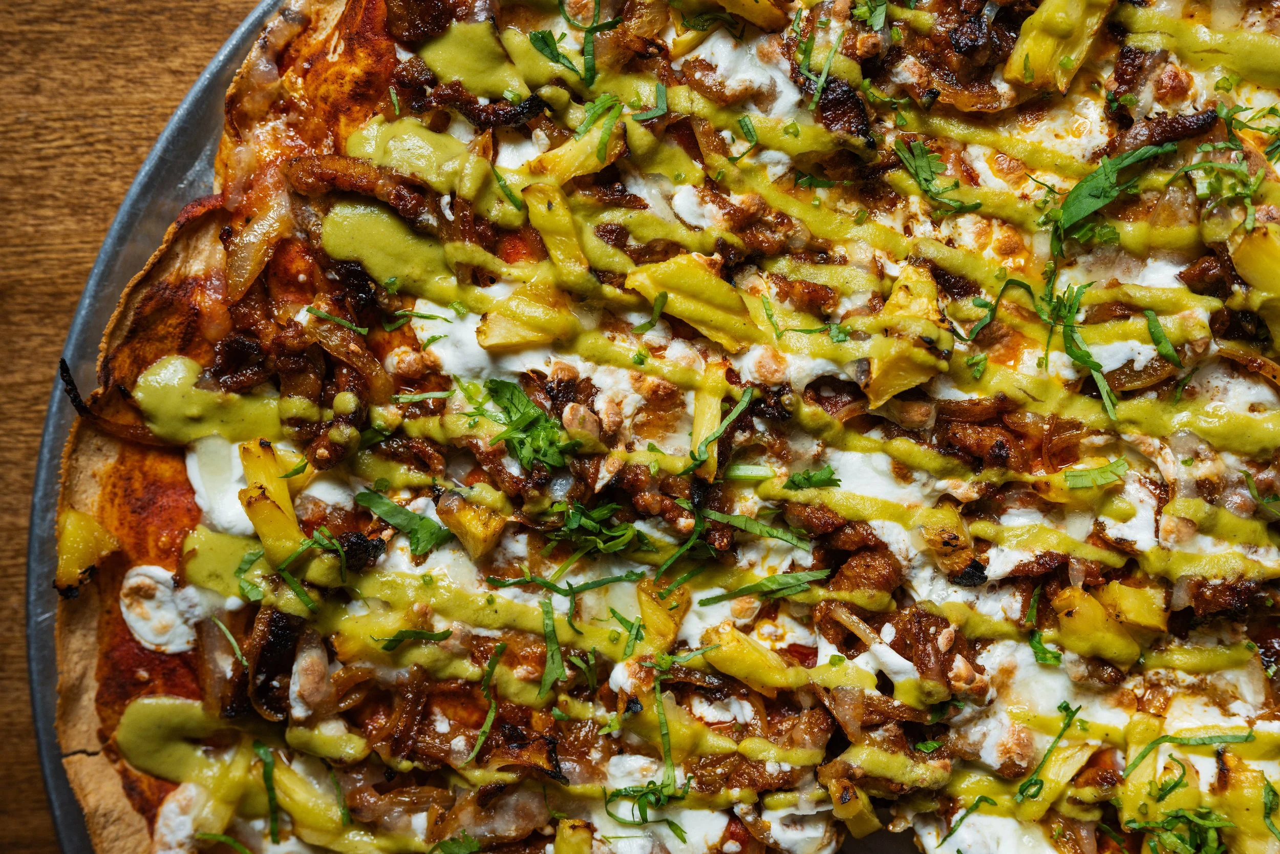 Al Pastor Tlayuda, Asadero Blend, Pineapple Fluid Gel, Poblano Crema, Cilantro