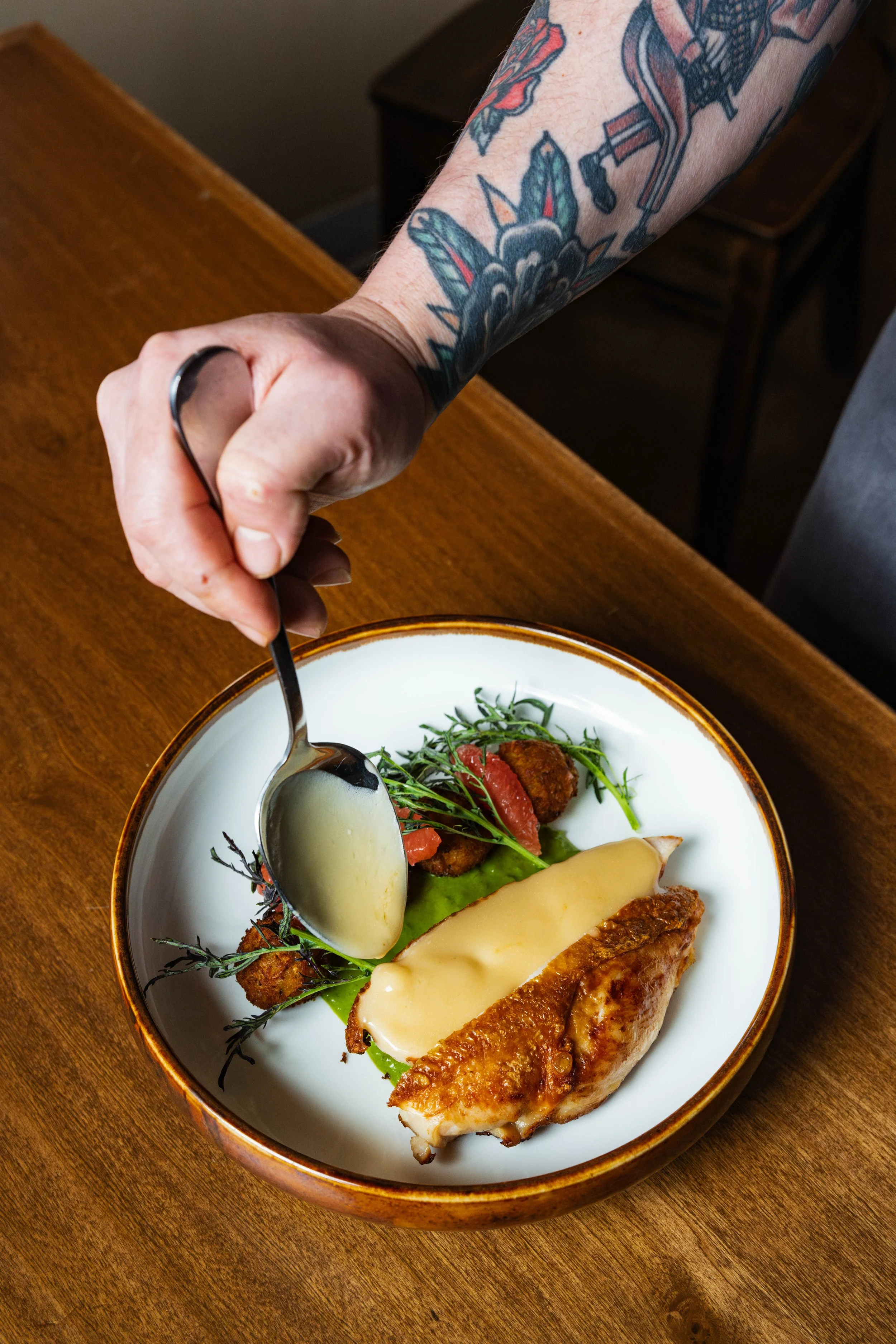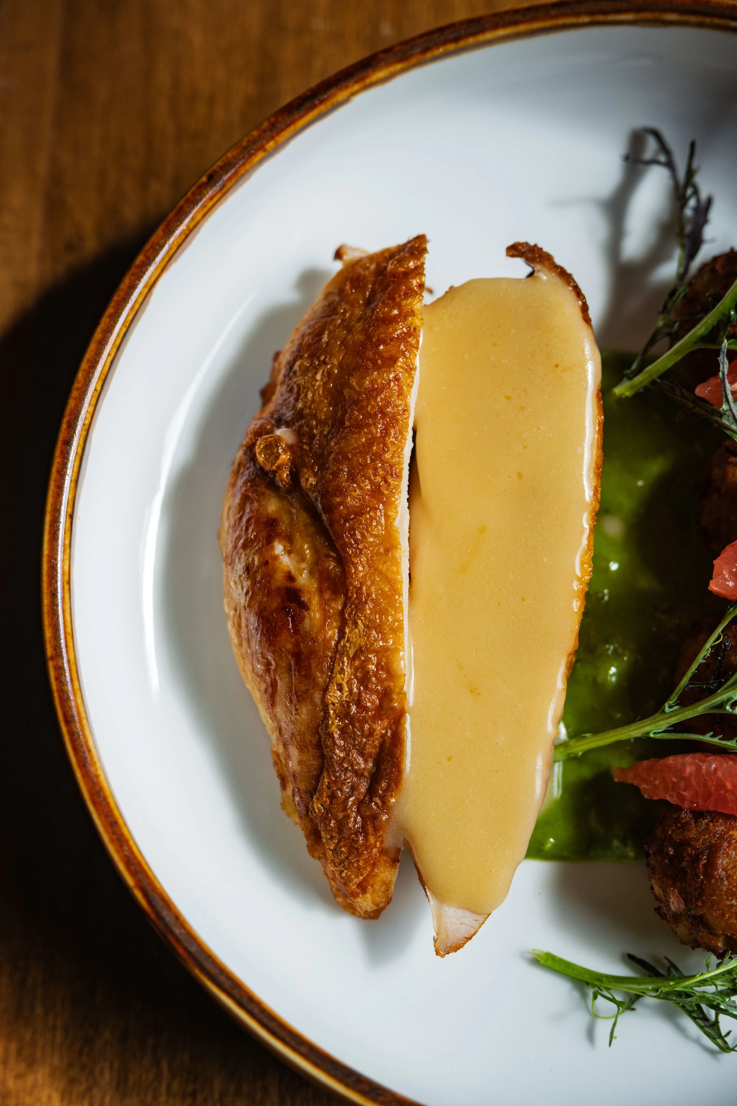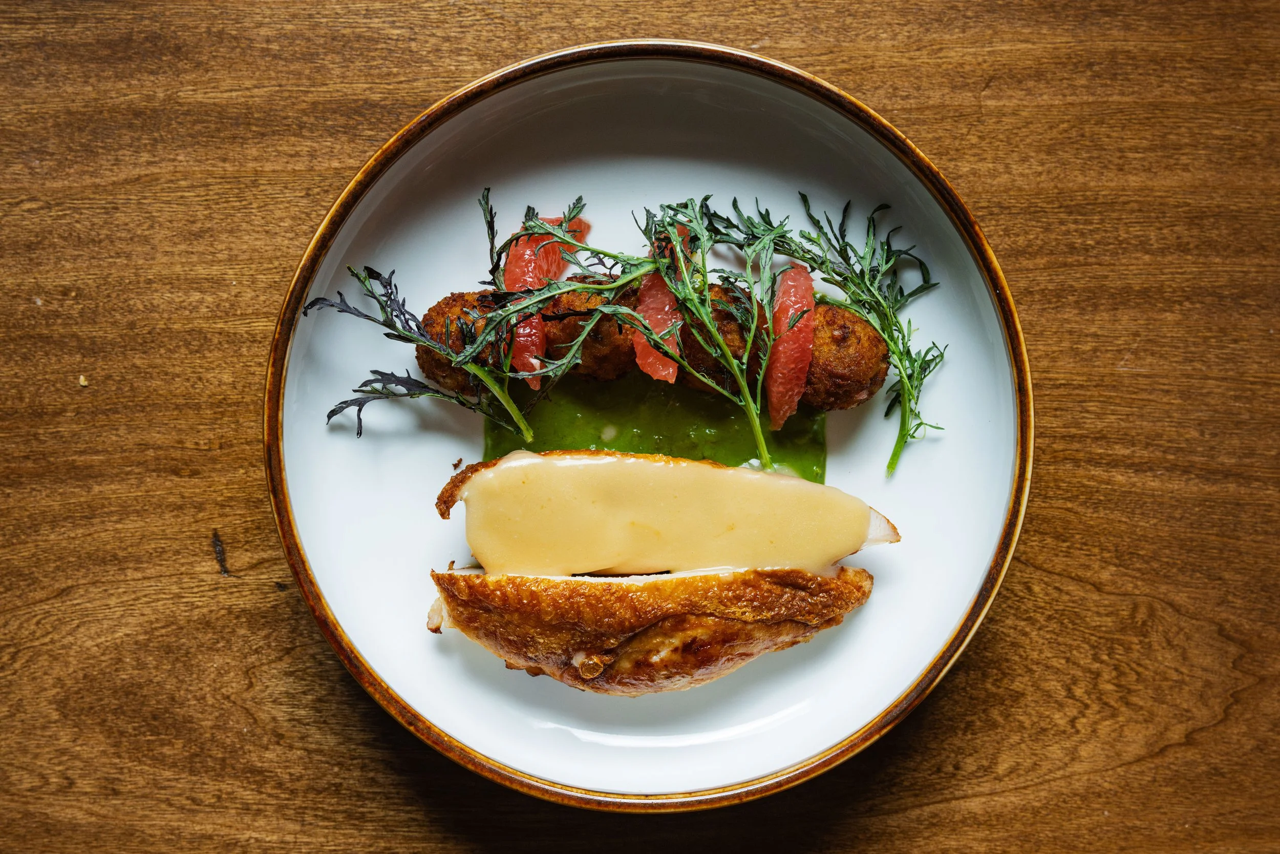 Chicken Breast, Garlic-Miso Mofongo, Buttermilk-Fermented Herb Stem Sauce, Beurre Monté, Grapefruit Supreme, Mustard Greens
