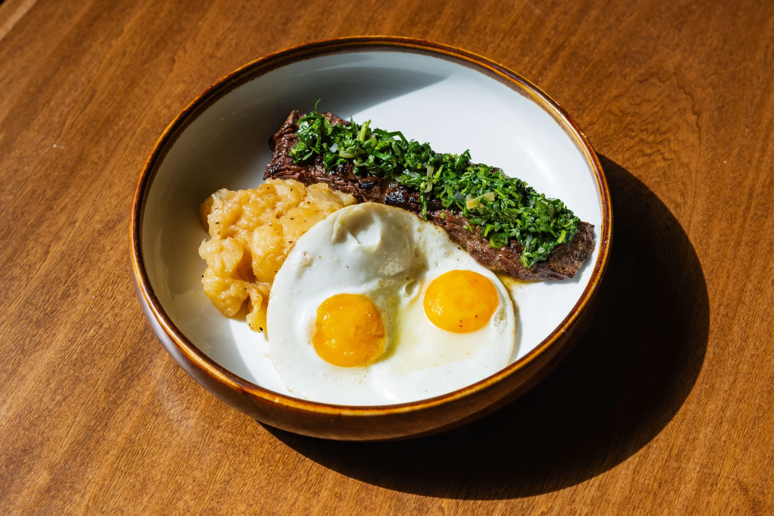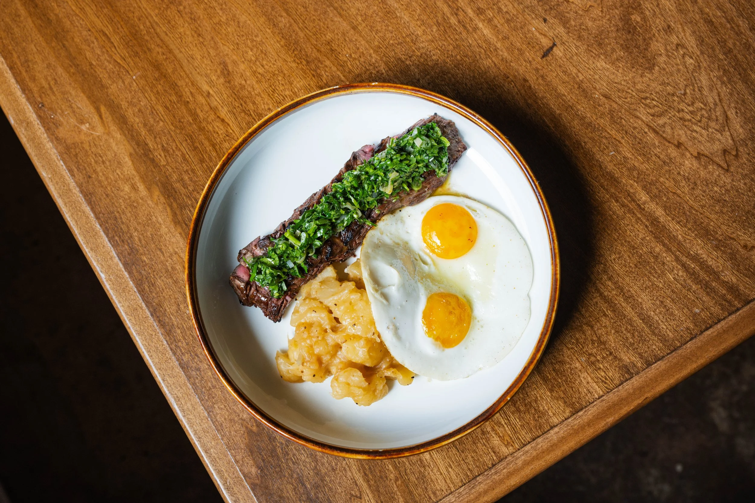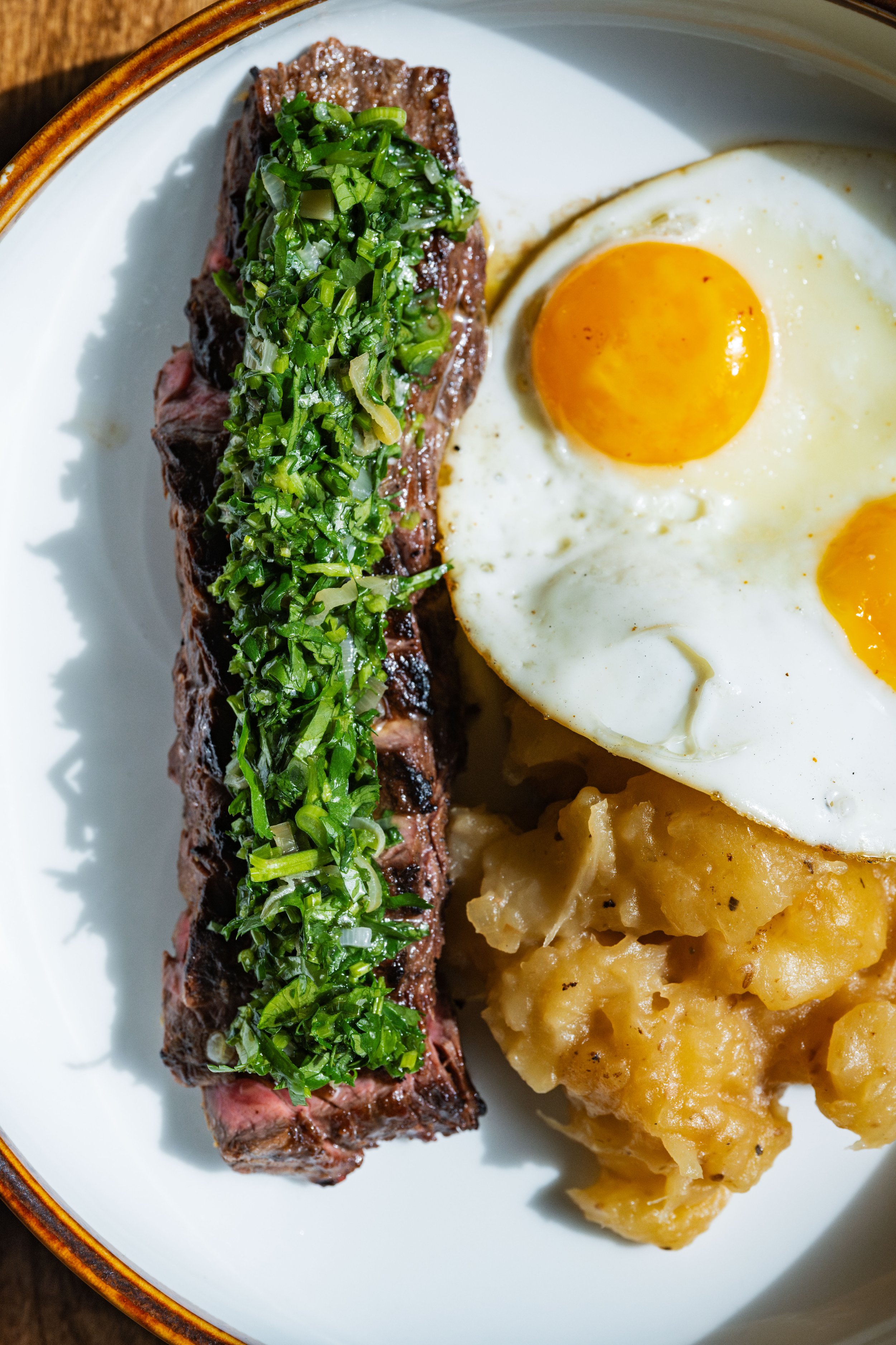 Steak Churrasco, Sunny Side Up Eggs, Yuca Encebollada, Fermented Leek-Mushroom Oil Chimichurri