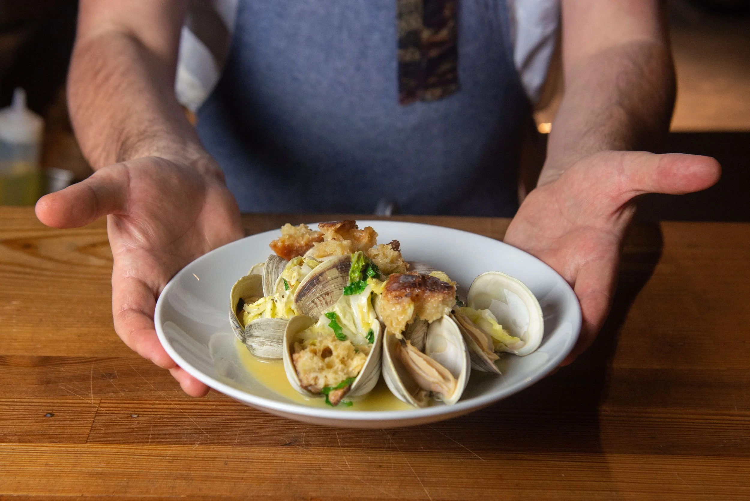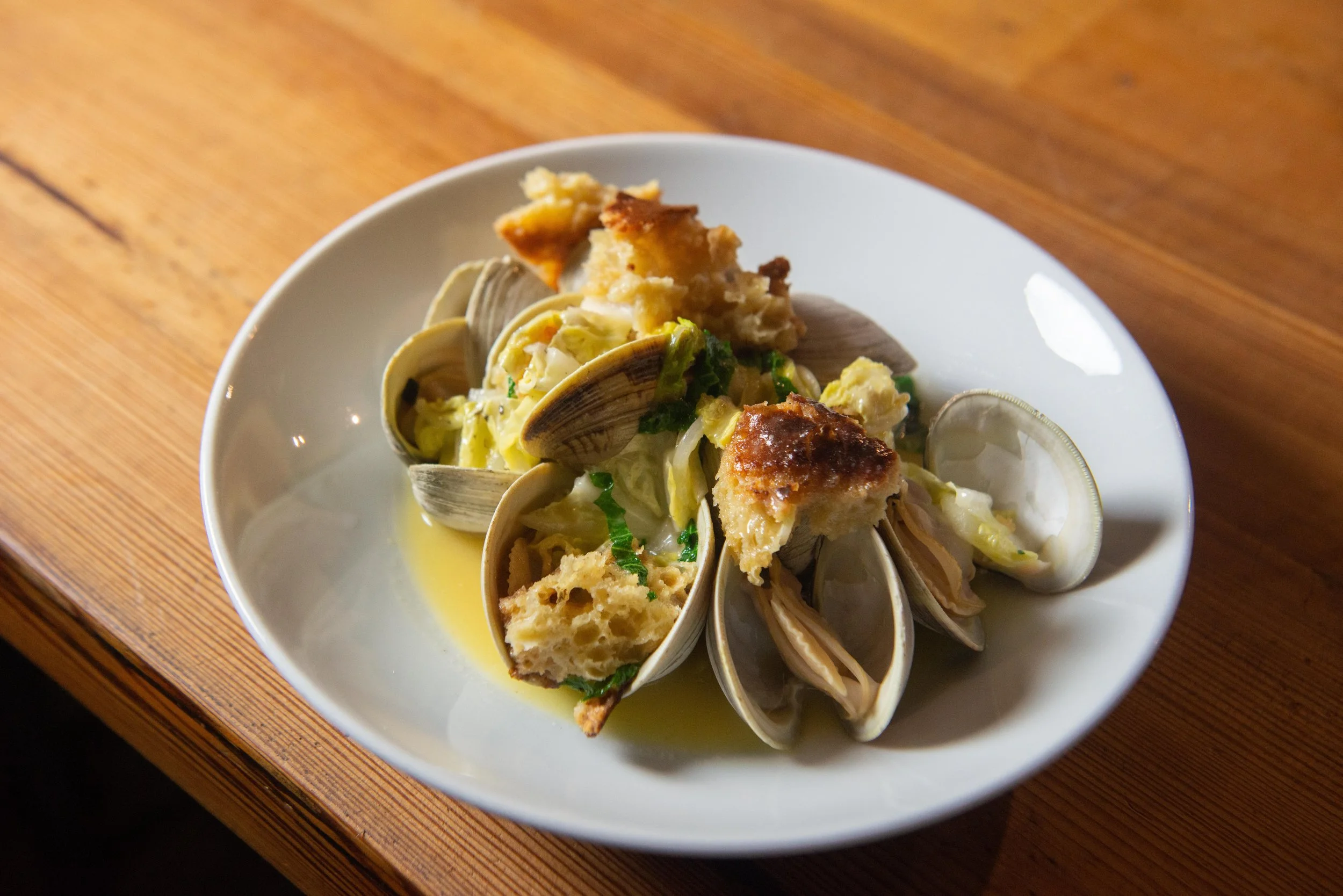 Littleneck Clams, Miso Butter, Napa Cabbage, Shiso, Smoked Focaccia Croutons