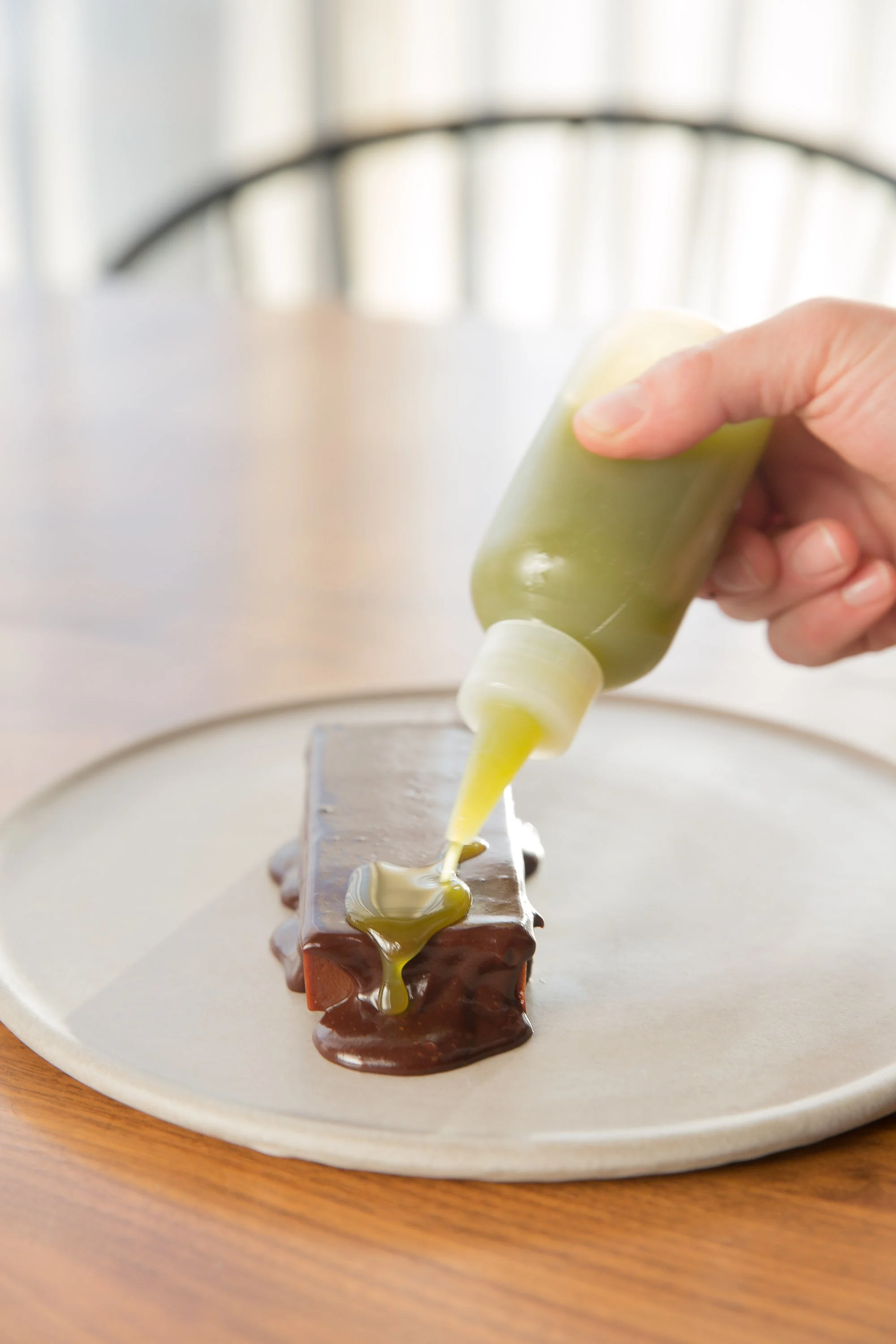 Warm Chocolate, Fig Leaf Oil, and Black Currant Fudge Sauce