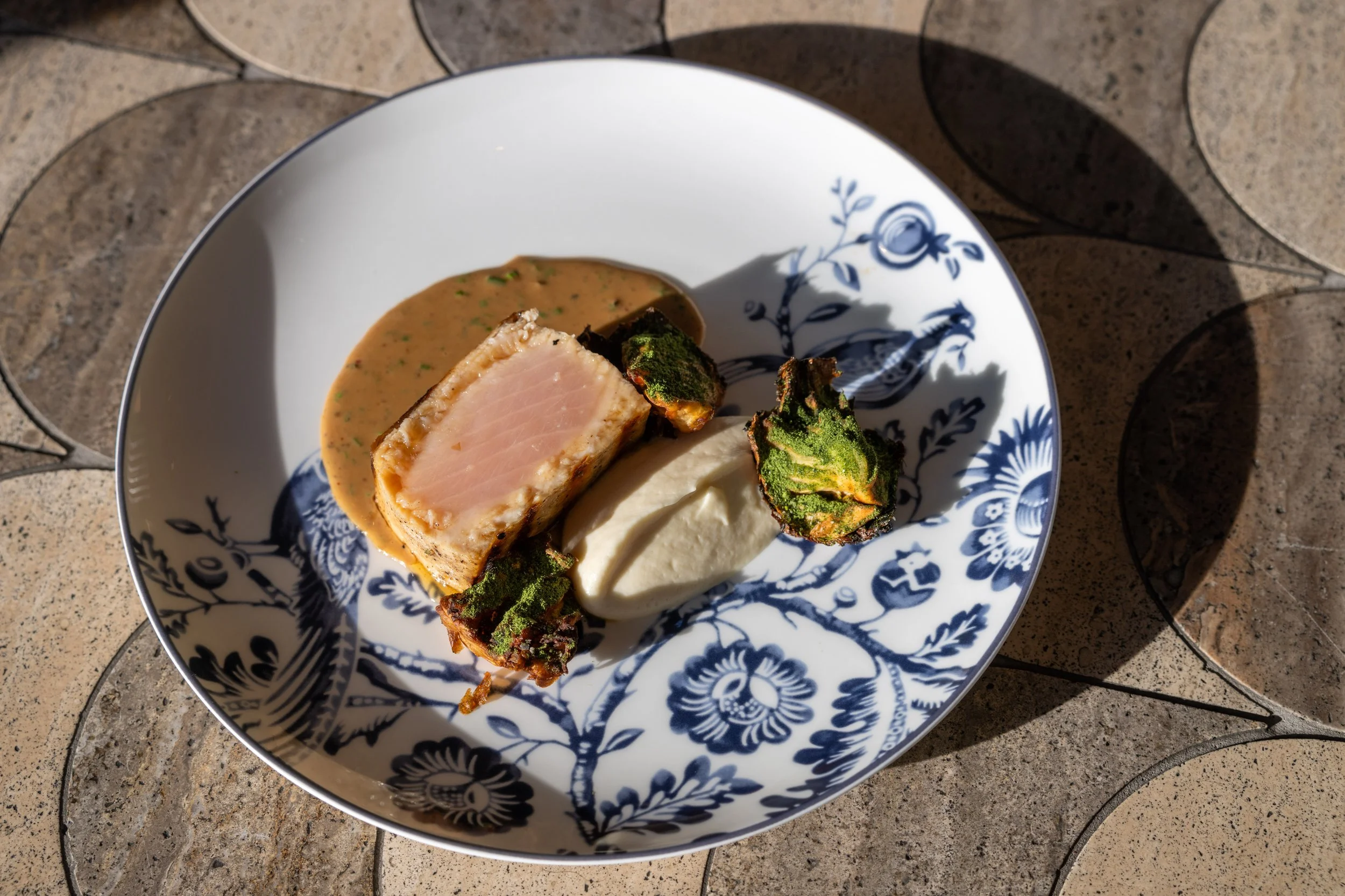 Dry Aged Swordfish, Celery Root Purée, Peppercorn Jus, Fish Sauce Caramel, Togarashi