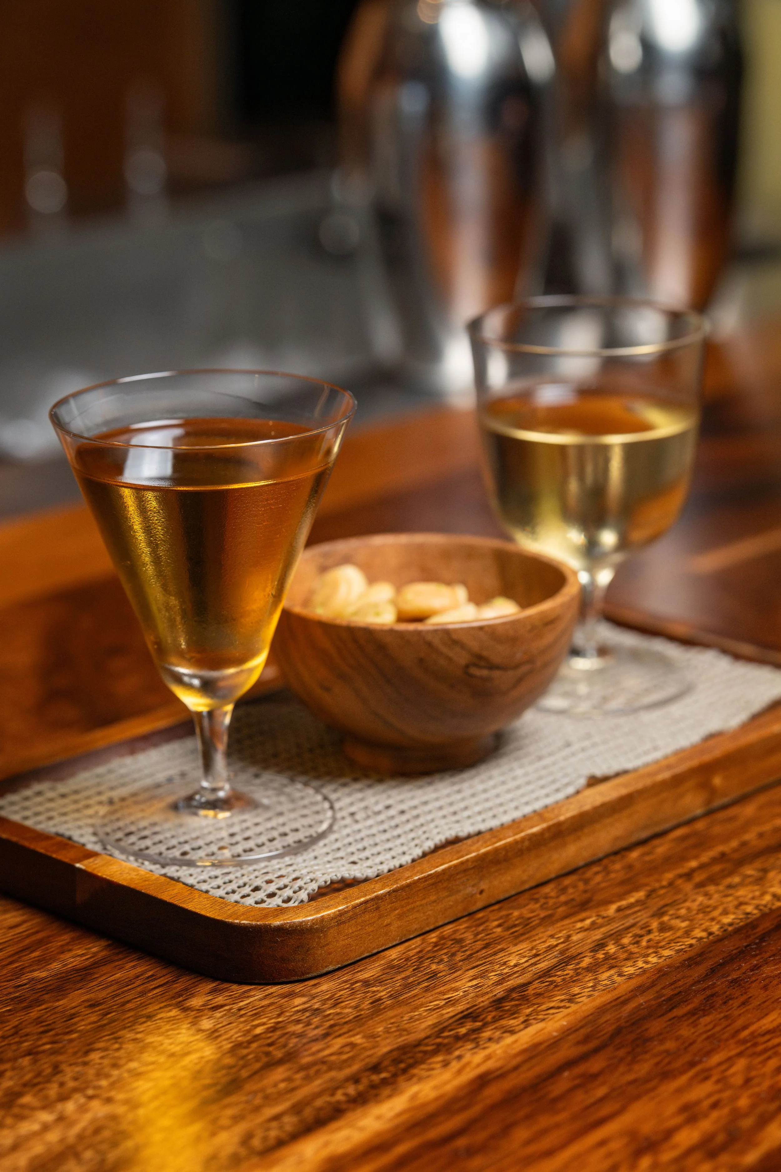 In A Cadillac: (1) Andre: Vodka, Sake, Blanc Vermouth, Shiso Bitters, Lime Leaf Bitters; (2) Big Boy: Gin, Sherry, Blanc Vermouth, Grapefruit Bitters, Pink Peppercorn Bitters; (3) Marcona Almonds with Lime Zest