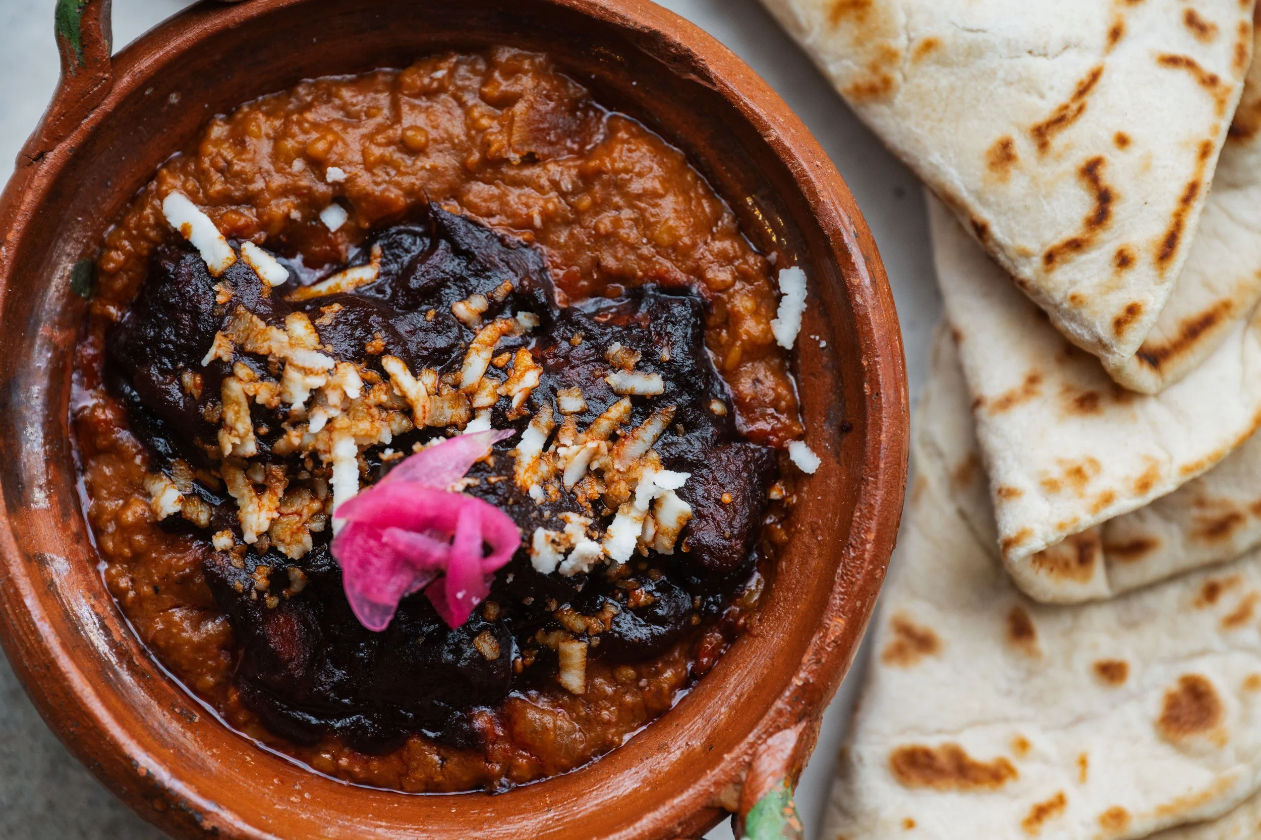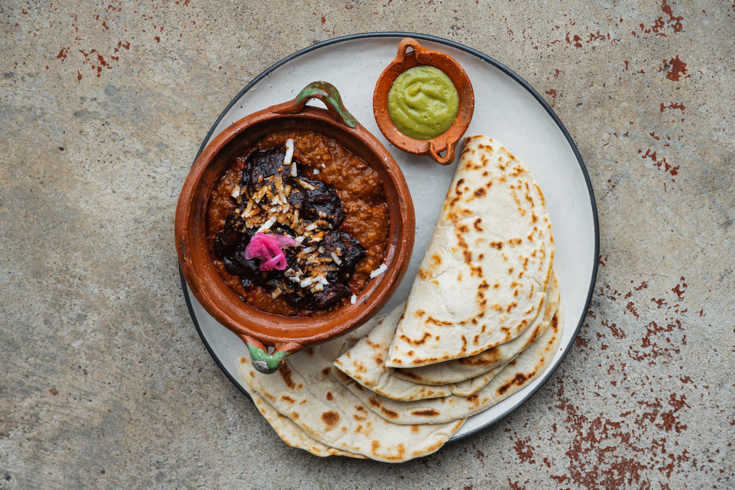 Poison Beans: Adobo Pork Ribs, Chorizo, Refried Beans, Flour Tortillas, Avocado Salsa, Queso Fresco, Pickled Red Onions