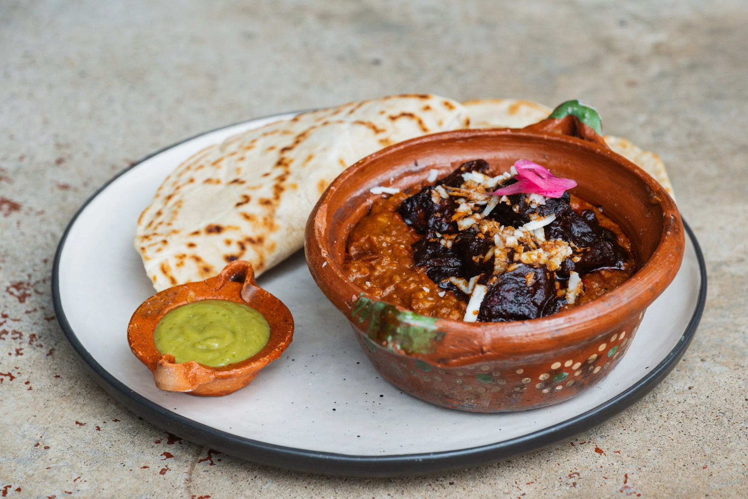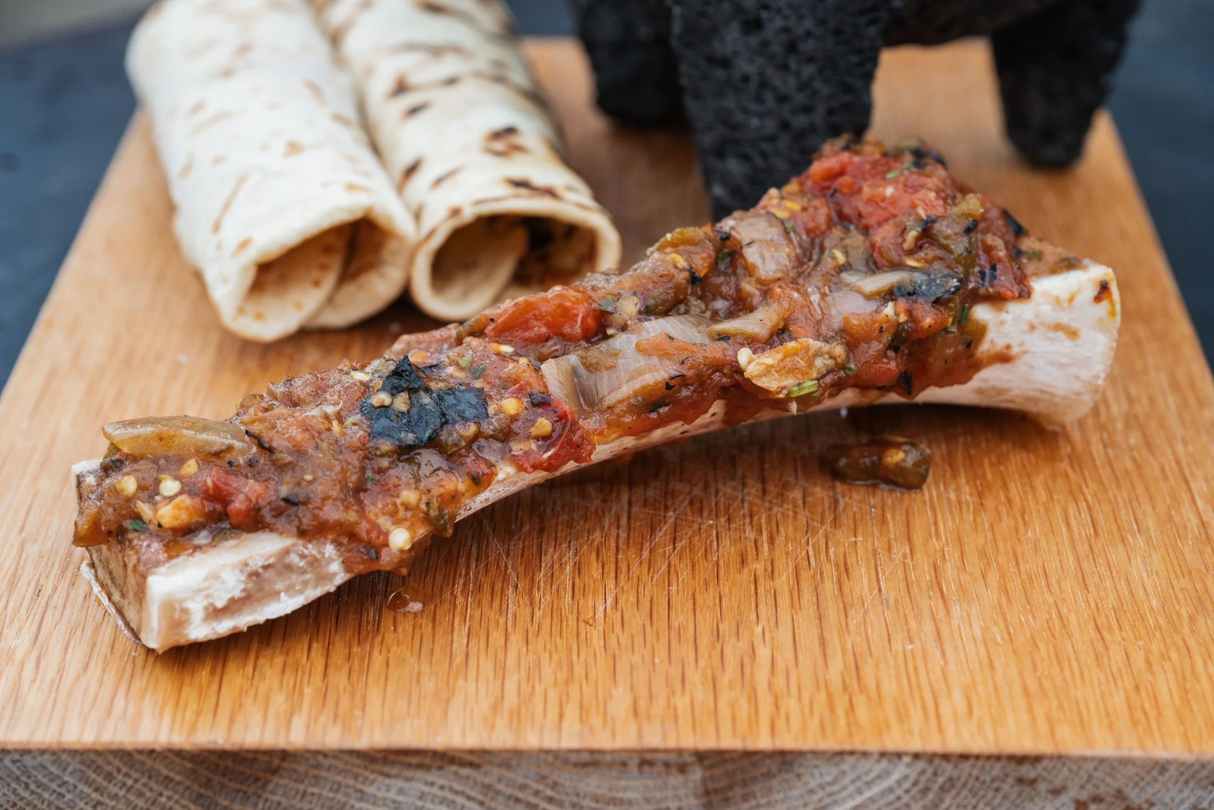 Chicharrón de Ribeye, Bone Marrow, Salsa Tatemada, Pico de Gallo, Guacamole, Flour Tortilla