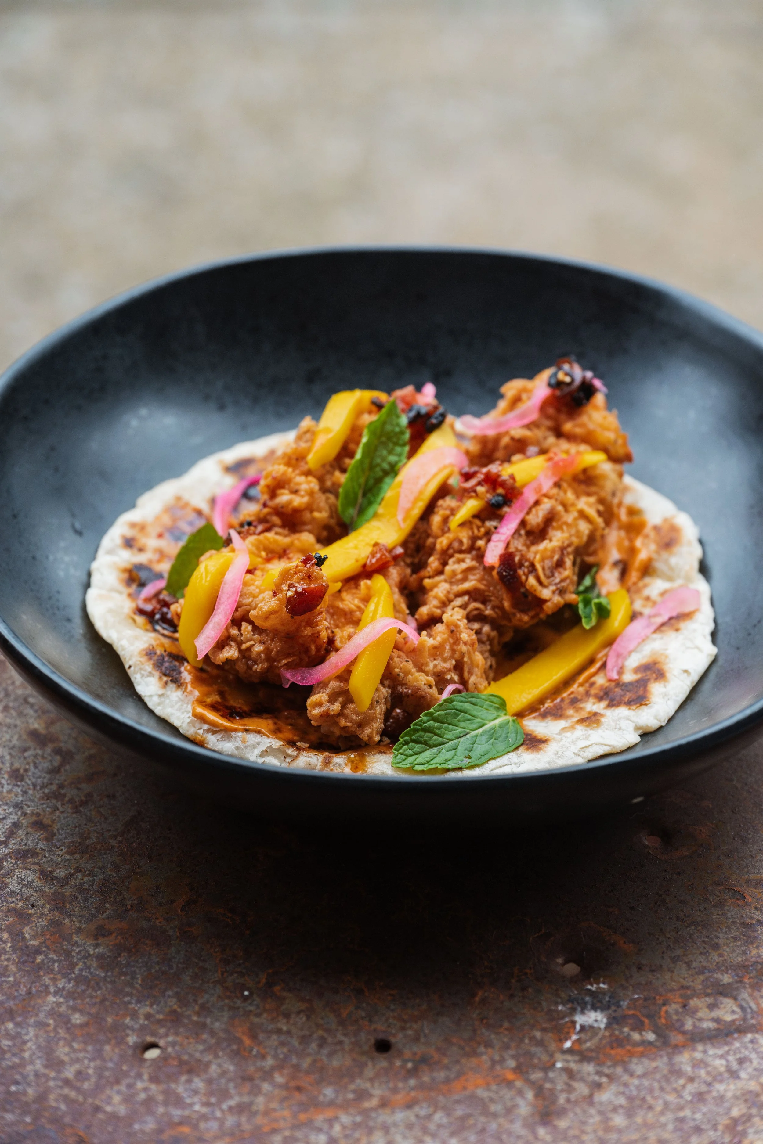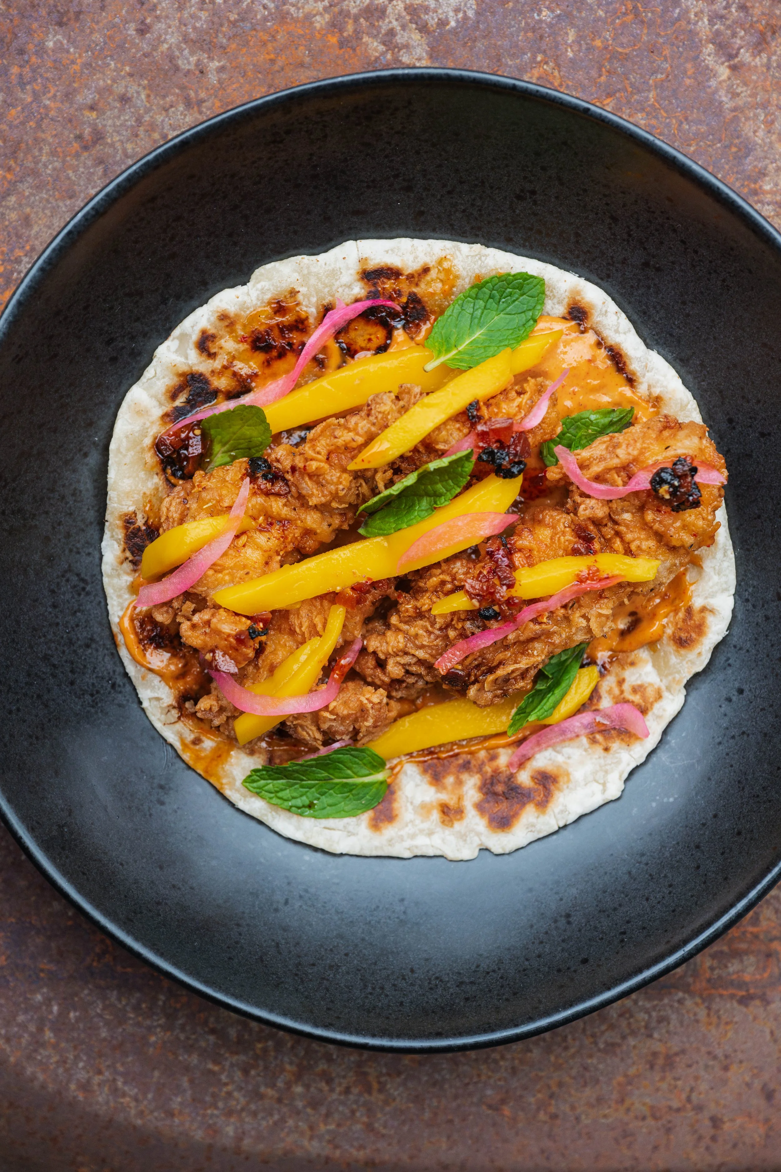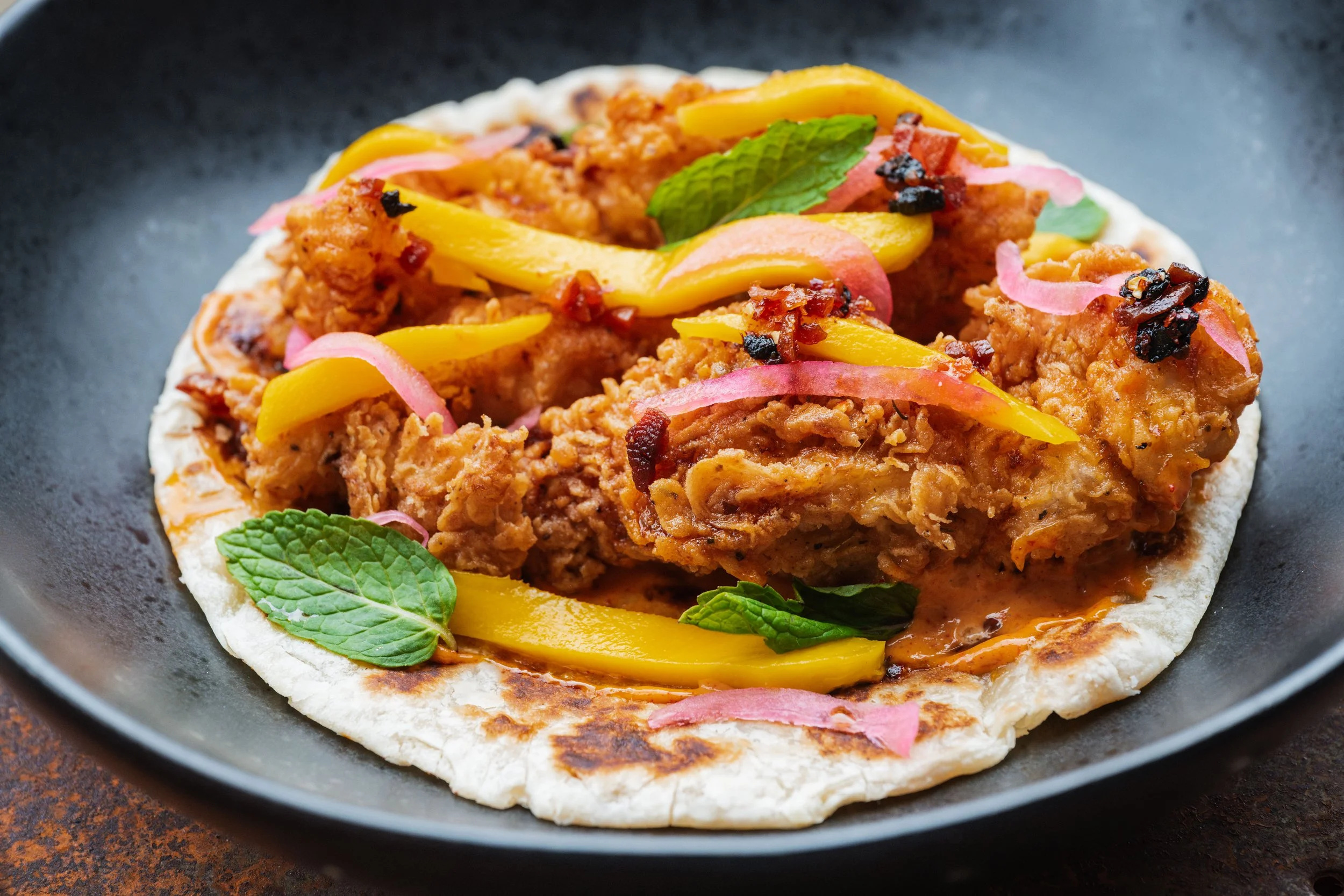 Hawt Gurl Roti: Fried Chicken, Red Curry Aioli, Mango, Pickled Red Onions, Salsa Macha, Mint, Paratha