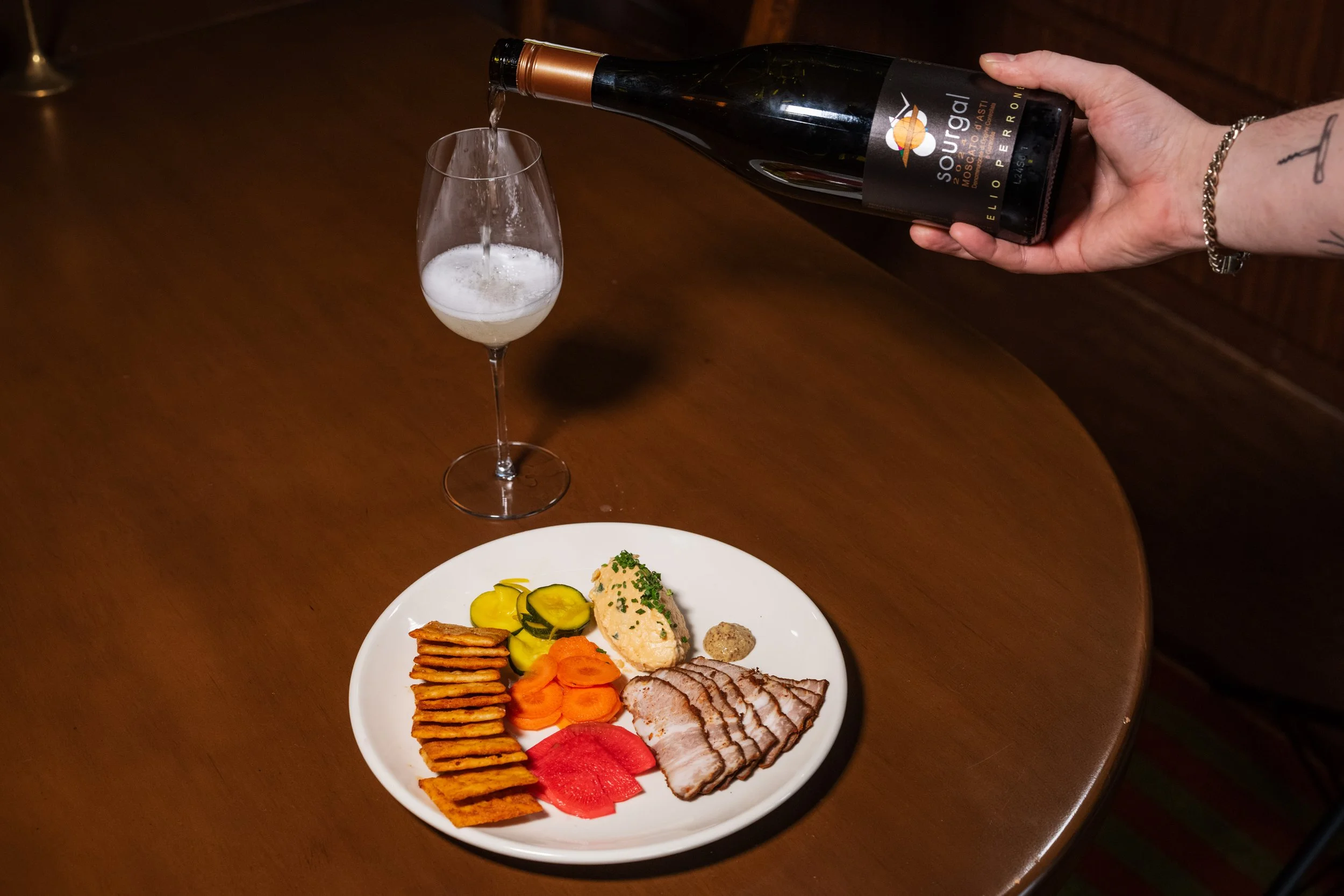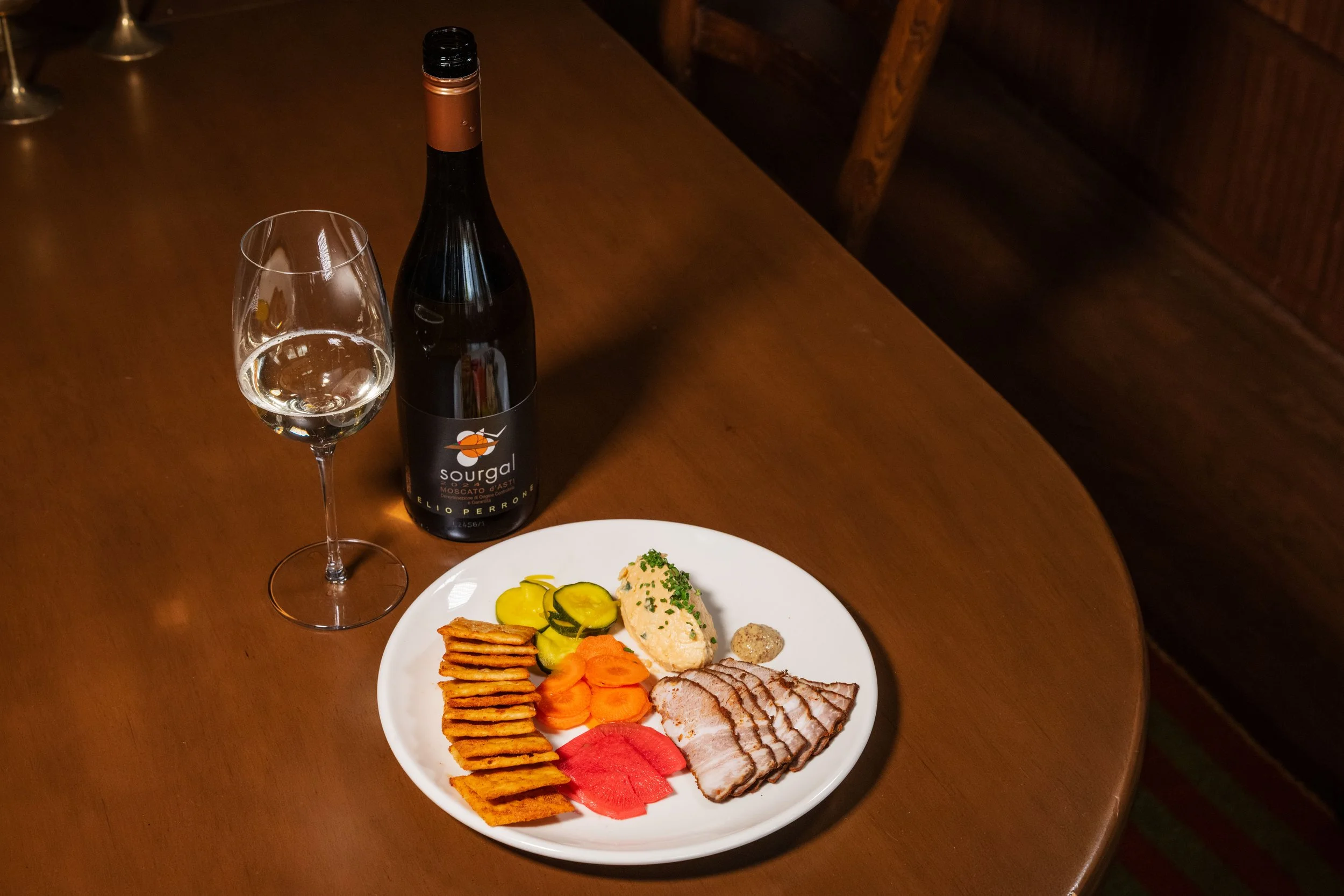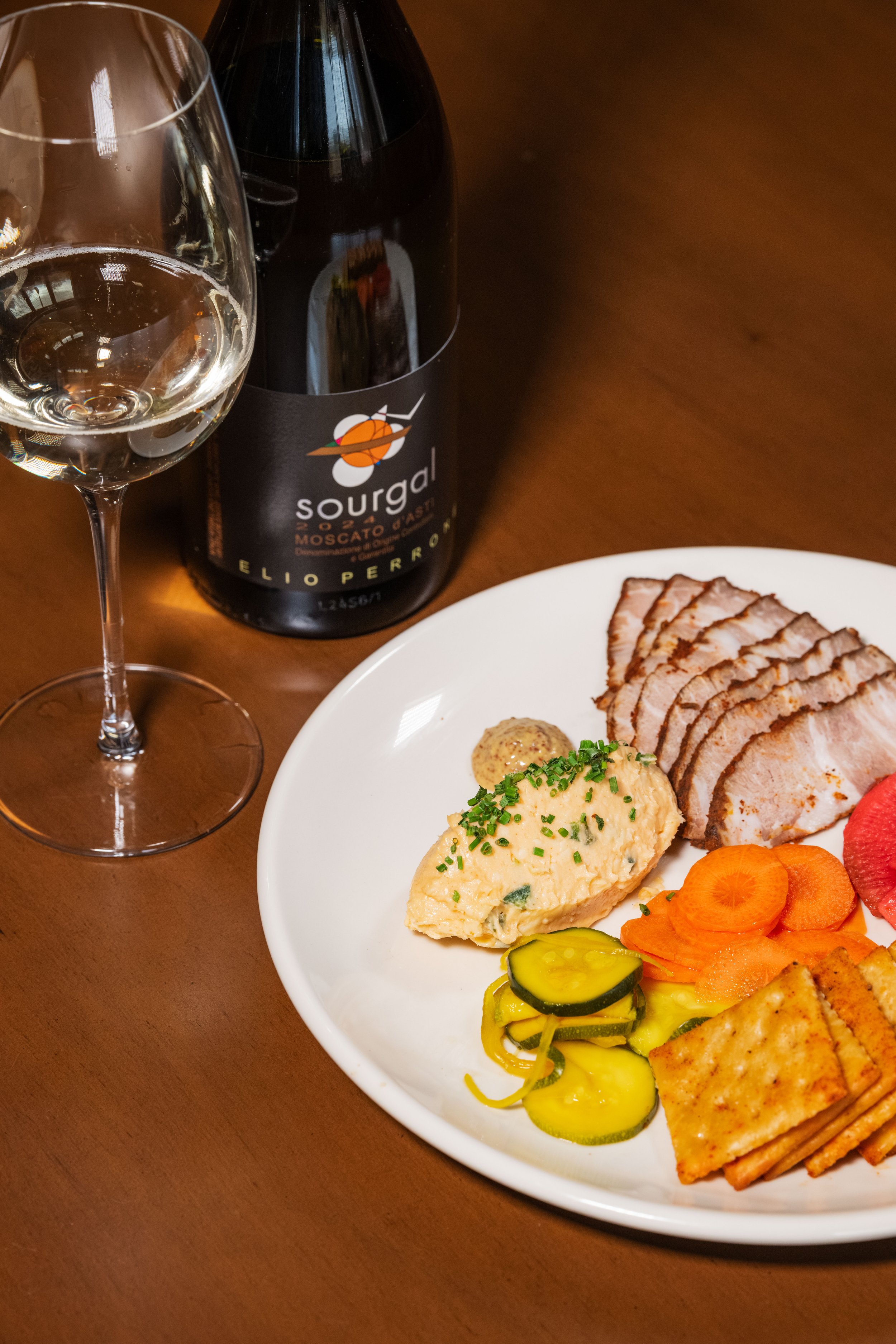 Tasso Ham, Pimento Cheese, Pickled Vegetables, Mustard, Chives, Fried Saltines paired with Muscat, Elio Perron, Sourgal, Moscato d'Asti, Piedmont, Italy, 2024