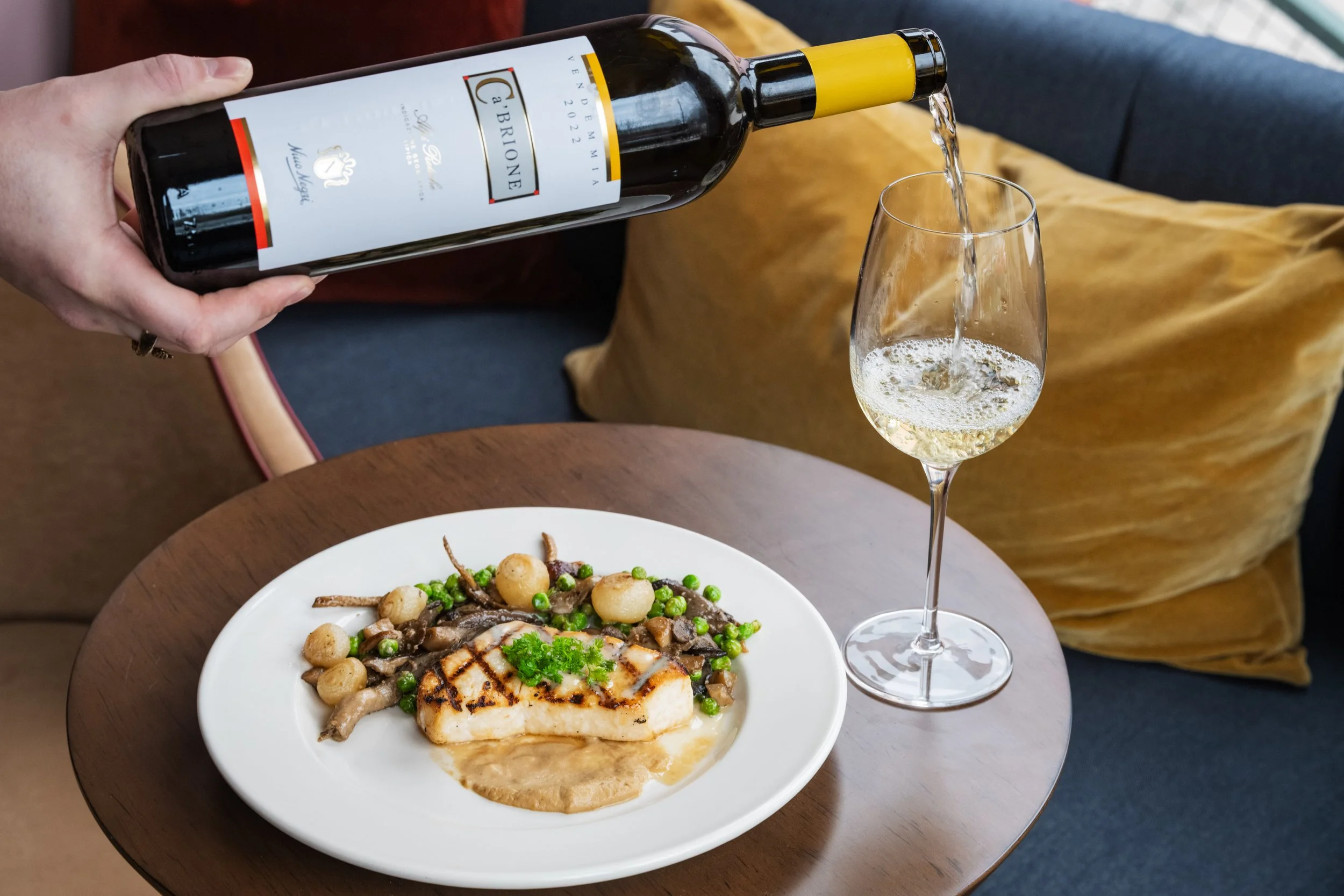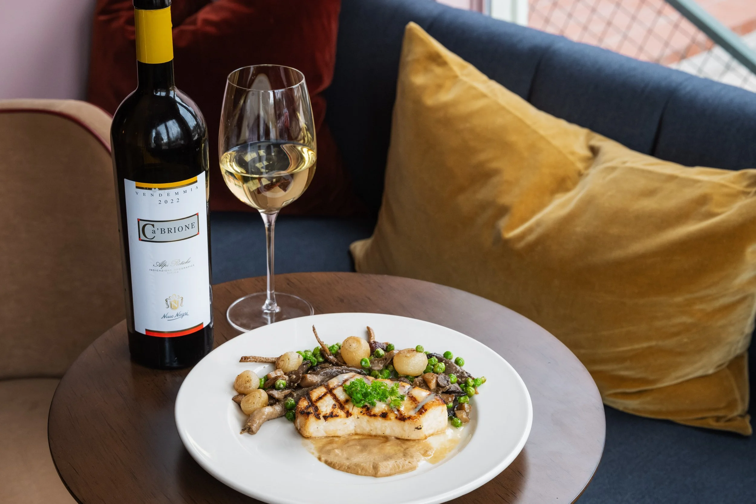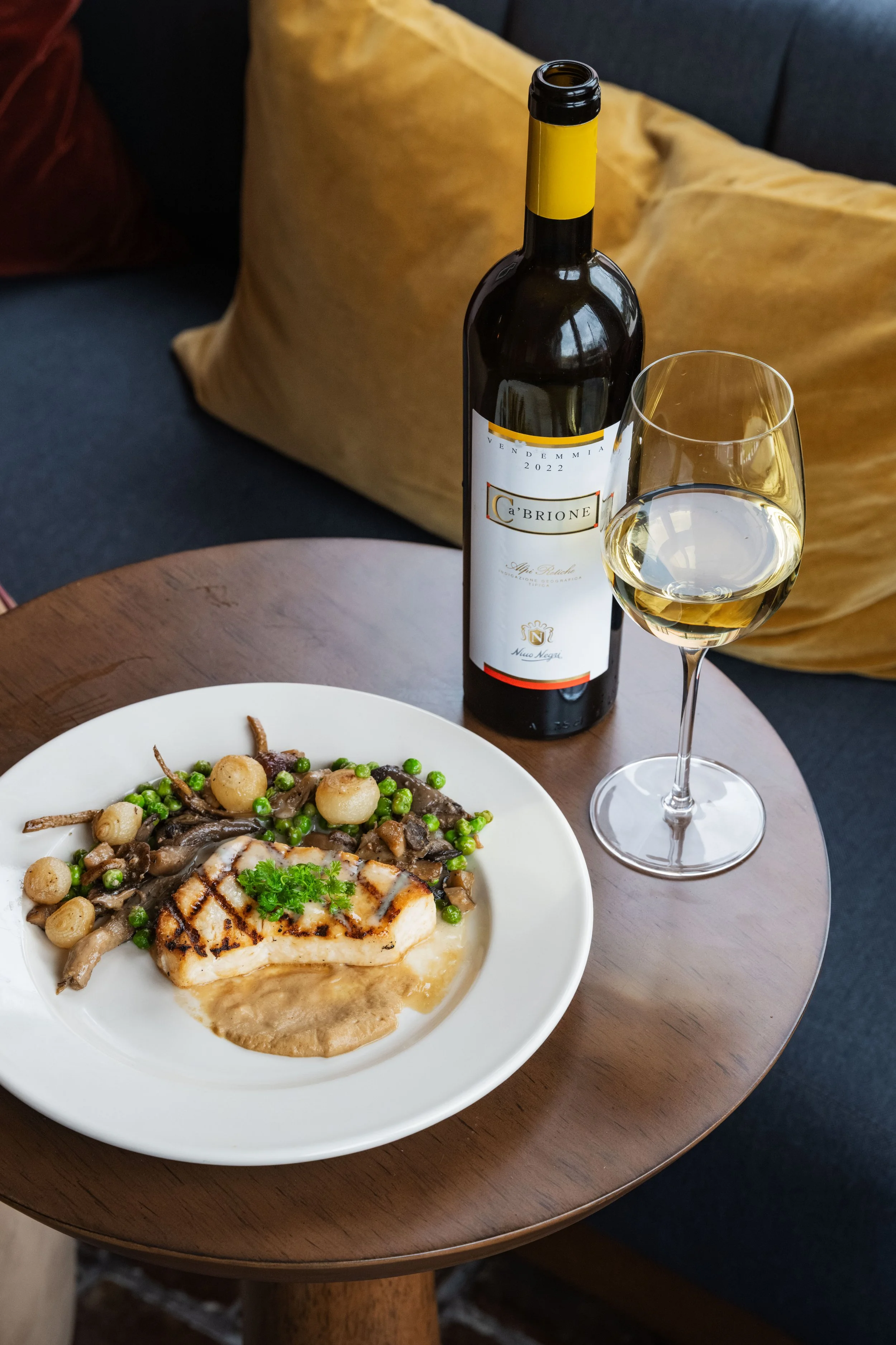 Grilled Swordfish, Fumé Beurre Blanc, Caramelized Fennel Purée, Mushrooms, Pearl Onions, English Peas, Parsley paired with Chardonnay/Nebbiolo/Sauvignon Blanc, Nino Negri, Ca’Brione, Lombardy, Italy, 2022