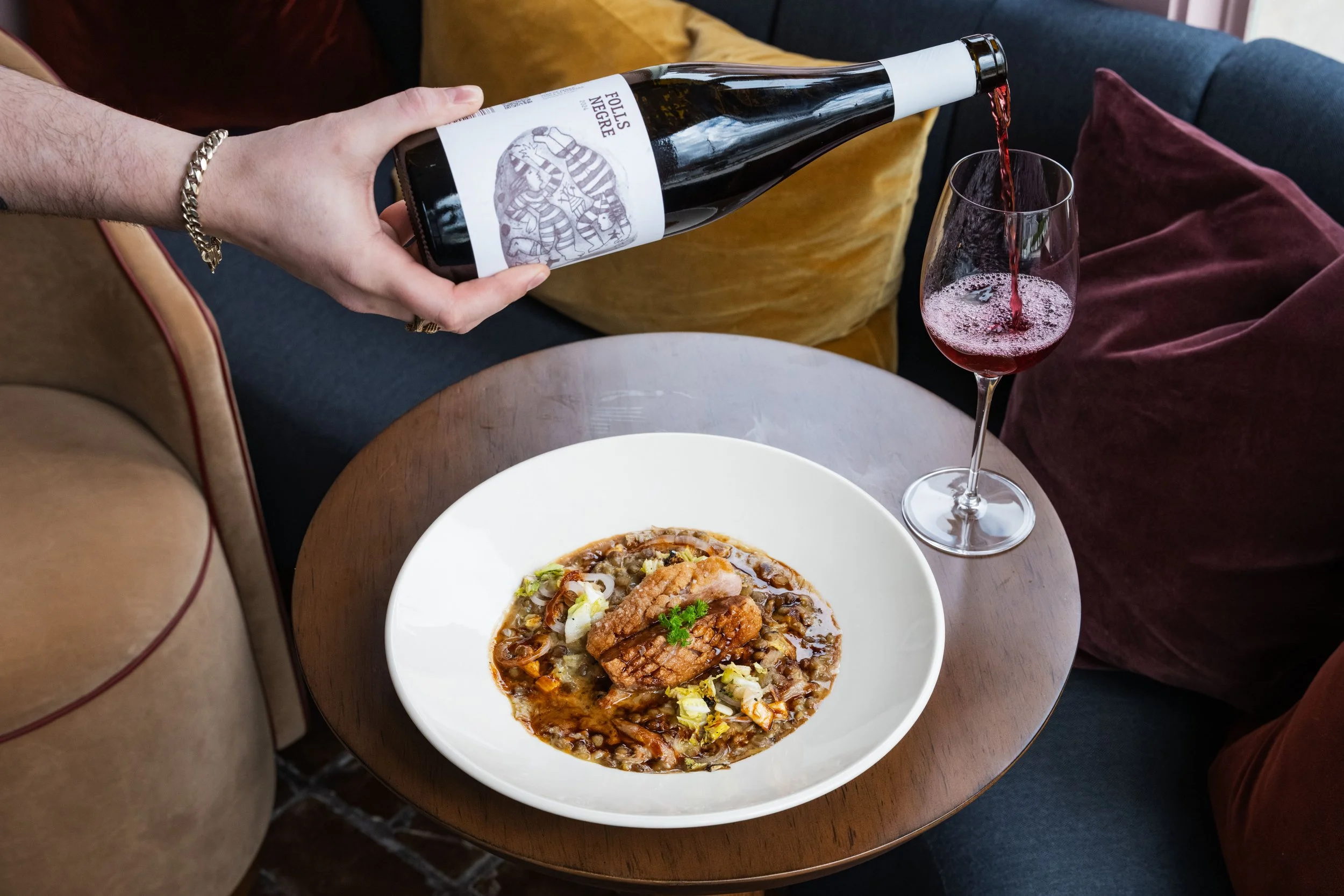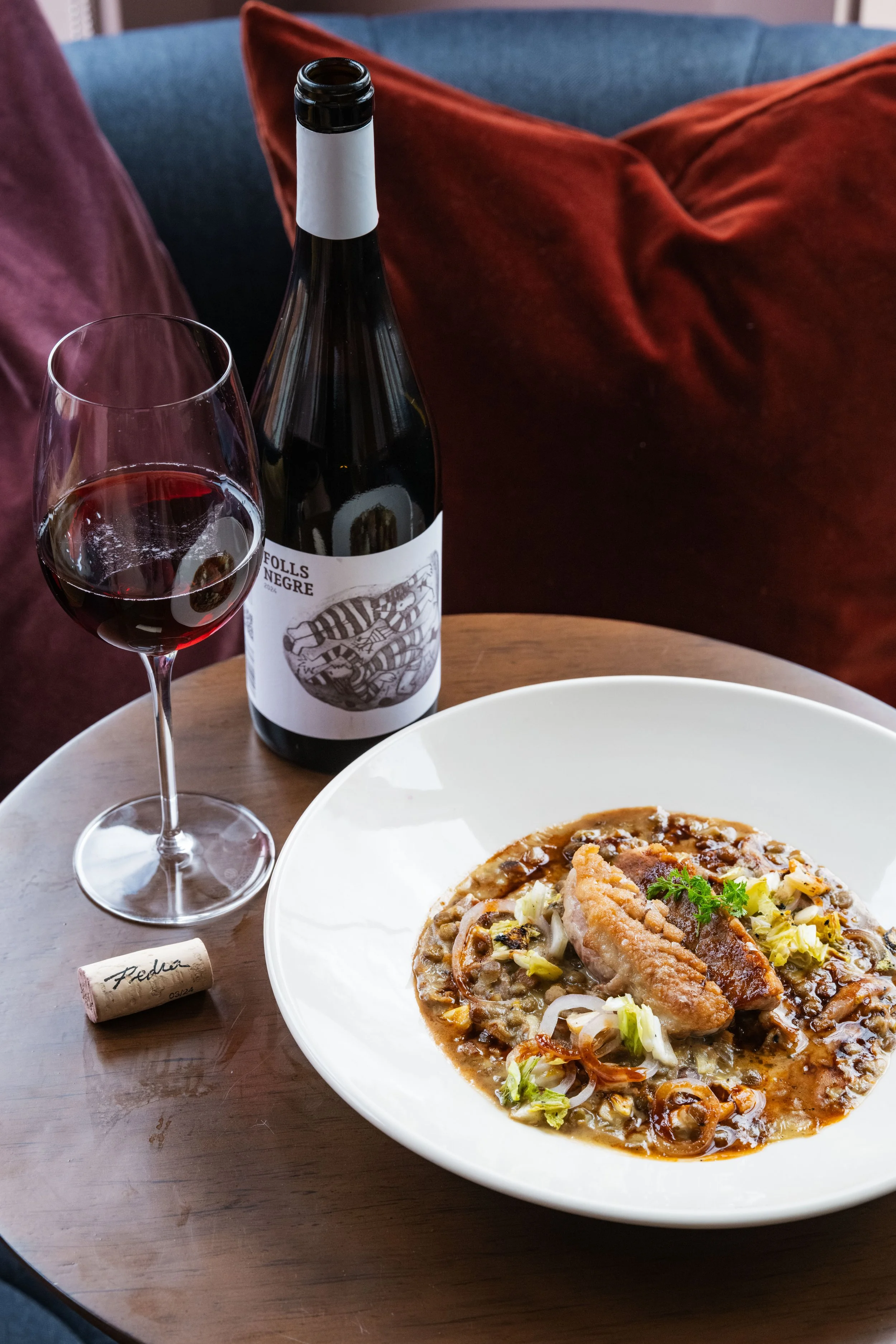 Duck Breast, Confit Duck Leg, Green Lentil Ragoût, Bacon, Cabbage, Bordelaise Sauce, Crème Fraîche paired with Garnacha, Vins De Pedra, Negre De Folls, Catalonia, Spain, 2024