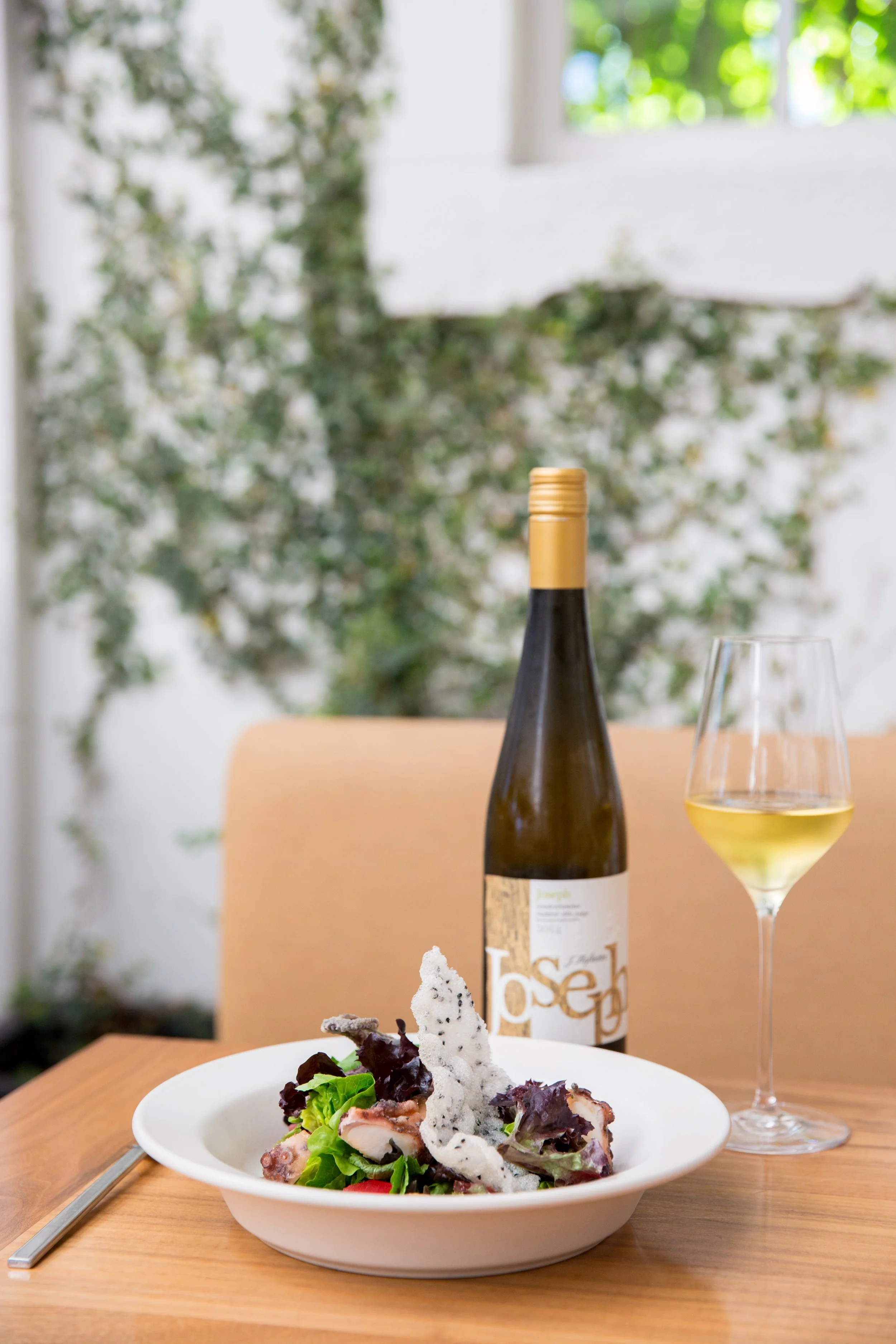Vietnamese Octopus Salad: Rice Flour-braised Octopus, Market Citrus, Sesame Chip, Yellow Watermelon, Shiso, Opal Basil, and Nước Mắm Chấm paired with Gewurztraminer, Joseph, J. Hofstatter, Alto Adige, Italy, 2014
