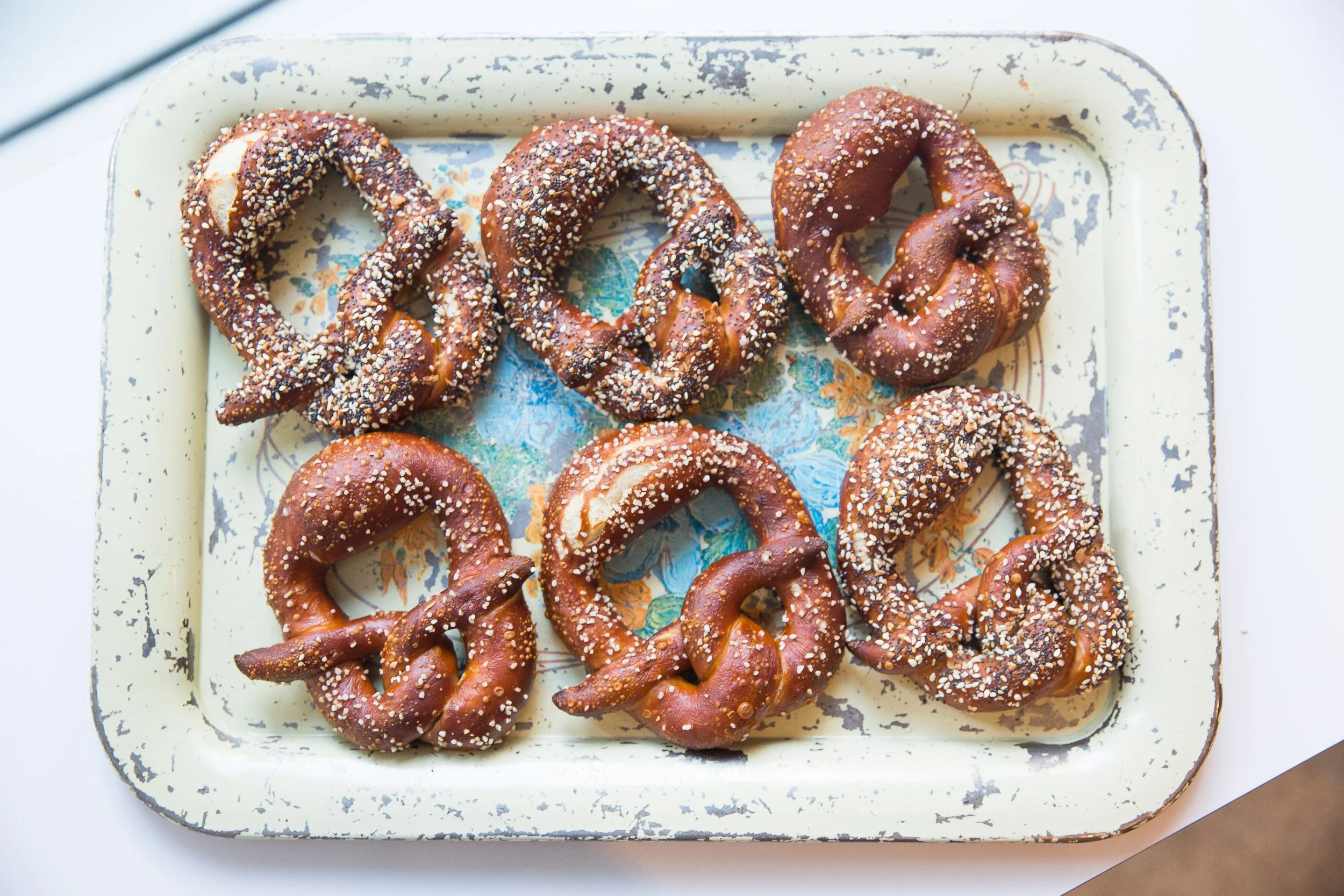 Salted and Everything Pretzels with House Beer Cheese, Hot Giardiniera Relish, and Grainy Mustard