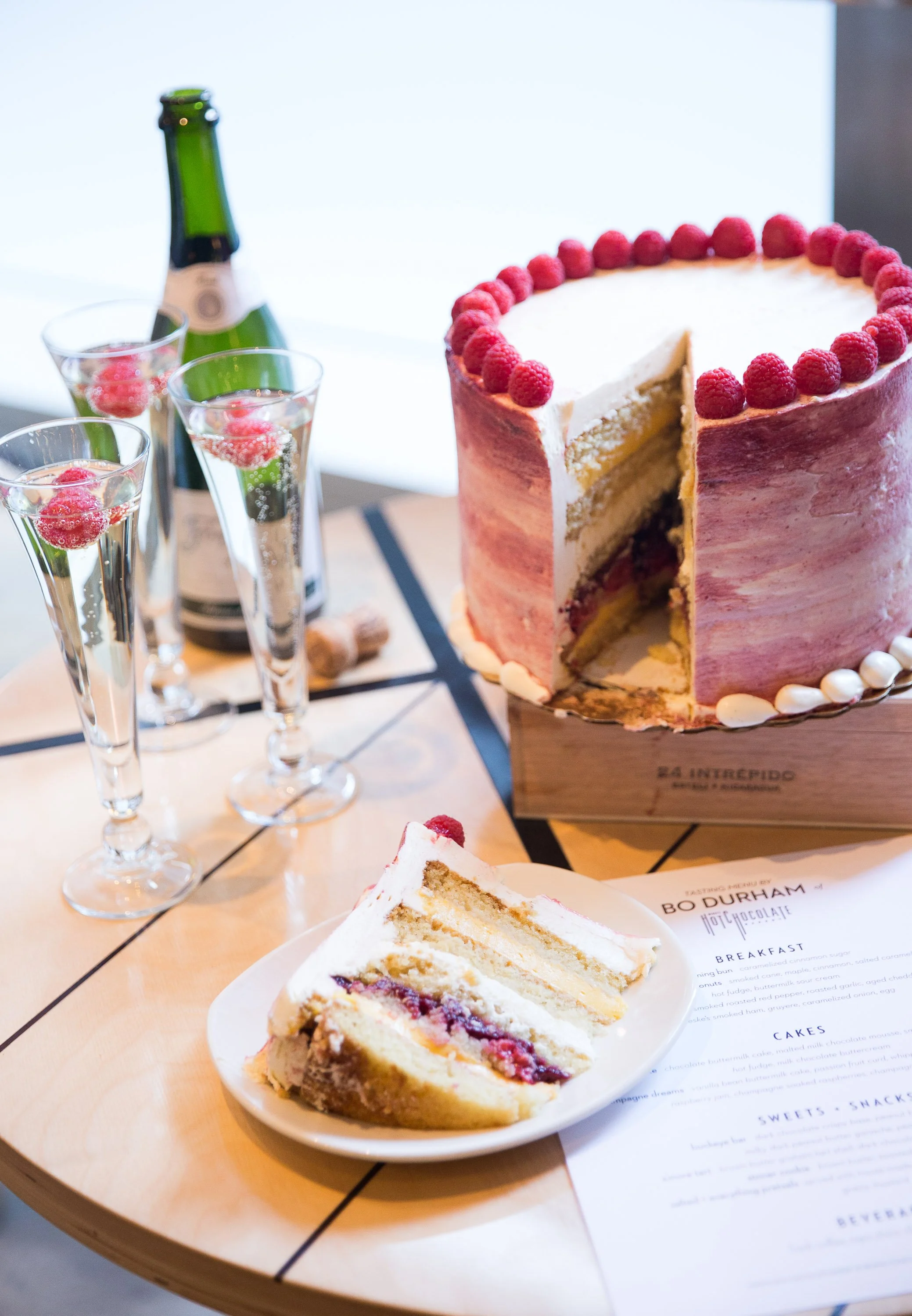 Champagne Dreams Cake: Vanilla Bean Buttermilk Cake, Passion Fruit Curd, Whipped White Chocolate Ganache, Raspberry Jam, Champagne Soaked Raspberries, and Champagne Buttercream