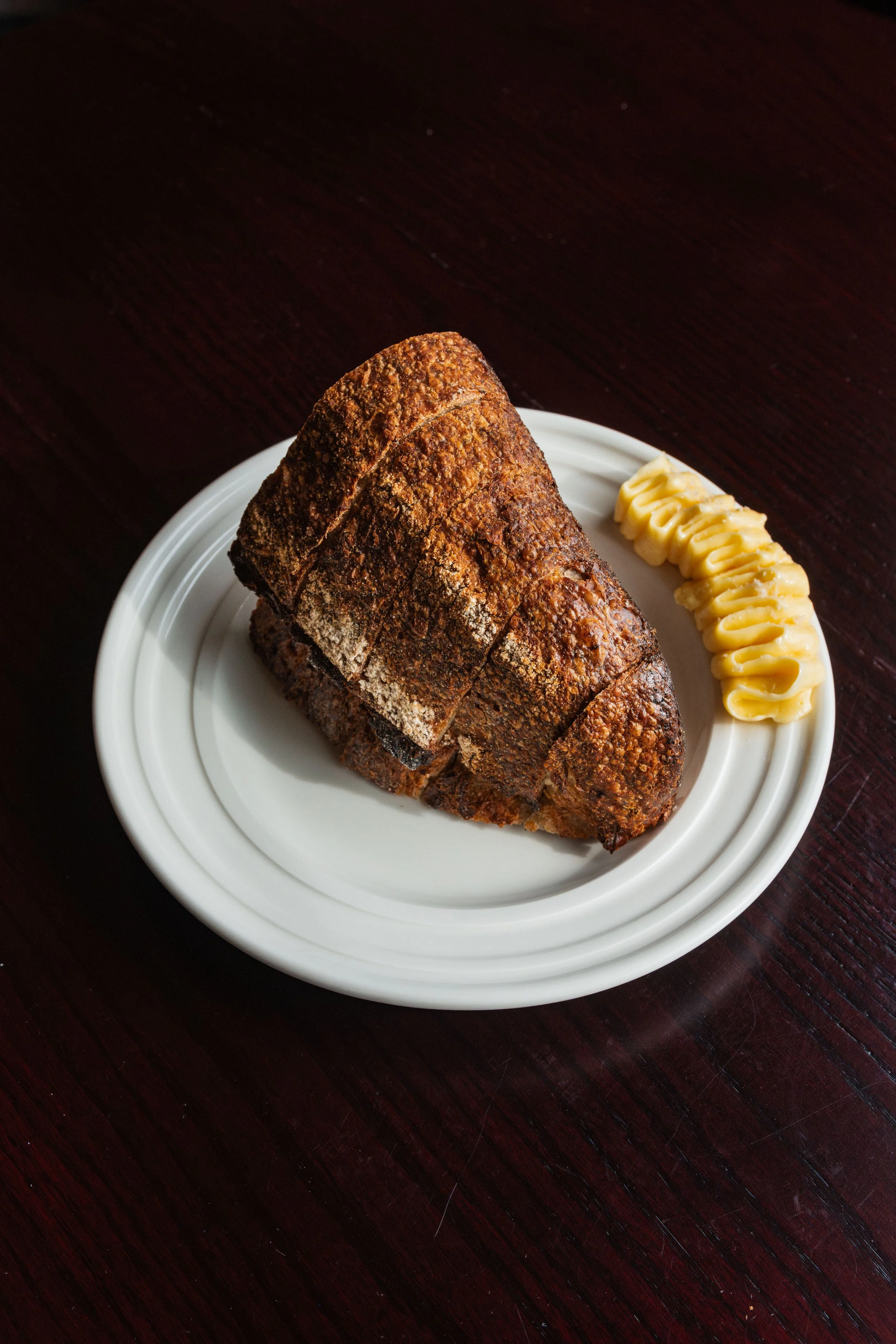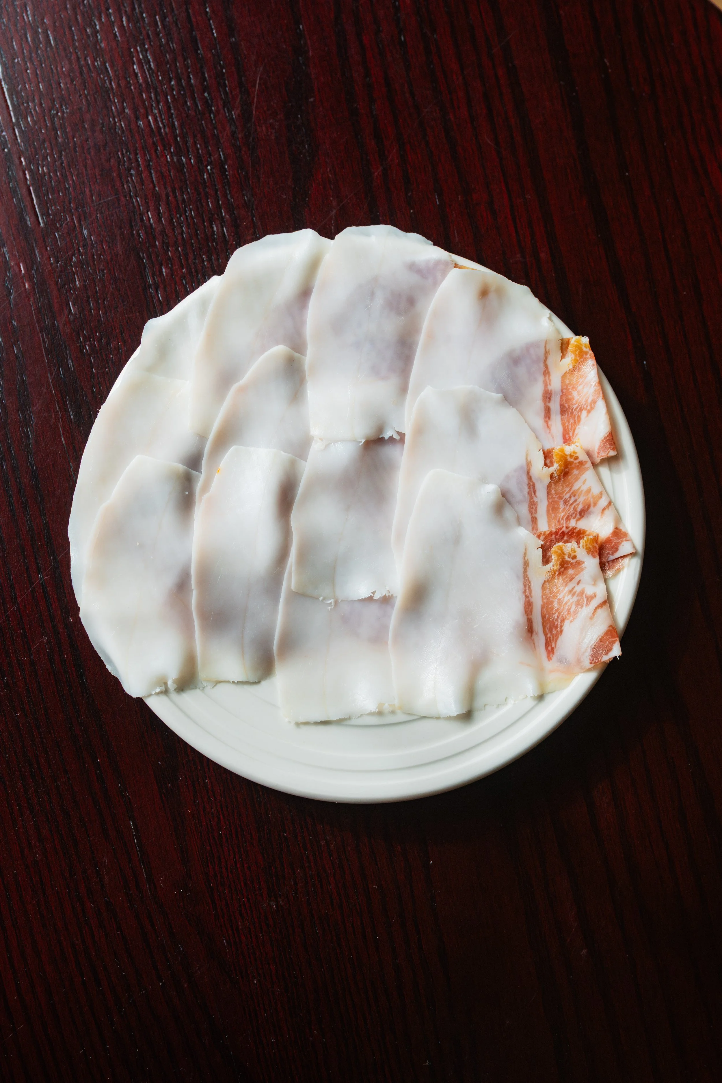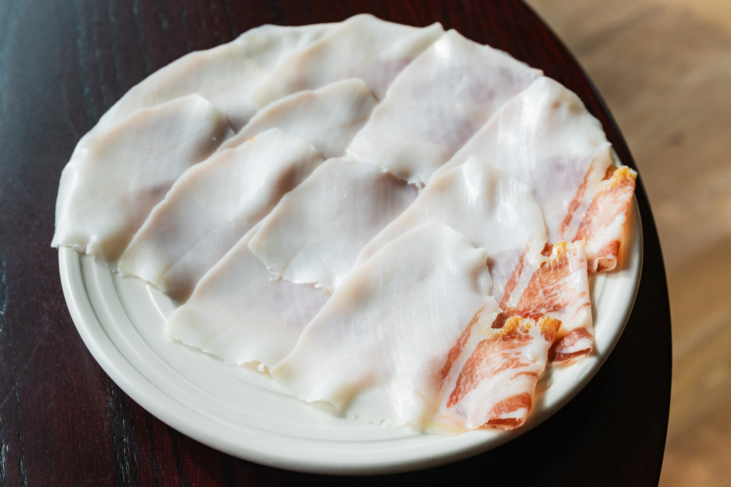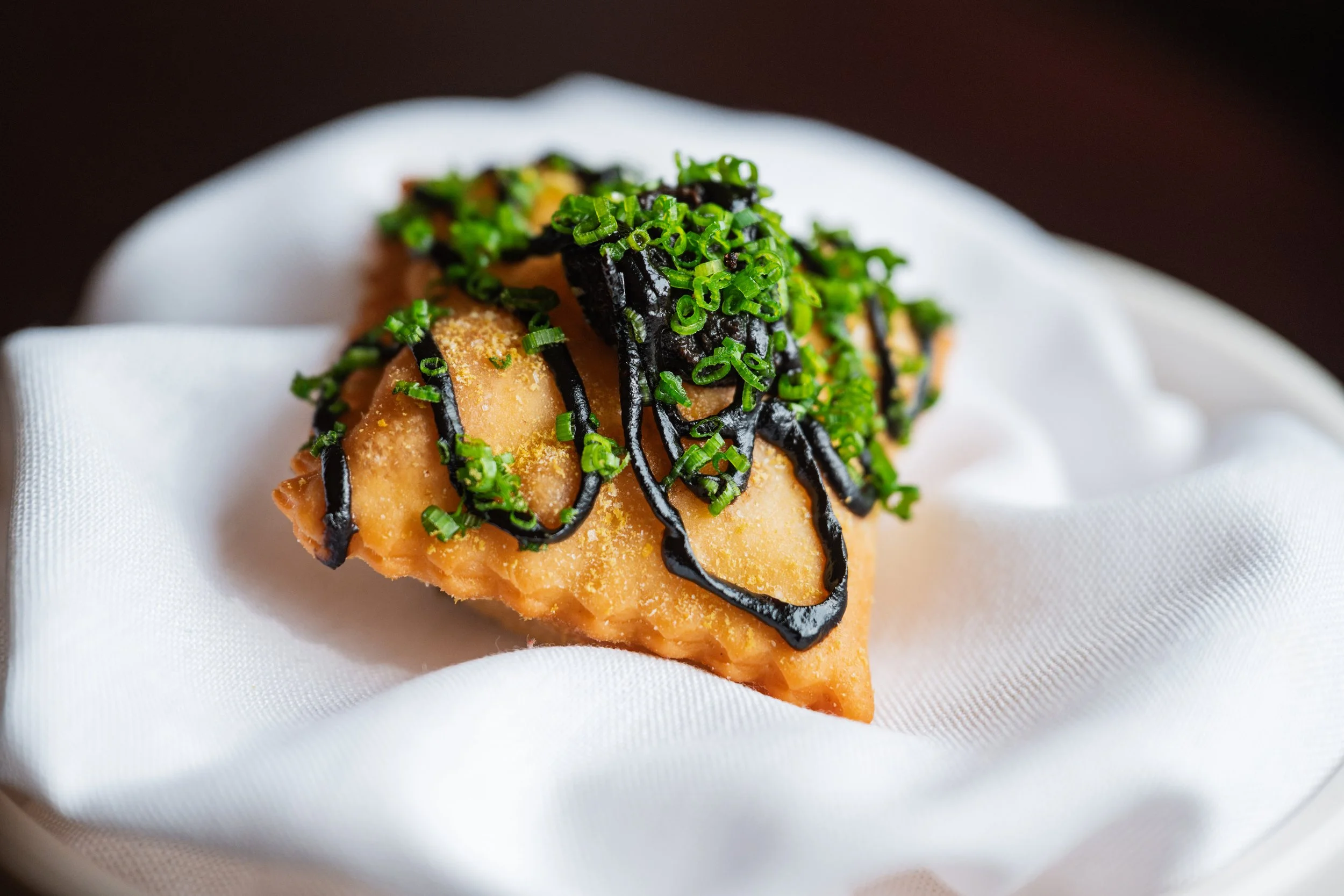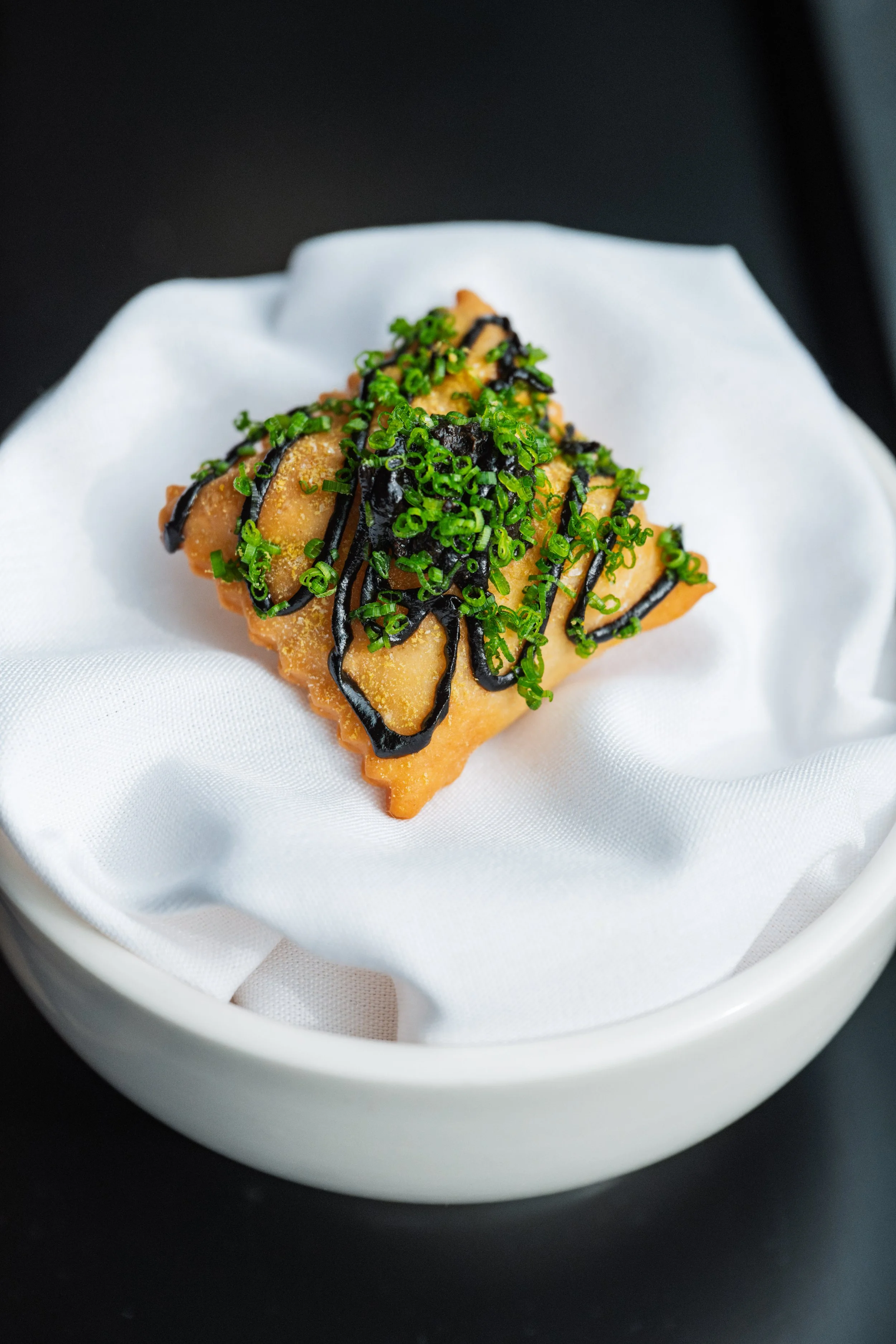 Celeriac-Black Truffle Barbajuan, Black Trumpet Mushrooms, Black Trumpet Condiment, Nutritional Yeast, Chives